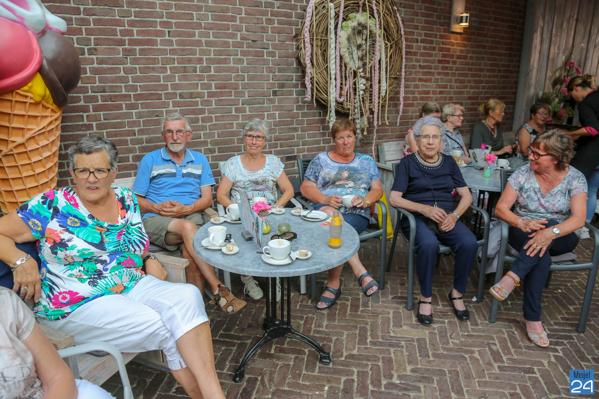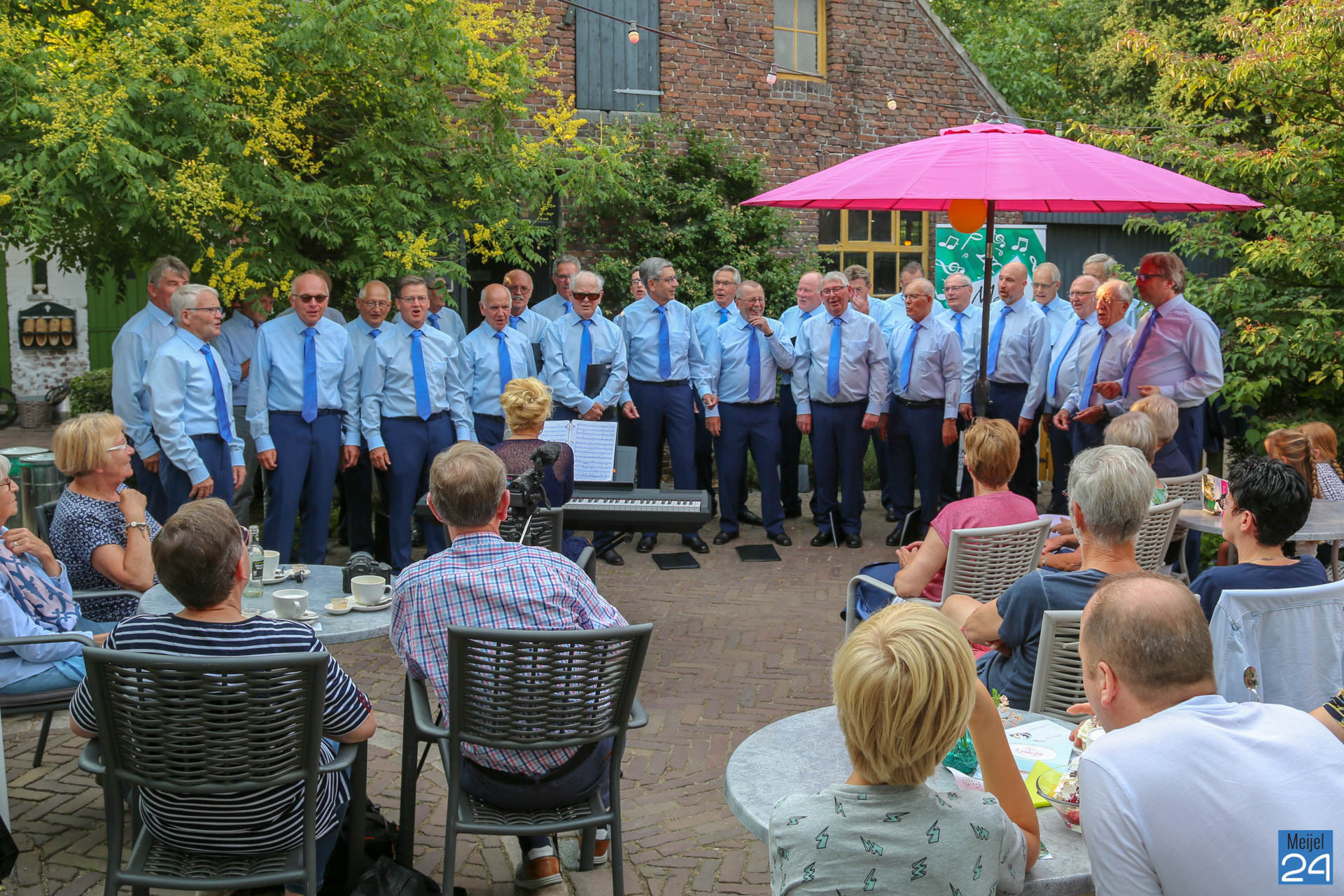 Het koor bracht aldaar een luchtig programma ten gehore, begeleidt en gedirigeerd door Sylvia Berghs. Het was een mooie gelegenheid om kennis te maken met mannenkoormuziek en te beleven hoe gezond zingen kan zijn. Het ruim 40 jarig Meijels mannenkoor presenteerde zich in nieuwe outfit en gaat na de zomervakantie zich voorbereiden op een concertreis naar Luxemburg.