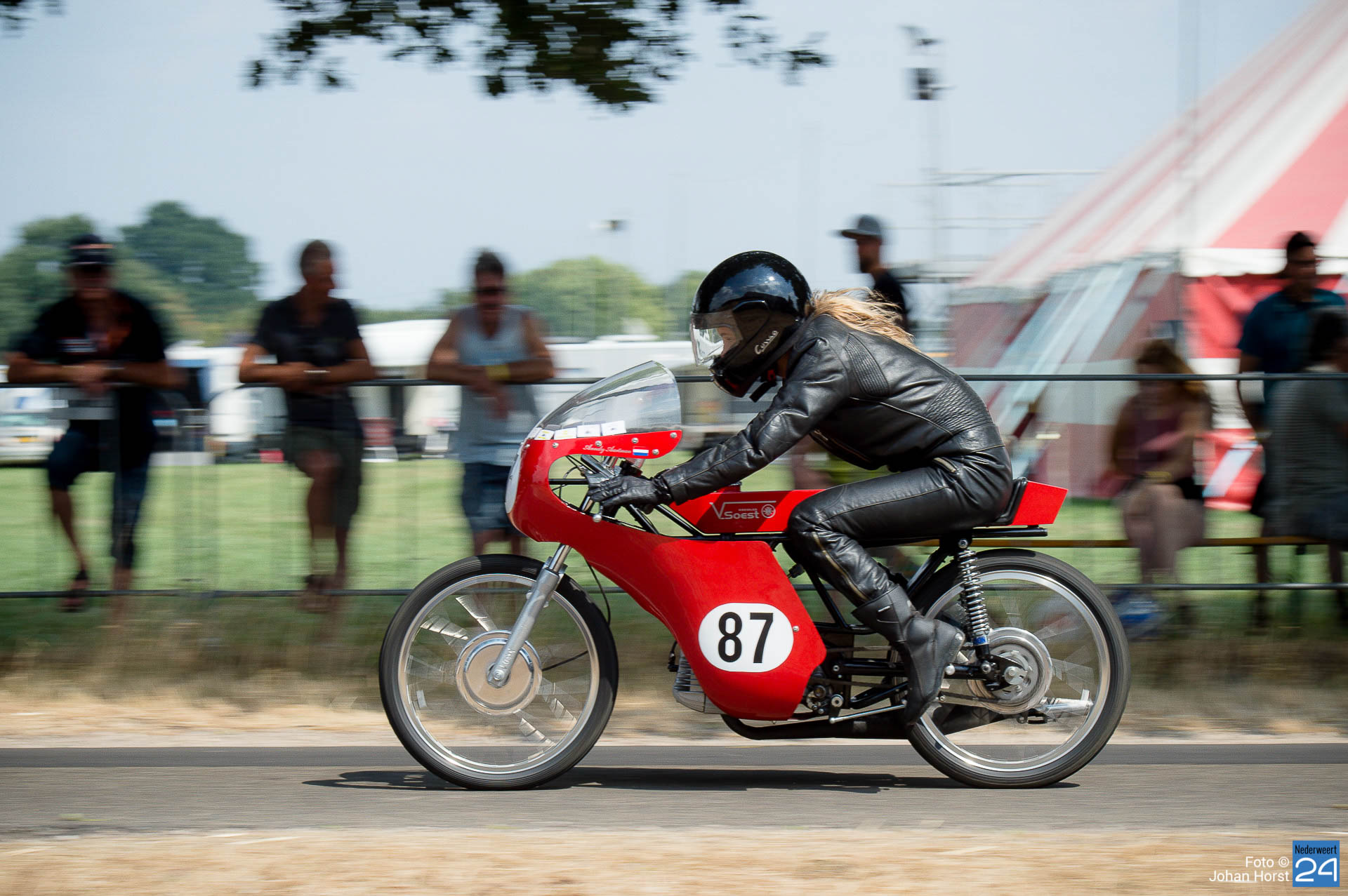 Op het evenemententerrein naast Isidoorstraat 16 in Haler konden toeschouwers niet alleen de motoren in actie zien, maar ook het rennerskwartier bezoeken, andere bijzondere oldtimers bewonderen, genieten van een hapje en een drankje én ’s avonds van livemuziek.