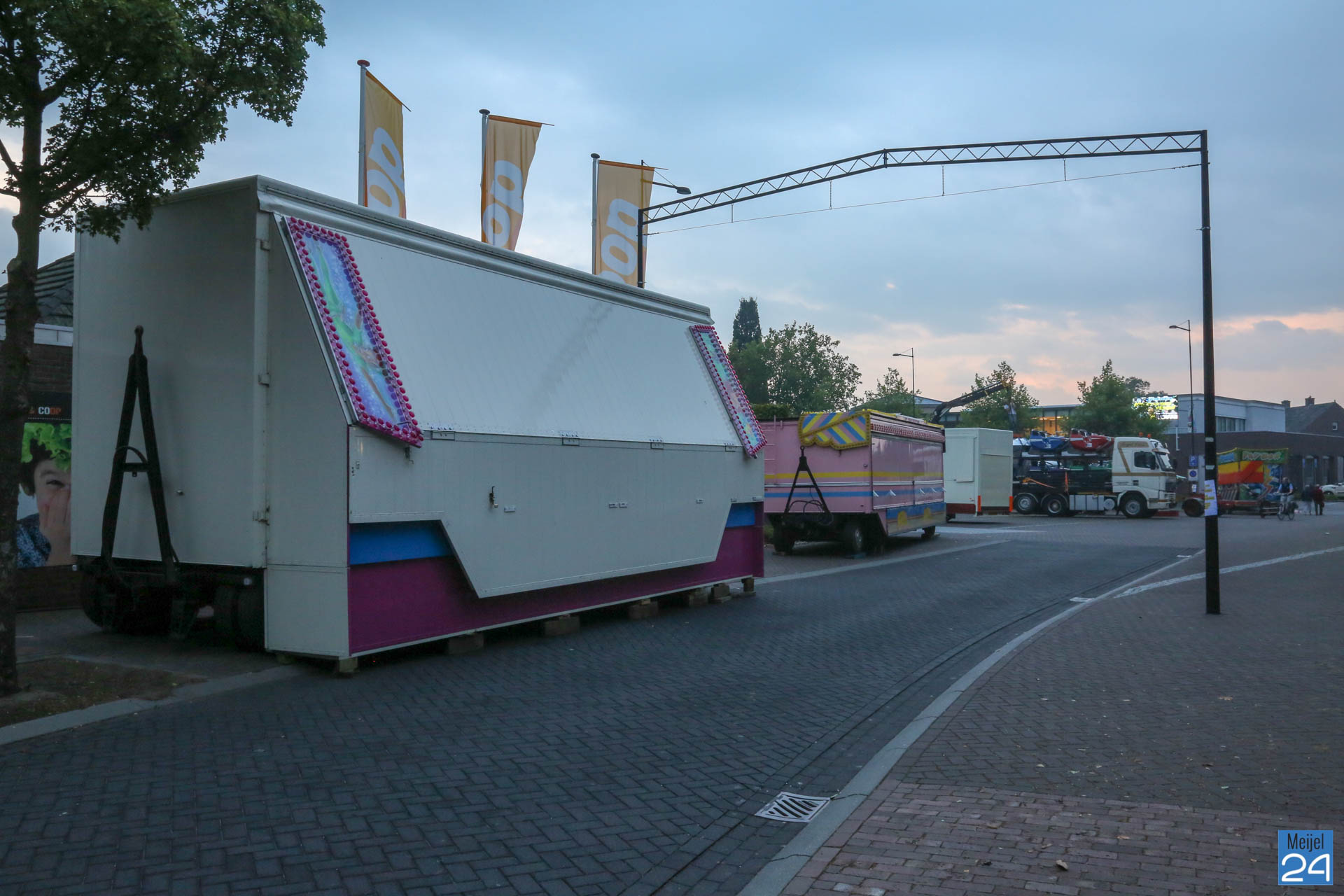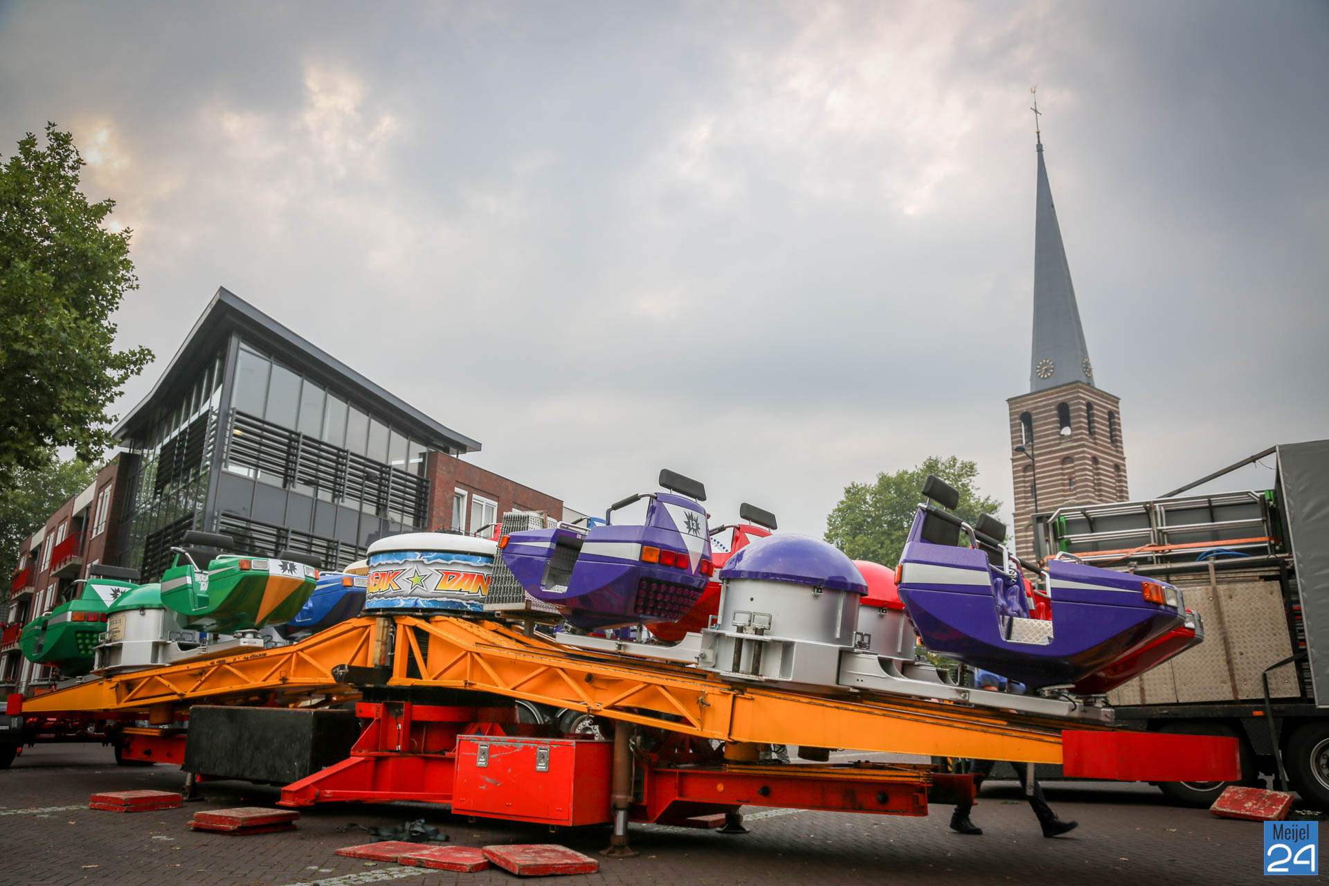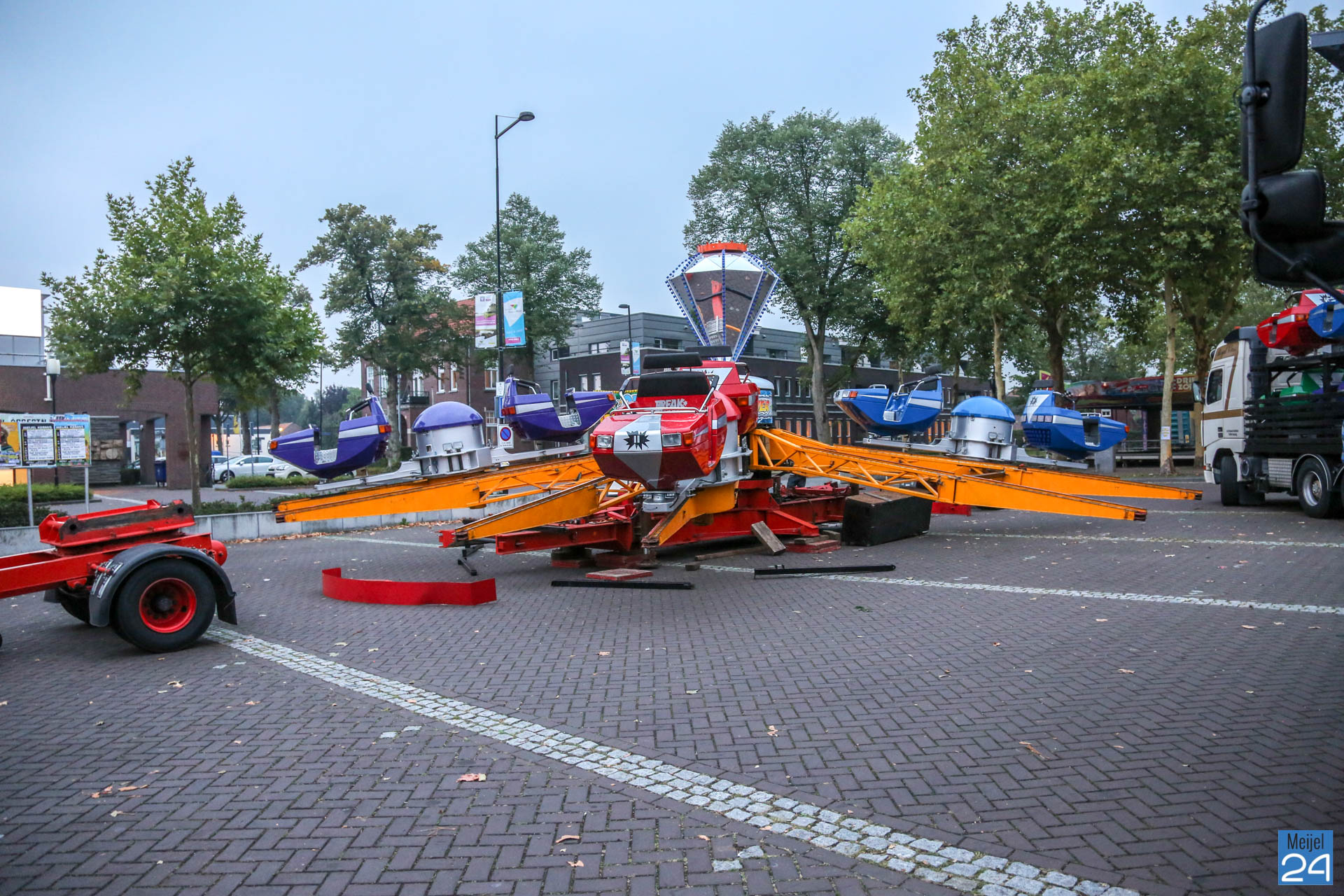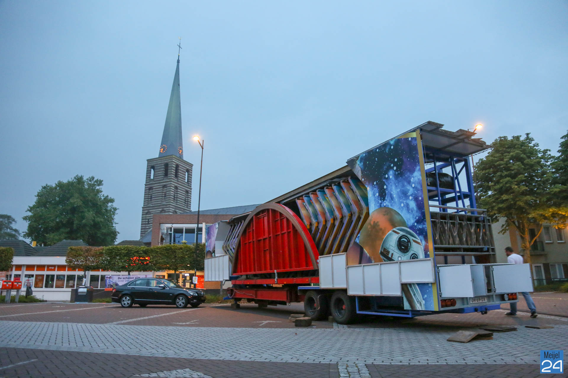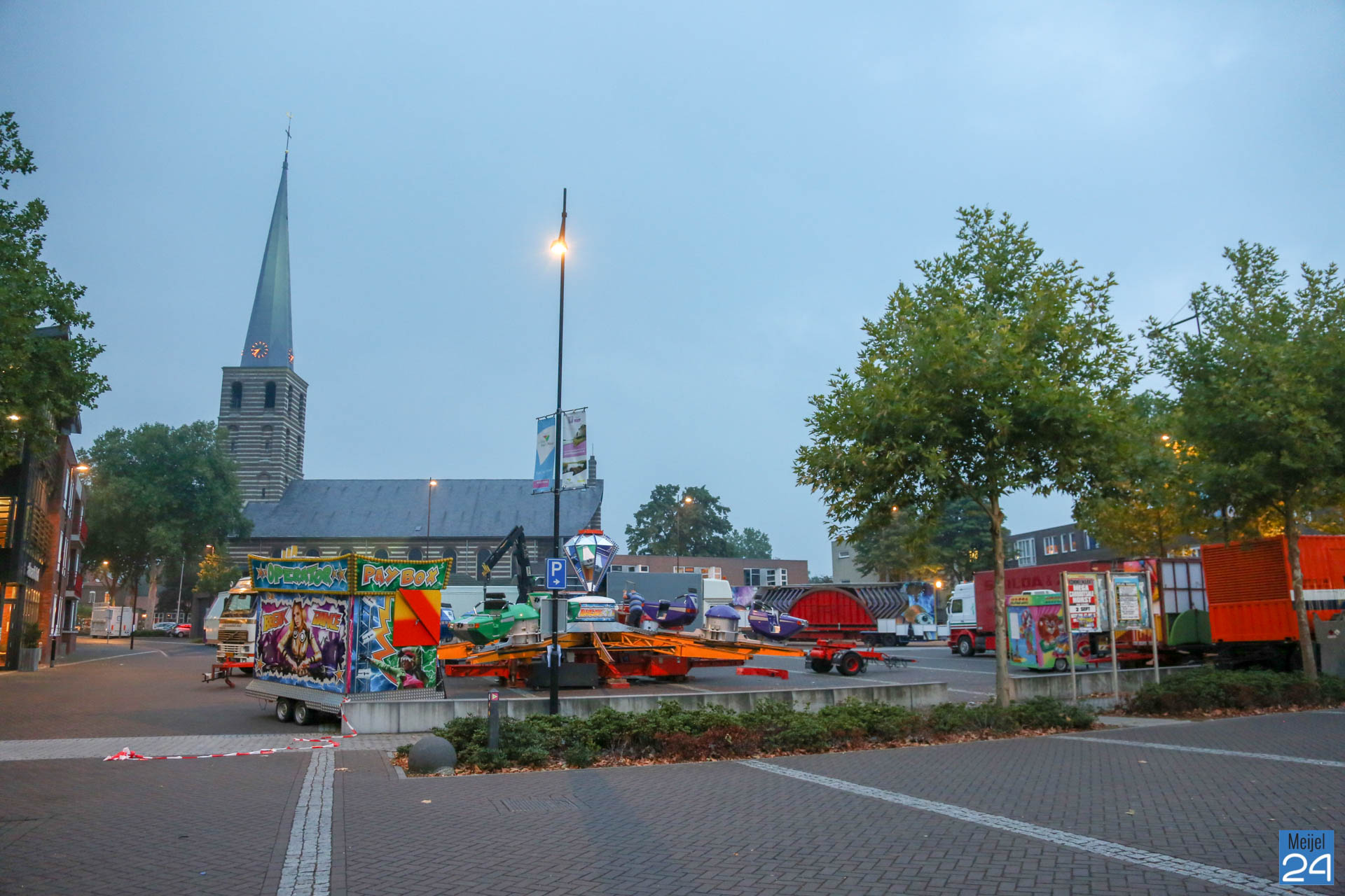 De opbouw van de kermis in Meijel is woensdag van start gegaan. Om 20:00 uur werden de wegen rondom het kermisterrein afgezet. Diverse attracties werden woensdagavond al op hun plek gezet. Blijkbaar had niet iedereen in de gaten dat ook het Alexanderplein werd afgesloten. Een geparkeerde personenauto stond behoorlijk in de weg.