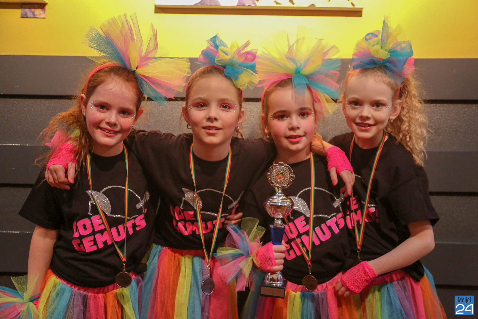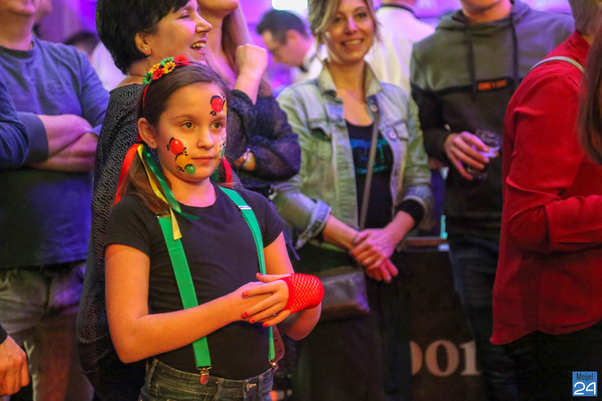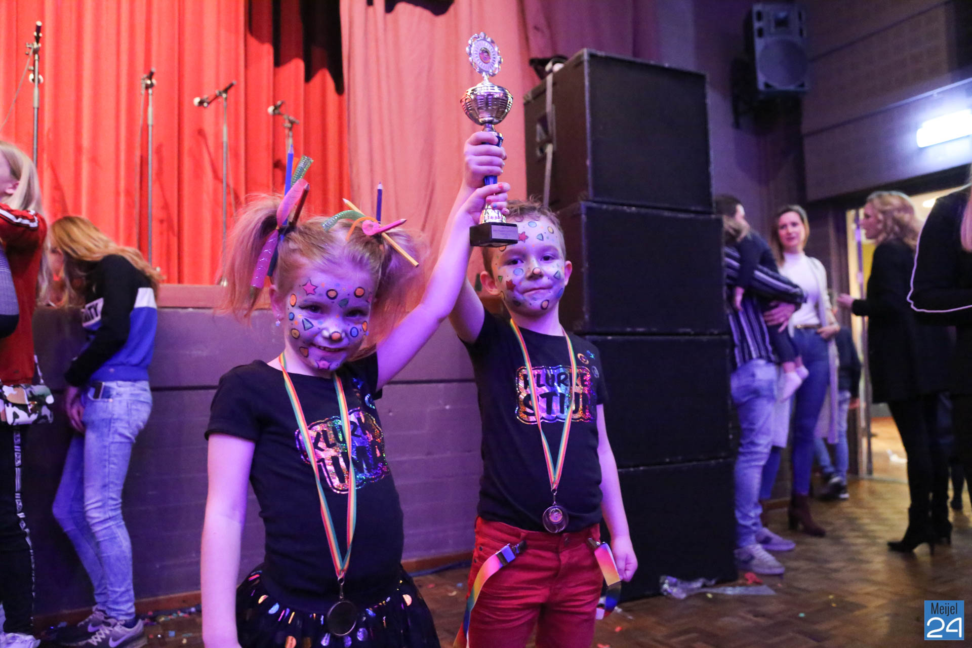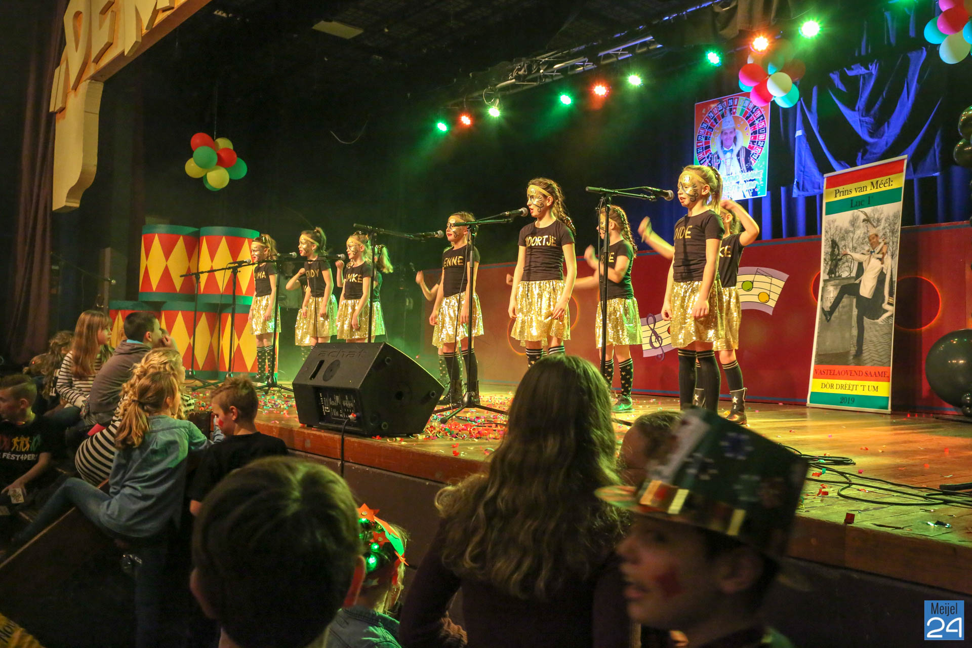 Na deze muzikale opening was het de beurt aan de kinderen tot en met groep 5. Zes prachtig uitgedoste groepen, met allemaal eigen teksten brachten een spetterend optreden op de planken. Nadat het laatste nummer van deze categorie had geklonken, was het aan de jury om bekend te maken wie er in de prijzen waren gevallen. Als eerste werd de “Beeste Méélse tekst” uitgereikt en die was voor de groep “De Zökskes” met hun lied “Ik wil ranja!!!”. De “Prizzentaasie-prisj” was voor “De Dòlle Dörskes” die “Jumpie, de zingende kangoeroe” zongen. De Kievelprisj voor het beste liedje ging naar de “Réégenboog Dörskes” met hun liedje “We gòn saame danse”. Nummer 2 is geworden “Goe Gemutst” met “Wéj viere fést” en de derde prijs was voor de “Britt-nies” die het nummer “Wéj zin Britt” ten gehore brachten.