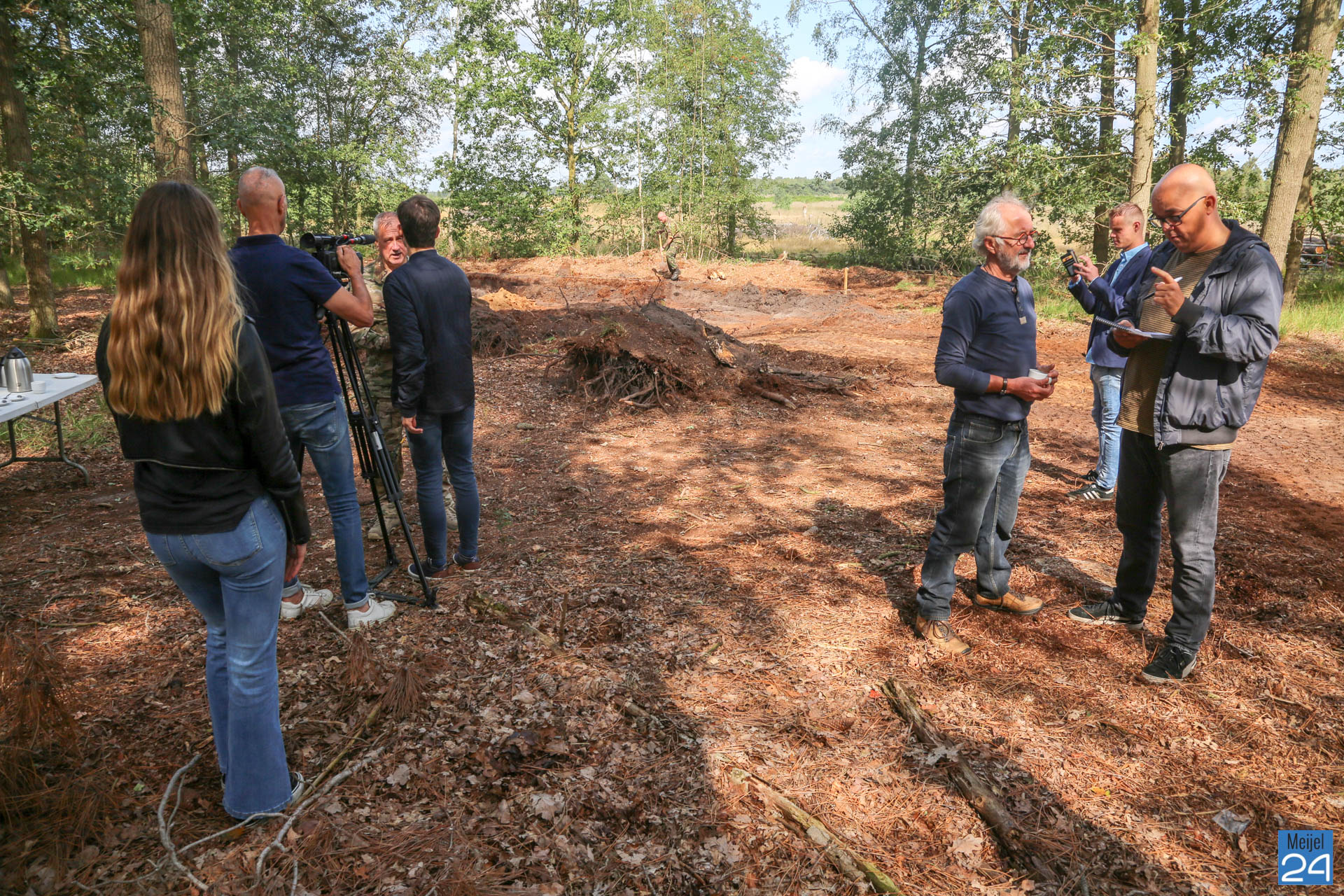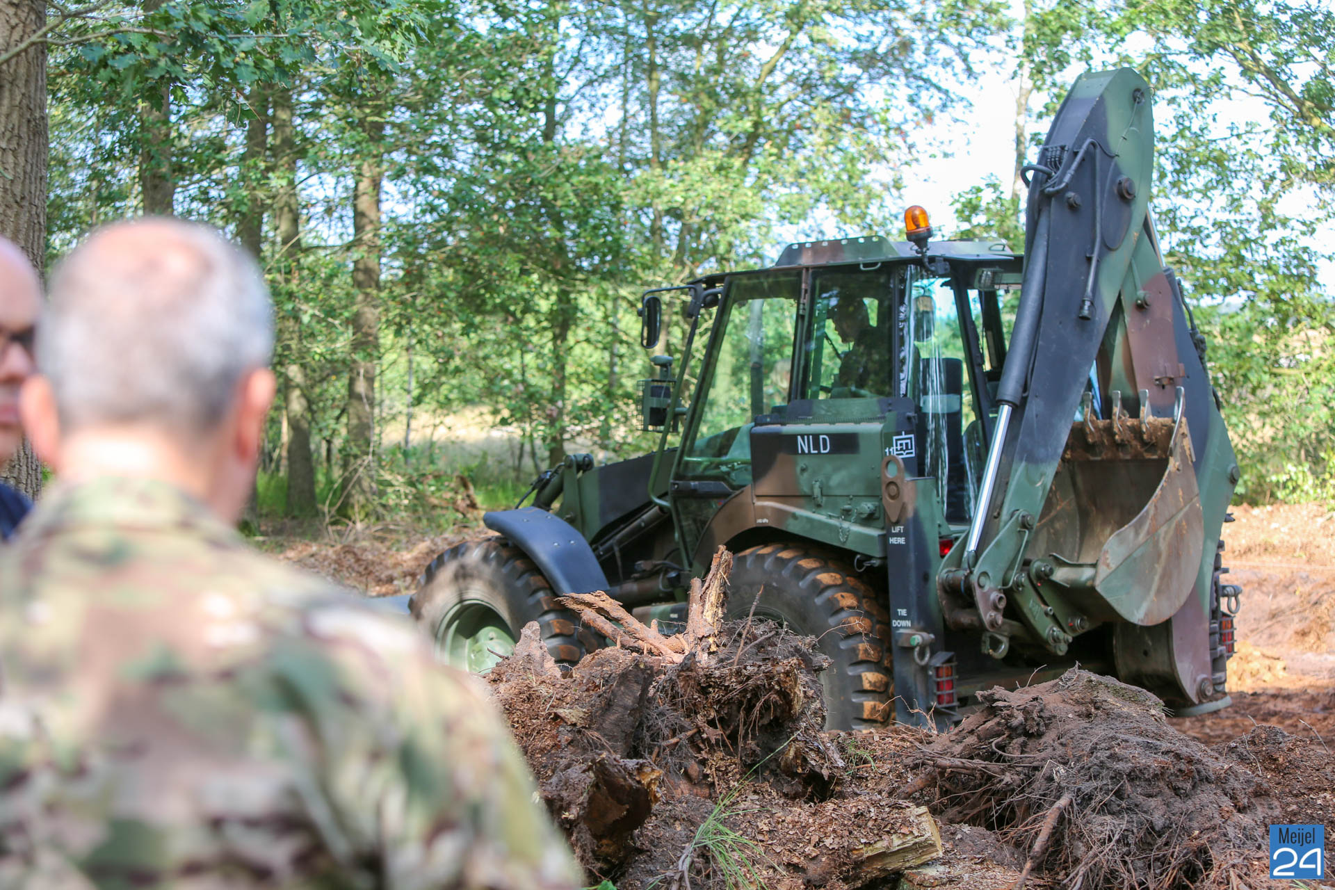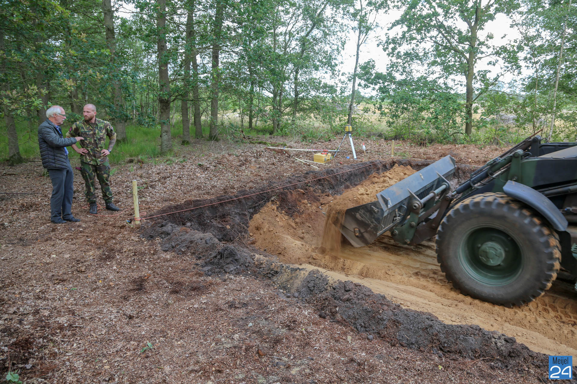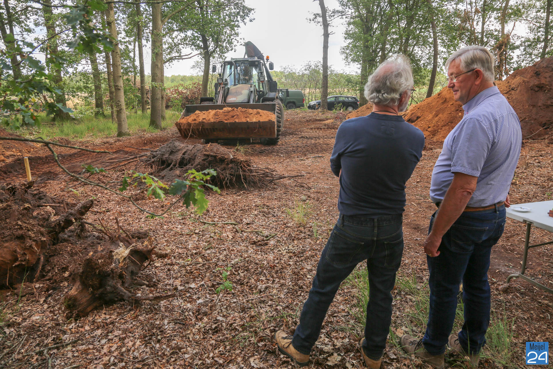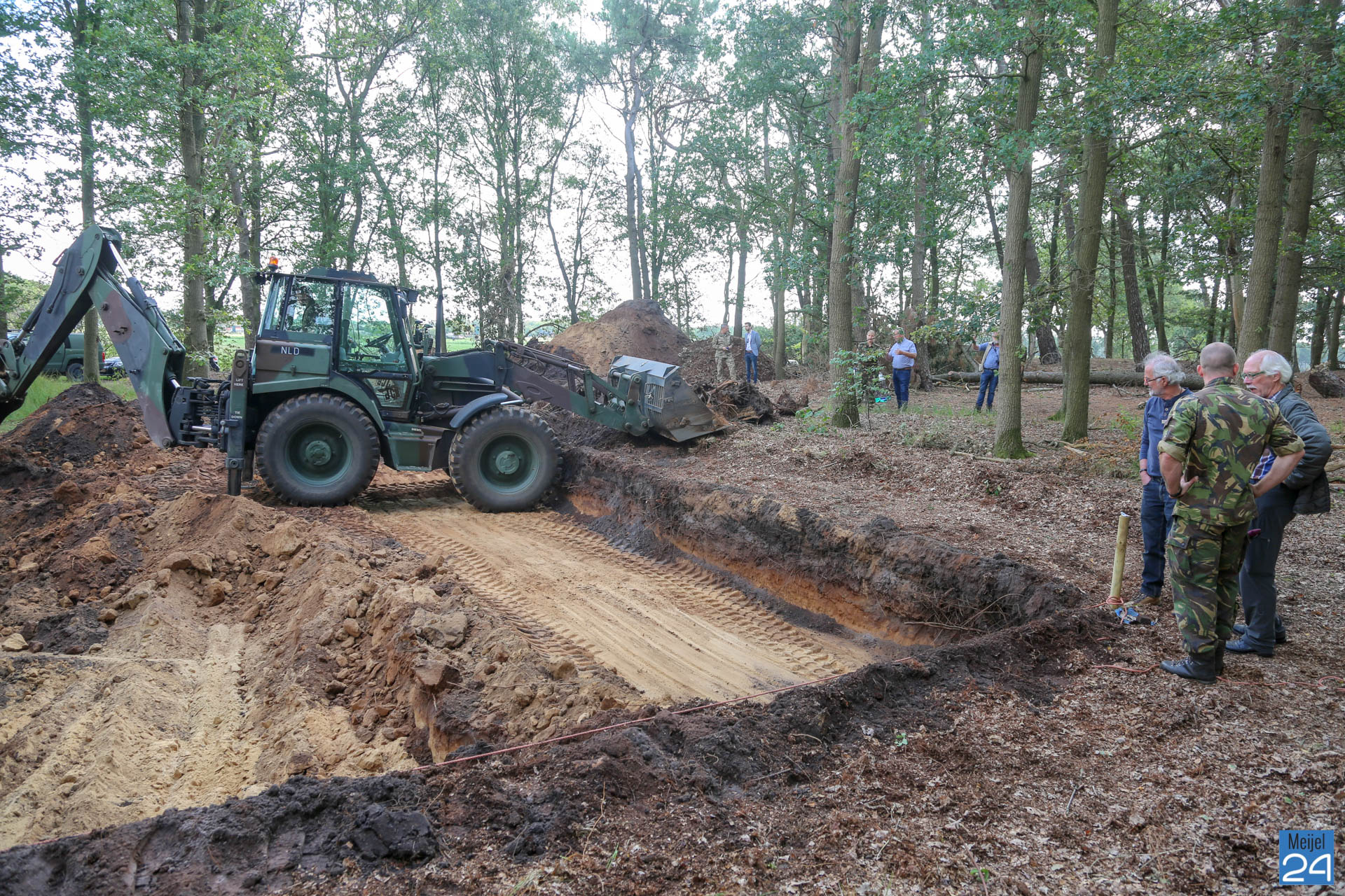 De staatssecretaris vroeg zich af of Defensie in het kader van de viering 75 jaar bevrijding iets kon betekenen voor de projectgroep. Nu een half jaar later, wordt de fundering door Defensie uitgegraven. Trots keken Jo en Mart dinsdagmorgen toe terwijl een grote machine aan de slag ging. Een van de aanwezigen van defensie gaf aan dat ze graag iets voor Meijel willen betekenen: ”Ik wil graag iets voor een klein dorp als Meijel doen”.