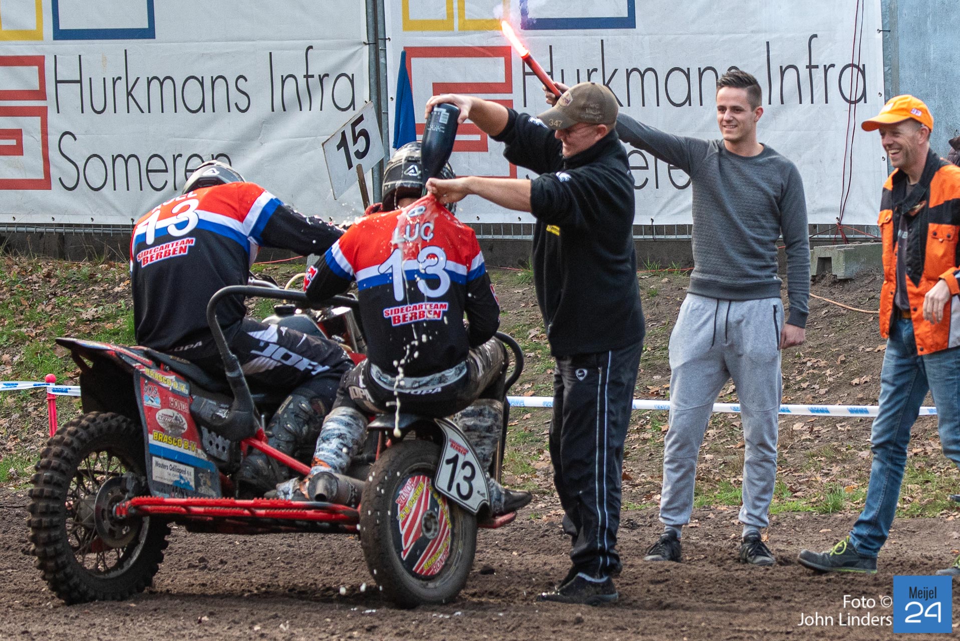 Veel familieleden en fans waren vandaag naar het circuit aan de Peelweg 1 in Meijel gekomen om het zijspan duo te feliciteren en te huldigen. Tijdens de tweede manche werd het nieuwe nummerbord voor op de motor geschroefd en van startnummer 13 werd snel de 3 weggehaald om met startnummer 1 mee te rijden.
