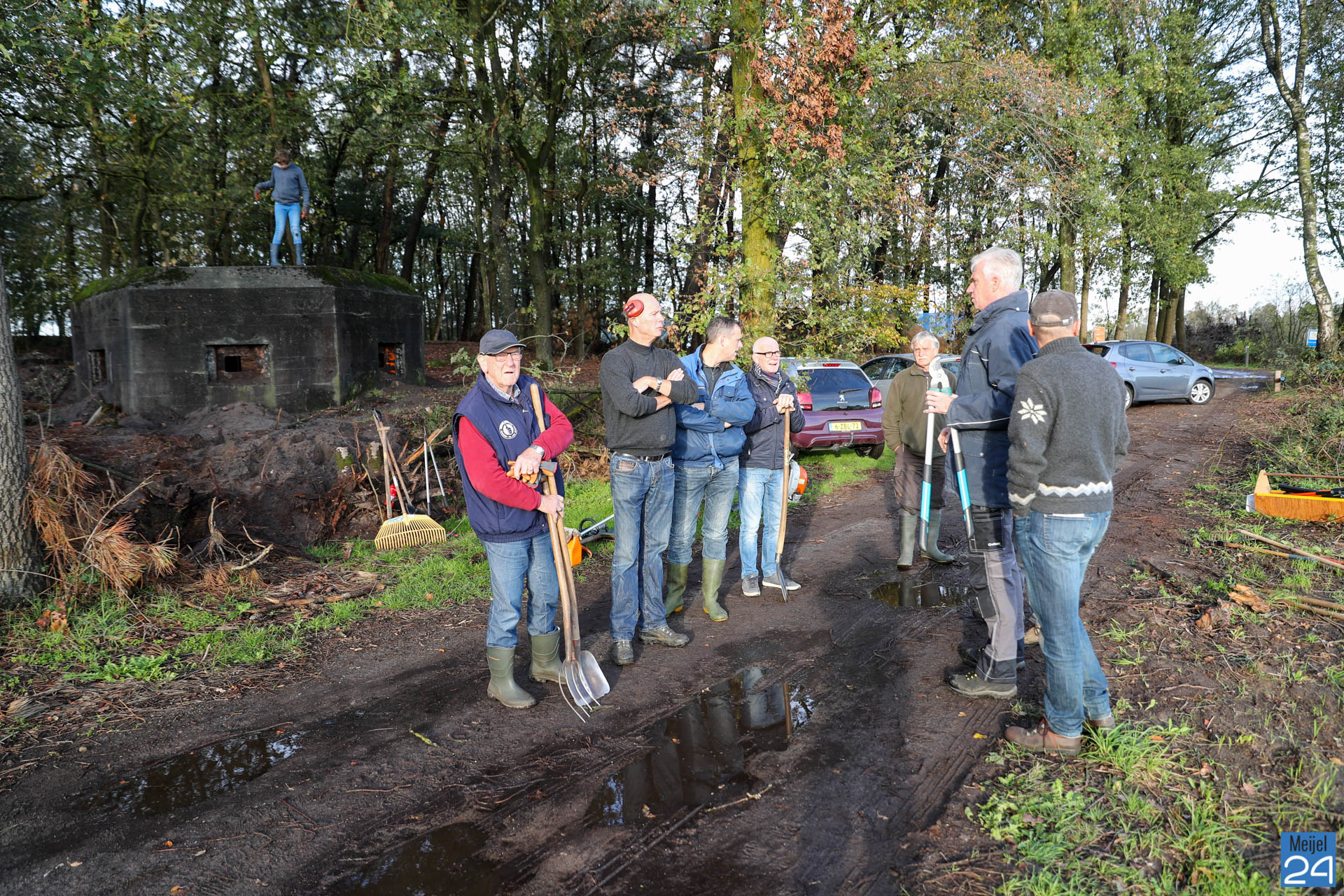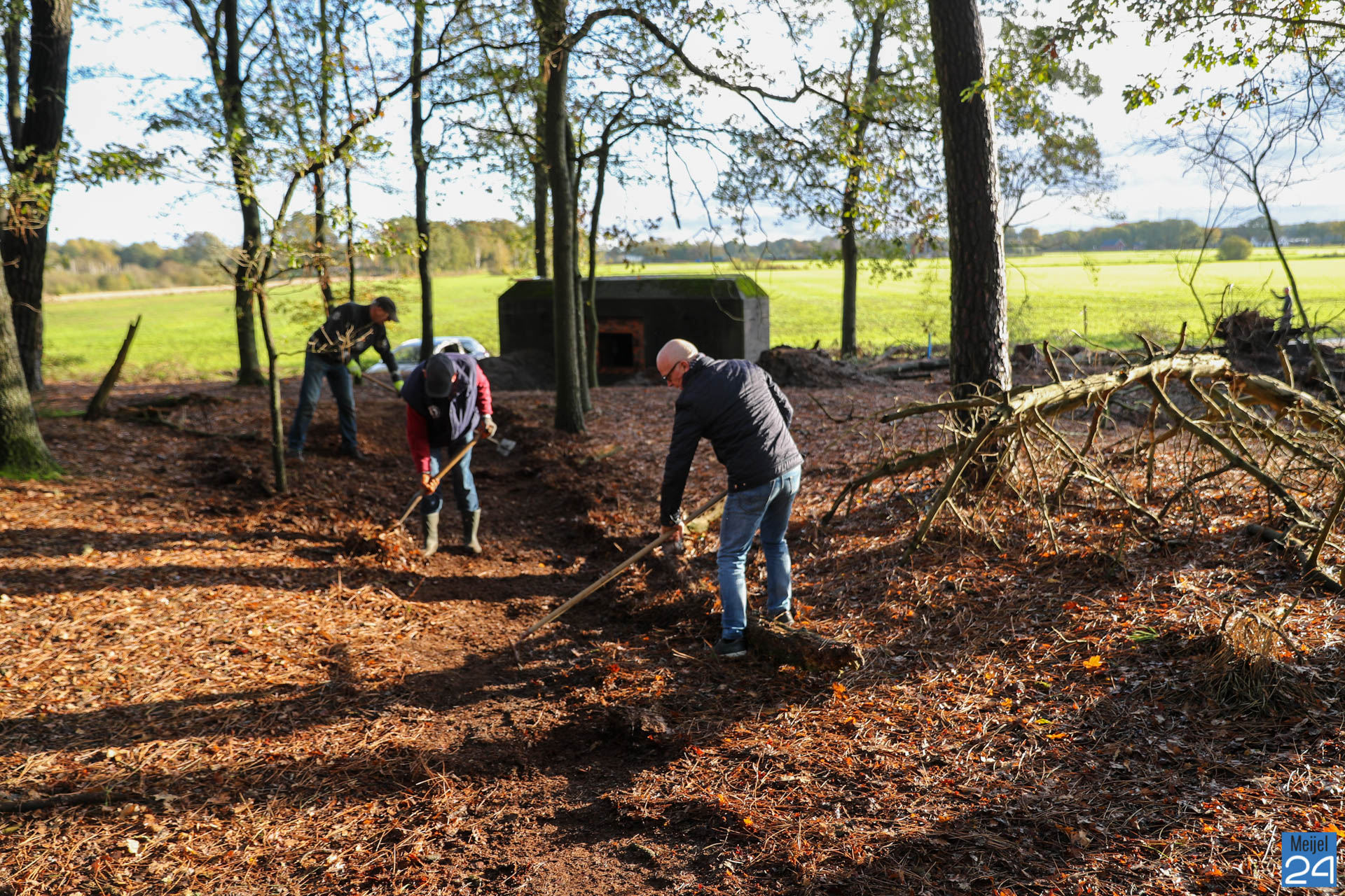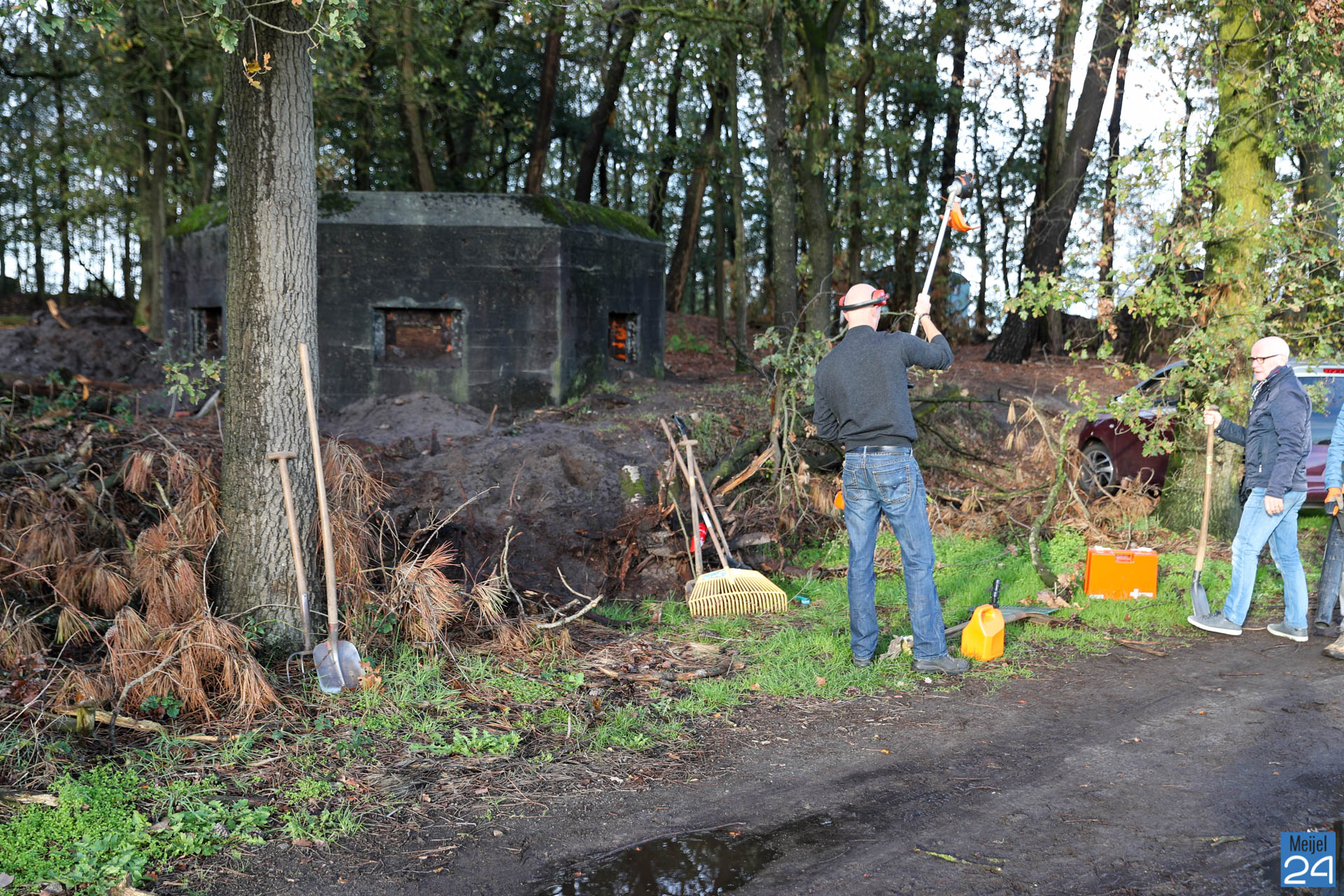 Daarom organiseert Netwerk Natuur en Recreatie – Dorpsoverleg Meijel op zaterdag 2 november een ‘Werkdag op de Vossenberg’ voor ‘noeste peelwerkers’. Vrijwilligers die zich hadden aangemeld kwamen naar de Vossenberg om daar samen de handen uit de mouwen te steken. Met bladblazers, harken, knipscharen en graafmachines gingen ze aan de slag om de omgeving van de stelling op te schonen. Noeste arbeid….