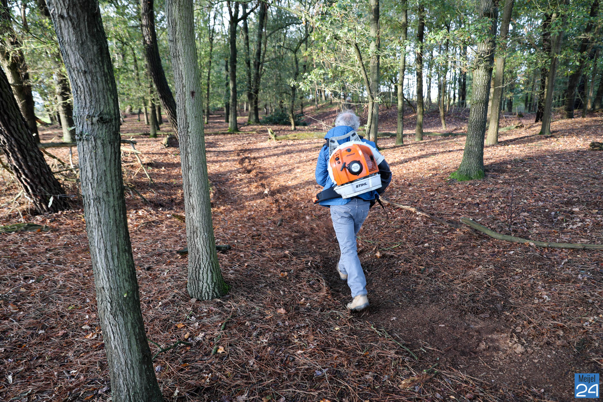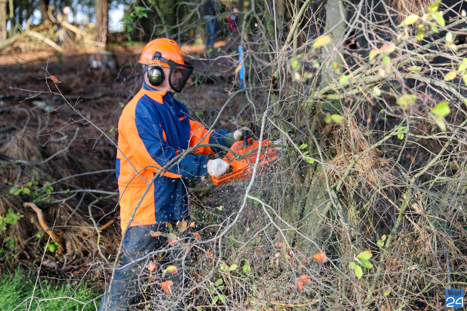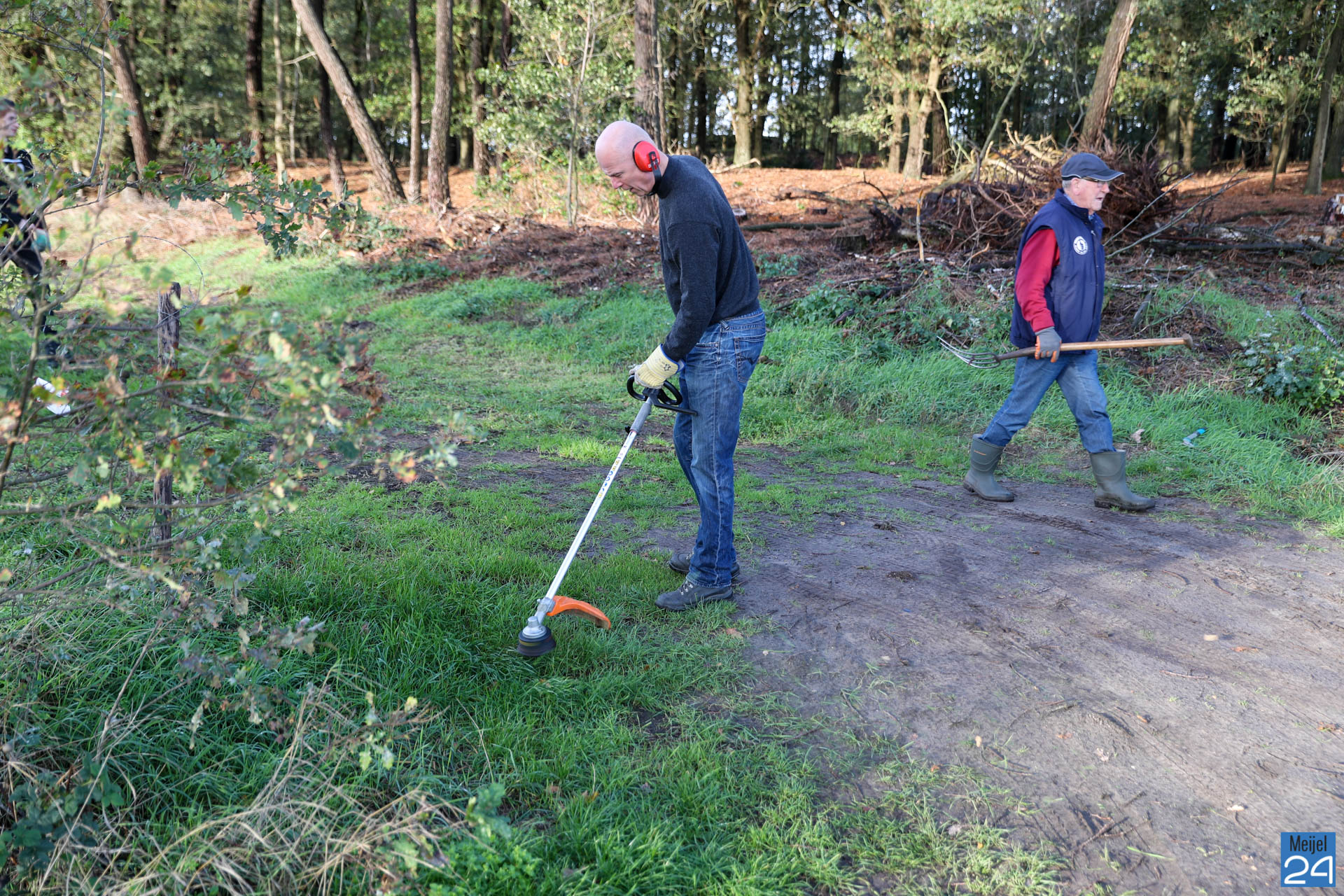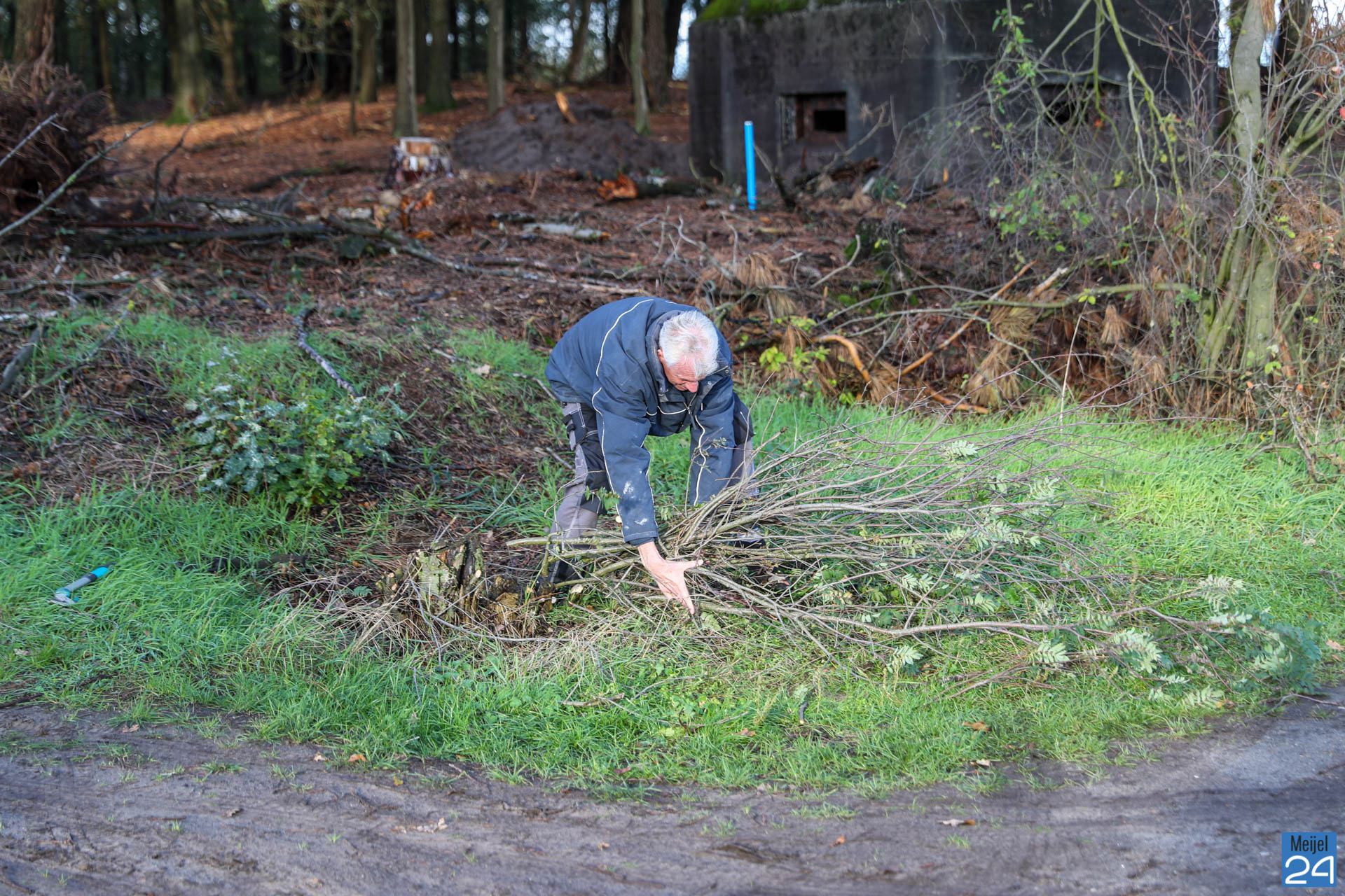 Daarom organiseert Netwerk Natuur en Recreatie – Dorpsoverleg Meijel op zaterdag 2 november een ‘Werkdag op de Vossenberg’ voor ‘noeste peelwerkers’. Vrijwilligers die zich hadden aangemeld kwamen naar de Vossenberg om daar samen de handen uit de mouwen te steken. Met bladblazers, harken, knipscharen en graafmachines gingen ze aan de slag om de omgeving van de stelling op te schonen. Noeste arbeid….