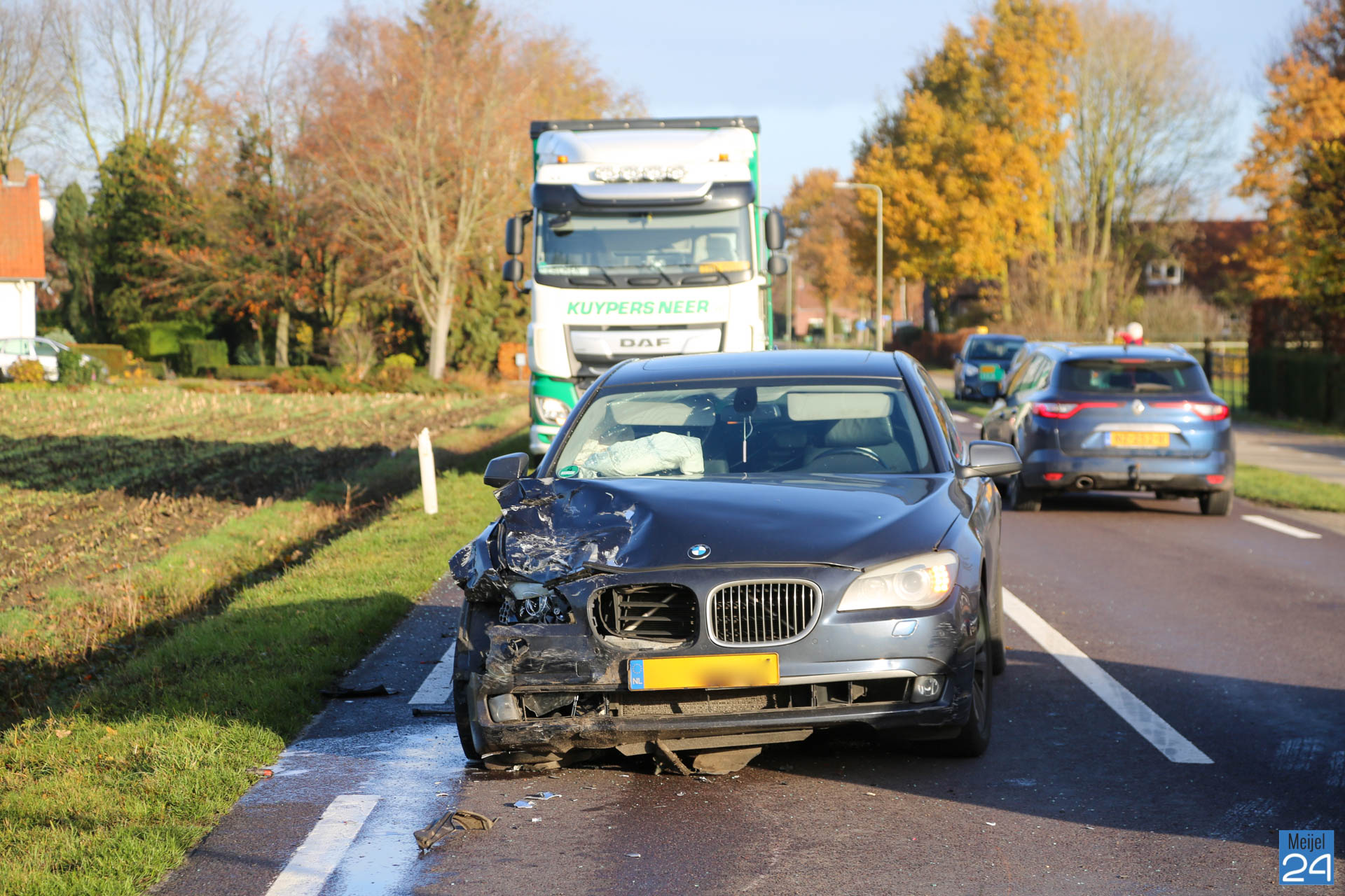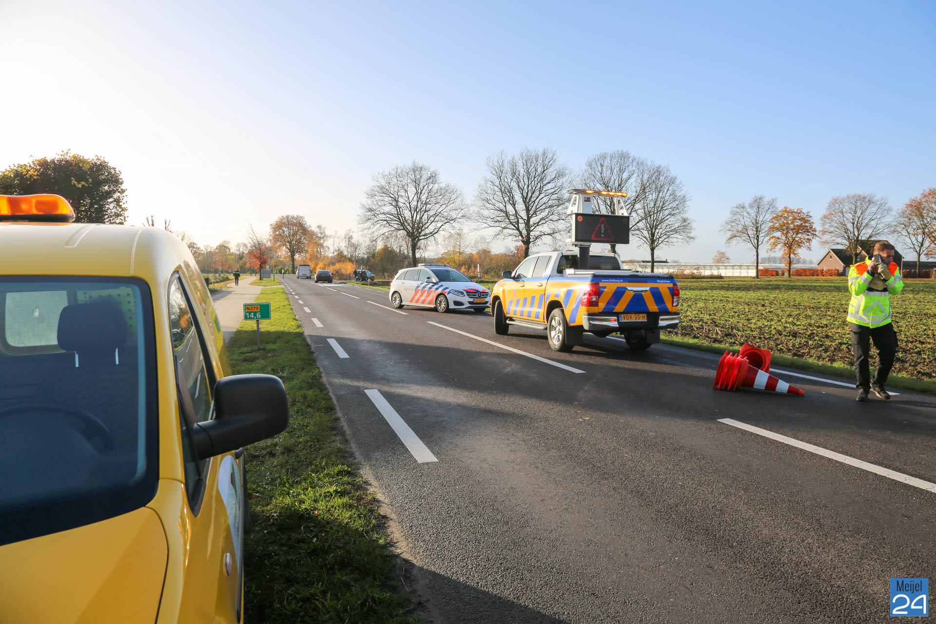 Een ambulance kwam ter plaatse om de inzittenden te controleren. Niemand raakte gewond. De weg ligt bezaaid met glas. De politie en Provincie hebben de rijbaan vanuit Meijel richting Heibloem afgesloten. Het verkeer loopt vooralsnog niet vast en kan langs het ongeval rijden.