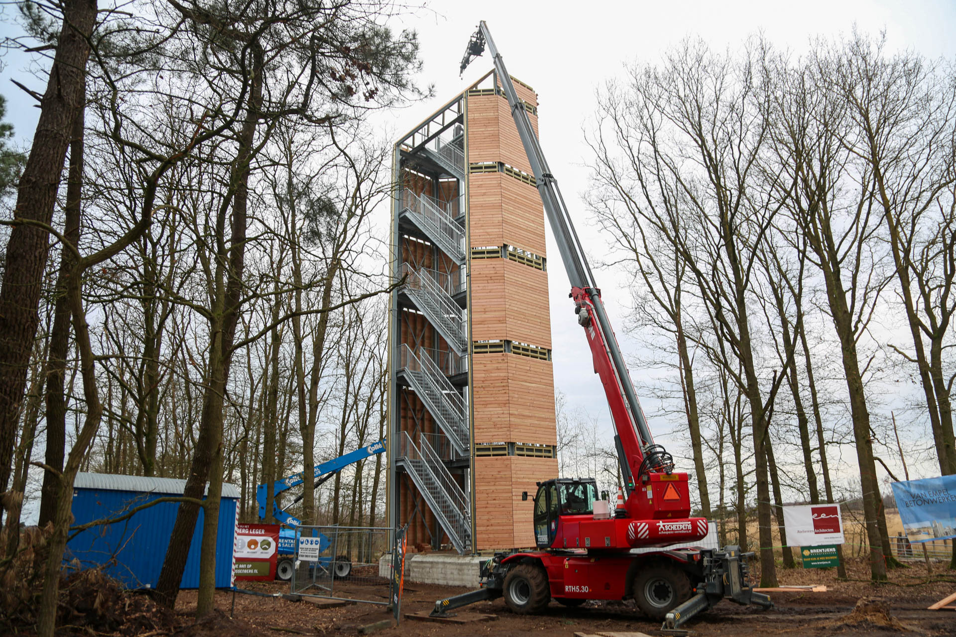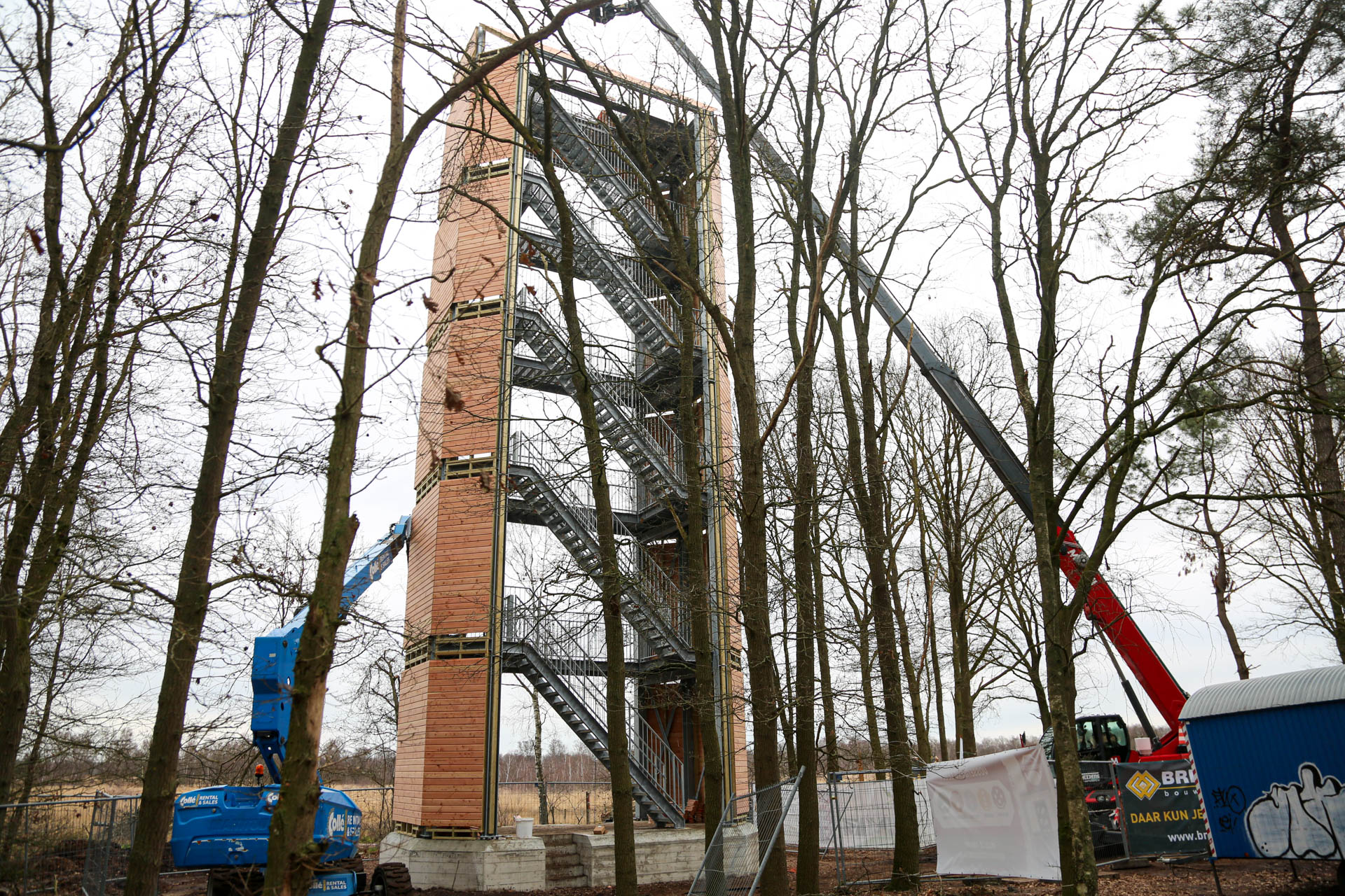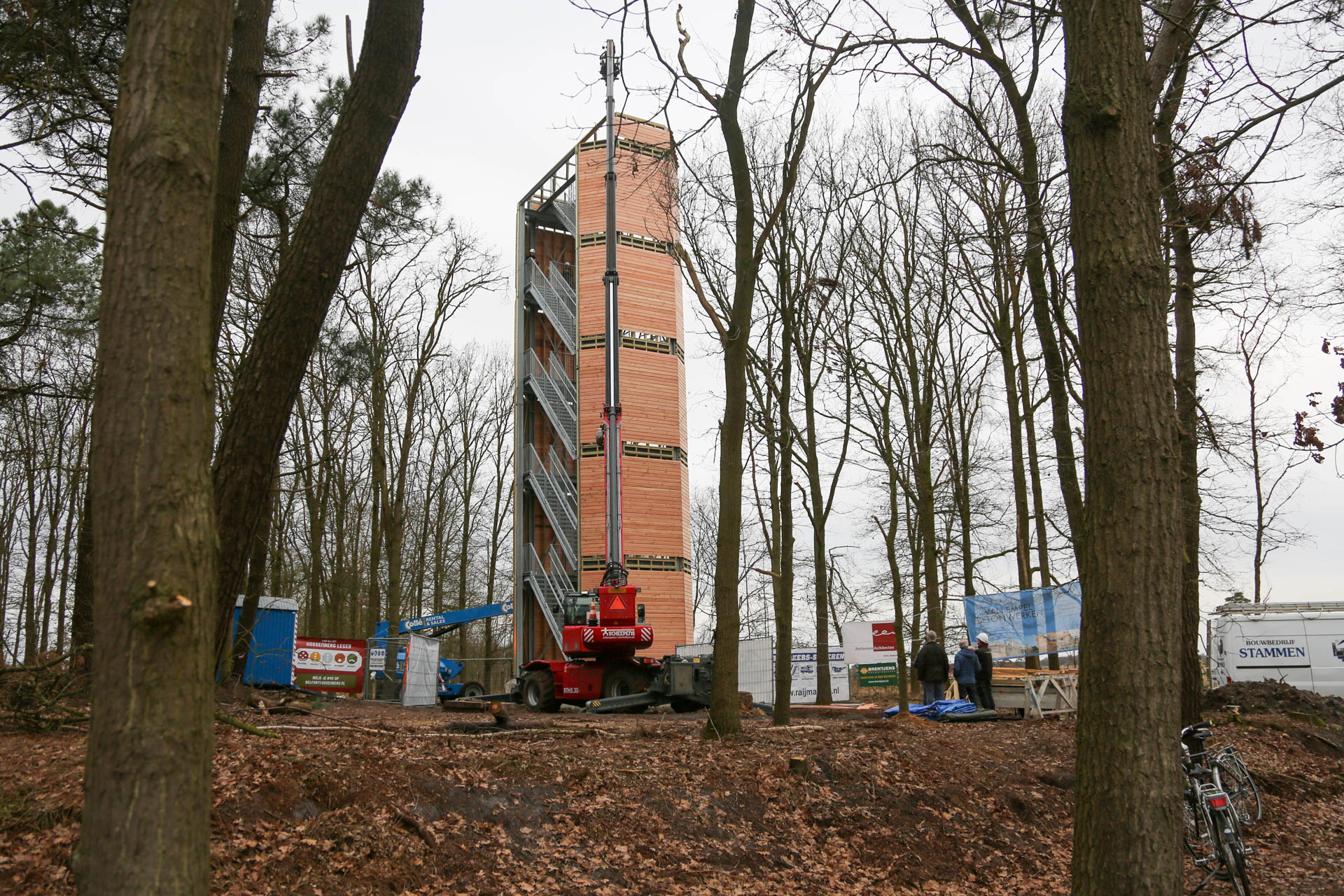 Afgelopen maandag zijn de werkzaamheden bij Belfort De Vossenberg in Meijel weer hervat. Ketelaars Laswerken heeft het bordes geplaatst en bouwbedrijf Stammen is momenteel de houten zijpanelen aan het plaatsen. Ook nu stonden enthousiaste vrijwilligers klaar om een helpende hand toe te steken. Misschien is midden volgende week, als het weer het toe laat en de wind geen spelbreker is, het Belfort te beklimmen. Wie weet!