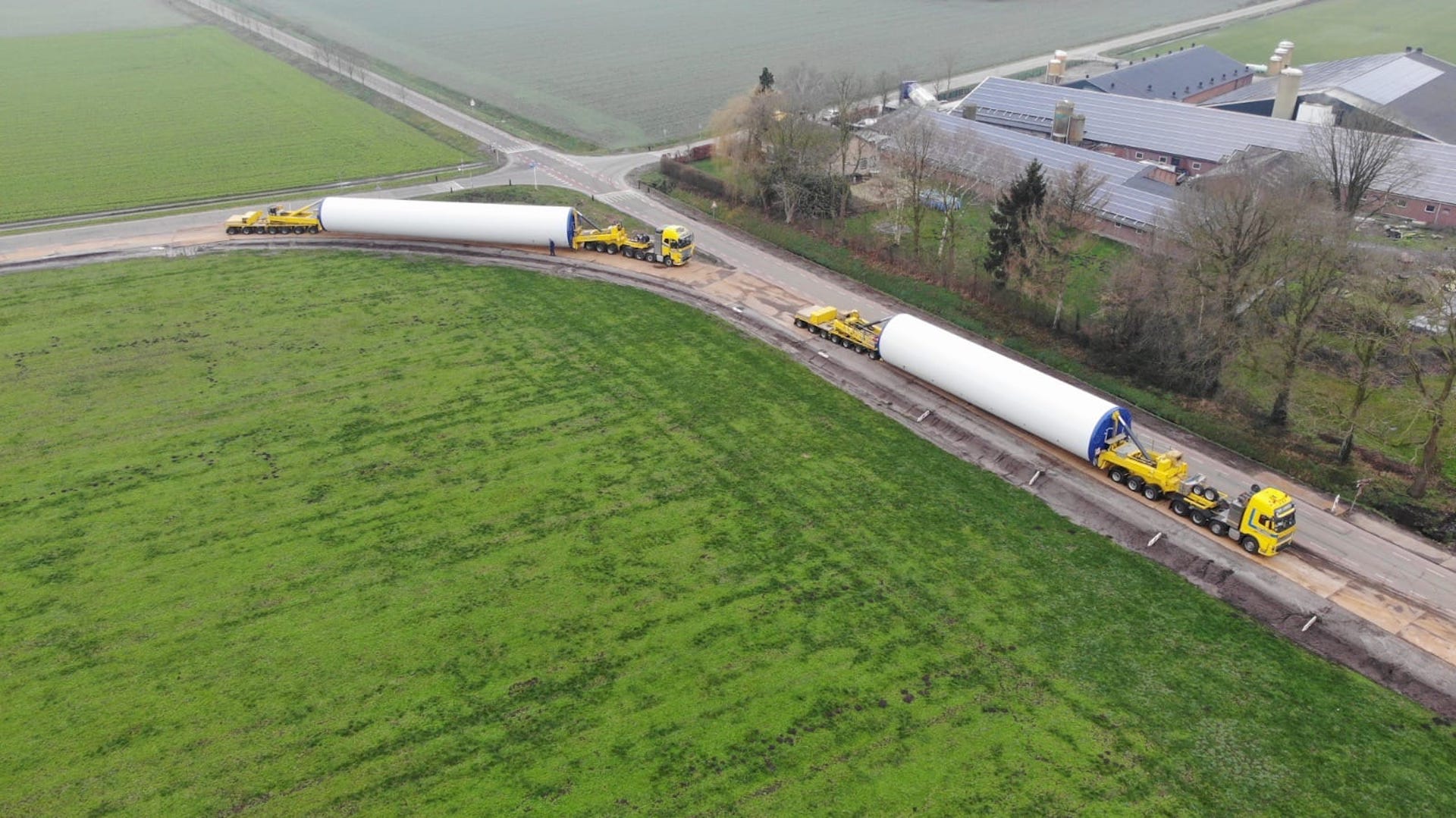 De bouw van Windpark Heibloem is in volle gang en verloopt geheel volgens planning. Vorige week arriveerden de eerste wieken/rotorbladen vanuit Antwerpen in Heibloem. Het transport van ruim 81 meter lang trok flink wat bekijks. Om bochten te kunnen nemen met zo’n lang transport werden verkeersborden, verkeerslichten en lantaarnpalen tijdelijk verwijderd. Ook rotondes werden aangepast. Inmiddels zijn ook andere onderdelen gearriveerd, waaronder torendelen. Begin maart 2020 zijn alle onderdelen en bouwkranen ter plekke. Op maandag 9 maart 2020 start de feitelijke bouw.