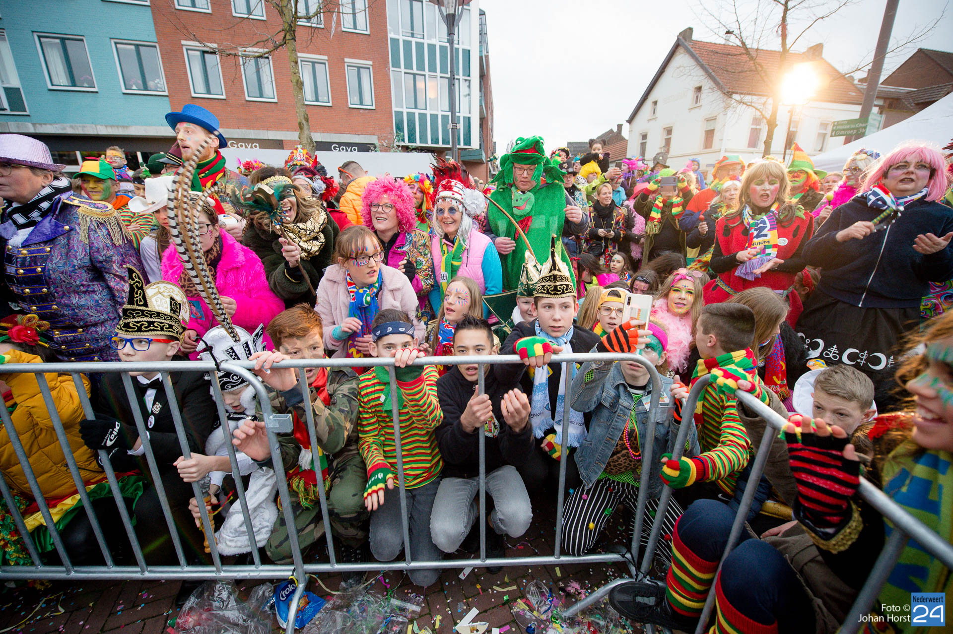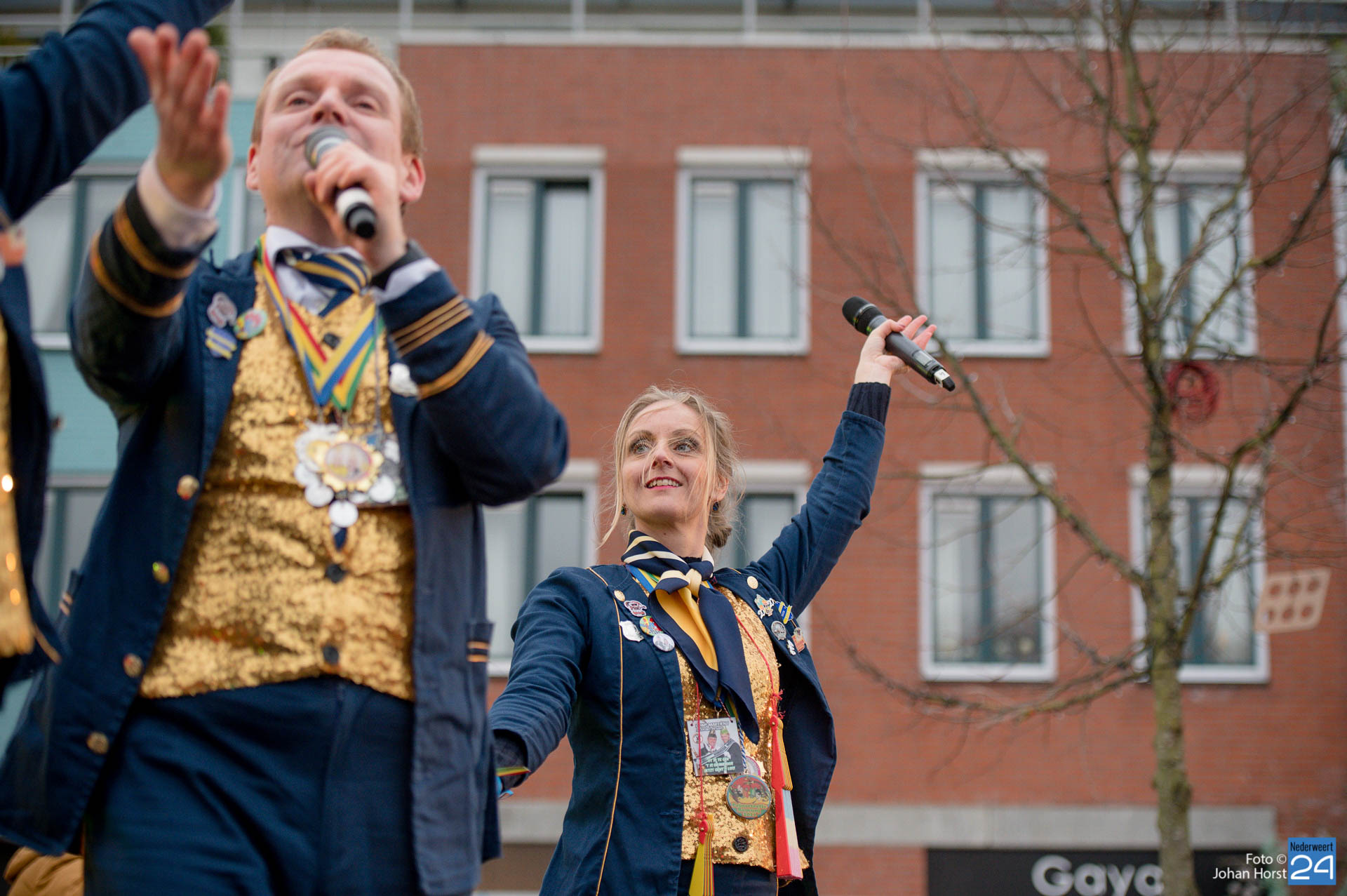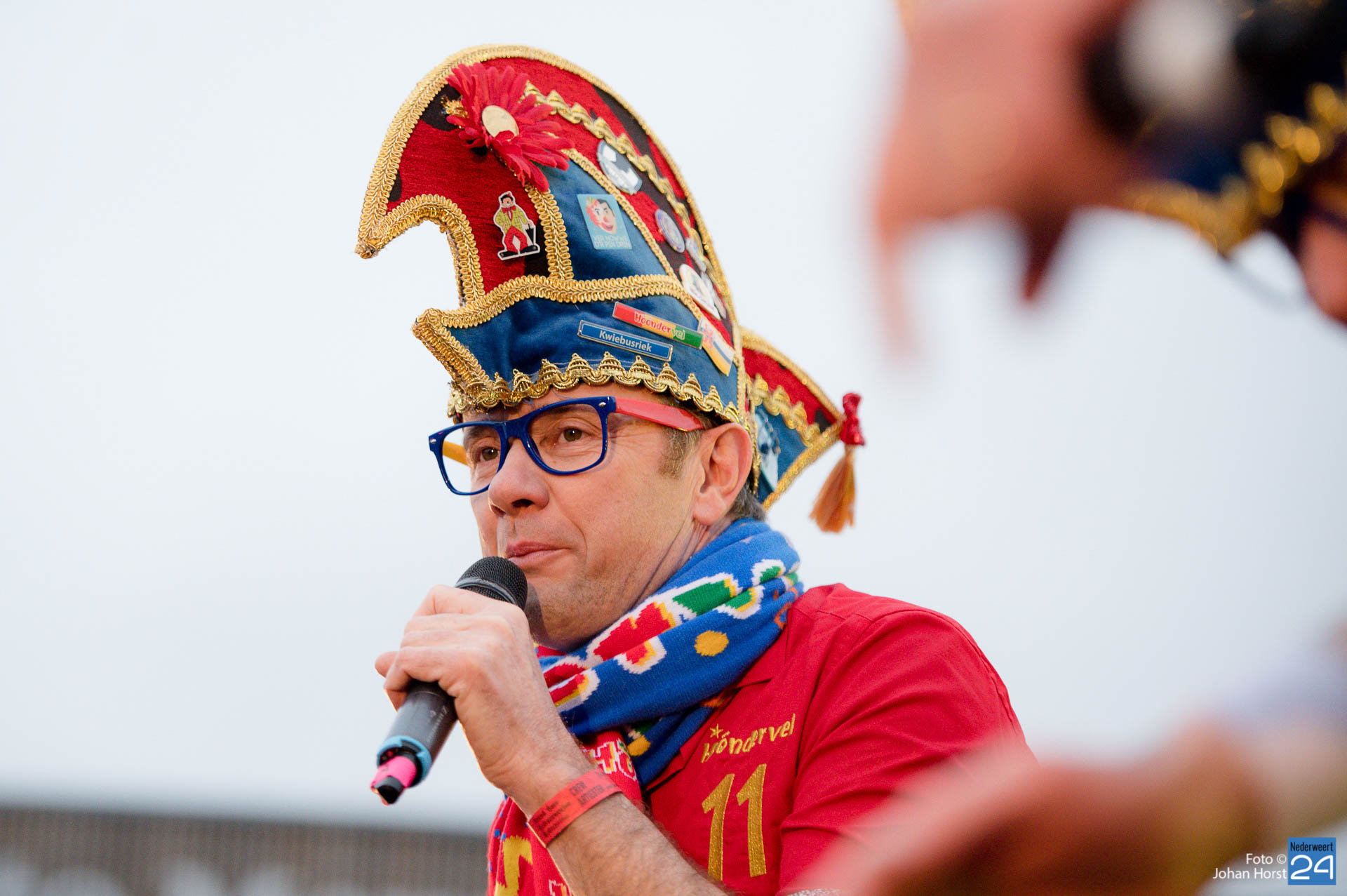 Het plein in Heythuysen stond flink vol met rood geel en groen. De eerste weekenddag van het carnavalsfeest betekent in Heythuysen muziek. Veel artiesten uit deze regio scoorden goed op de Limburgse festivals. Een paar druppeltjes verhinderde niet dat er volop werd meegedeind met de muziek.