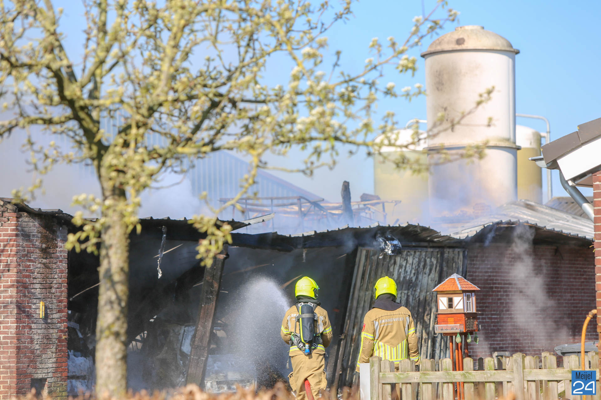 Het zou volgens de brandweer gaan om een opslag van 10×10 meter voor auto’s en een dieseltank. Verder lagen er plastic en hout en agrarische spullen in de schuur. In eerste instantie werd door de hulpdiensten er aan een mestopslag gedacht. Maar de woordvoerder van de brandweer meldde zojuist dat dat niet correct is.