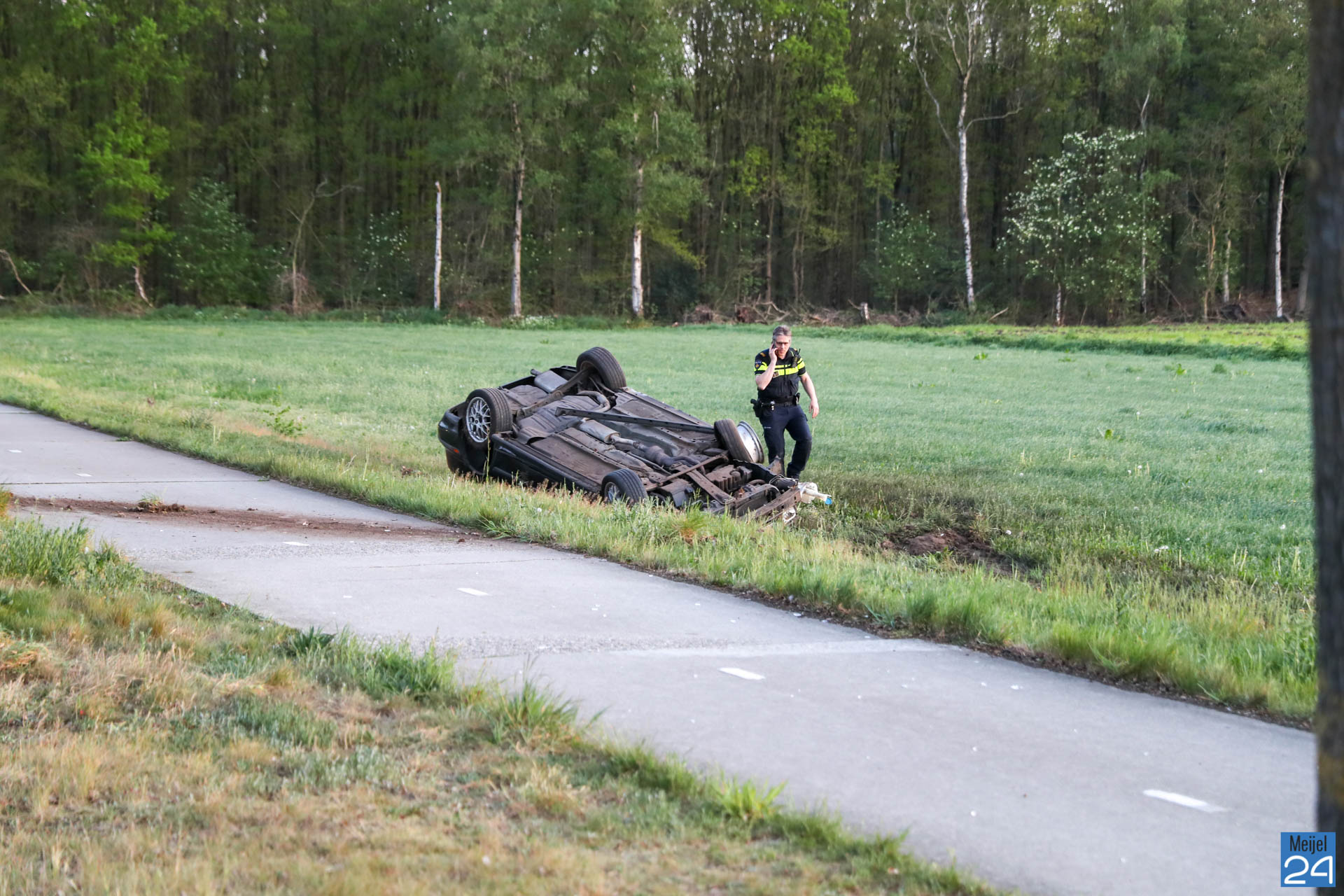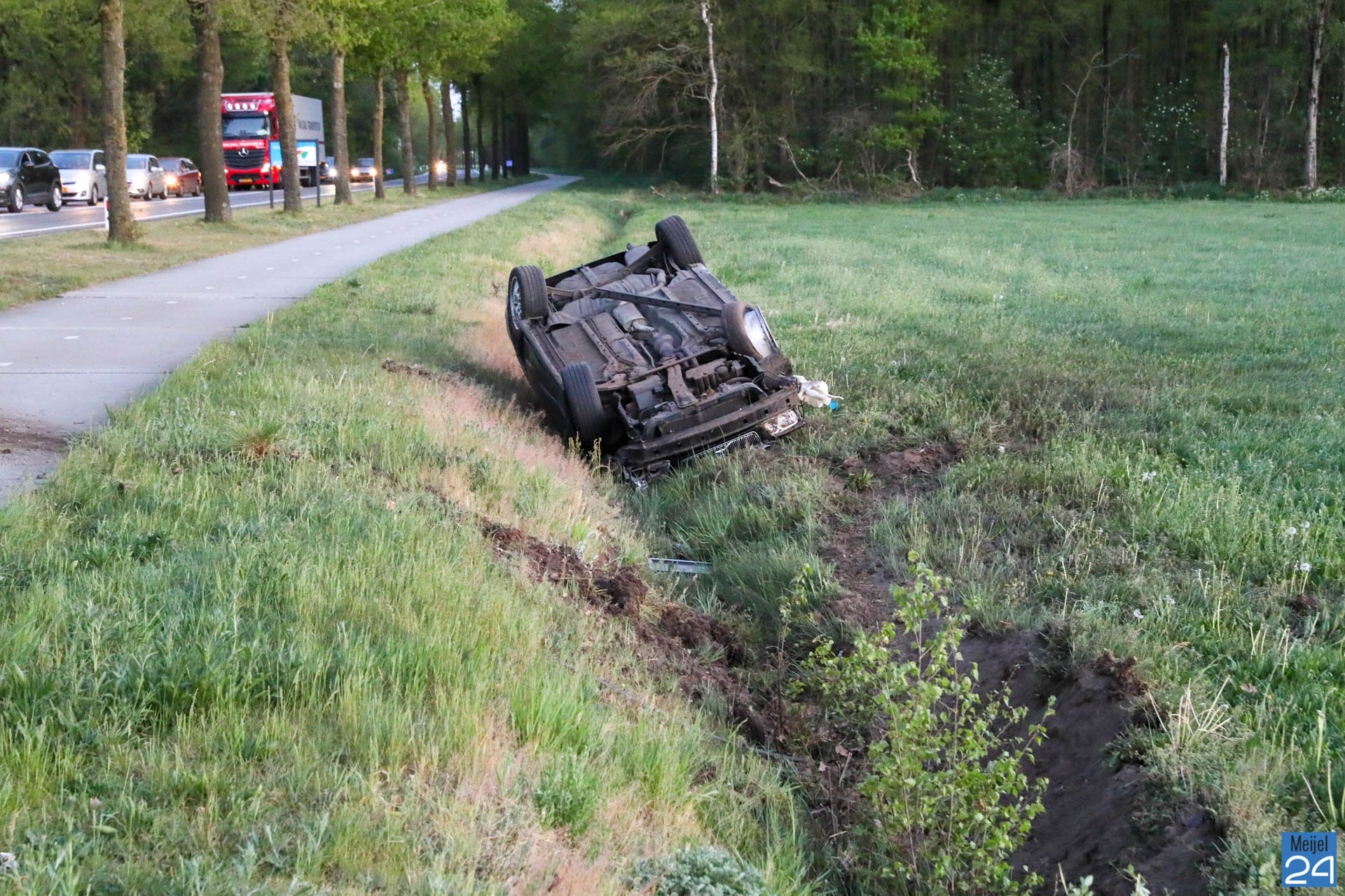 Auto over de kop in weiland naast Meijelseweg