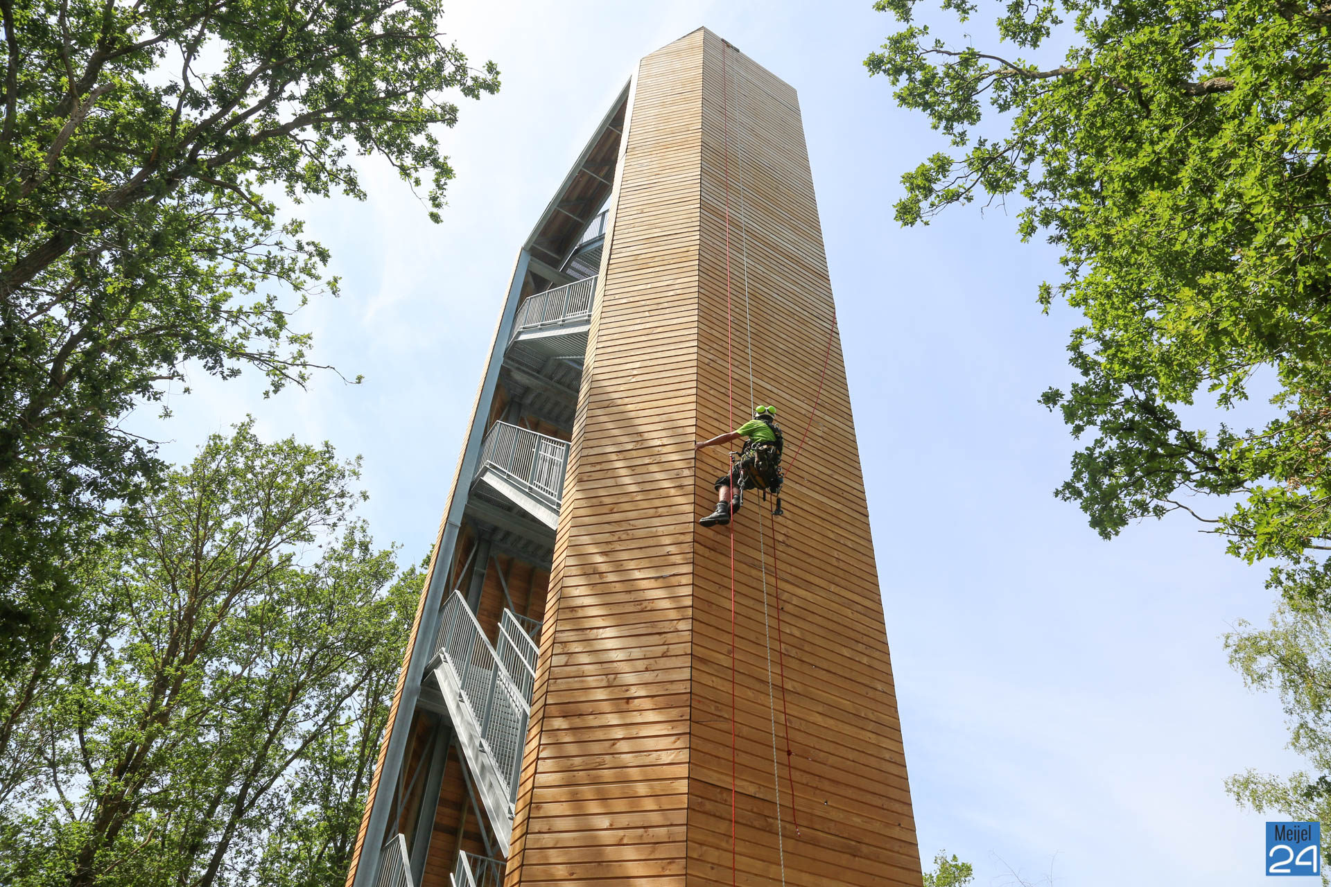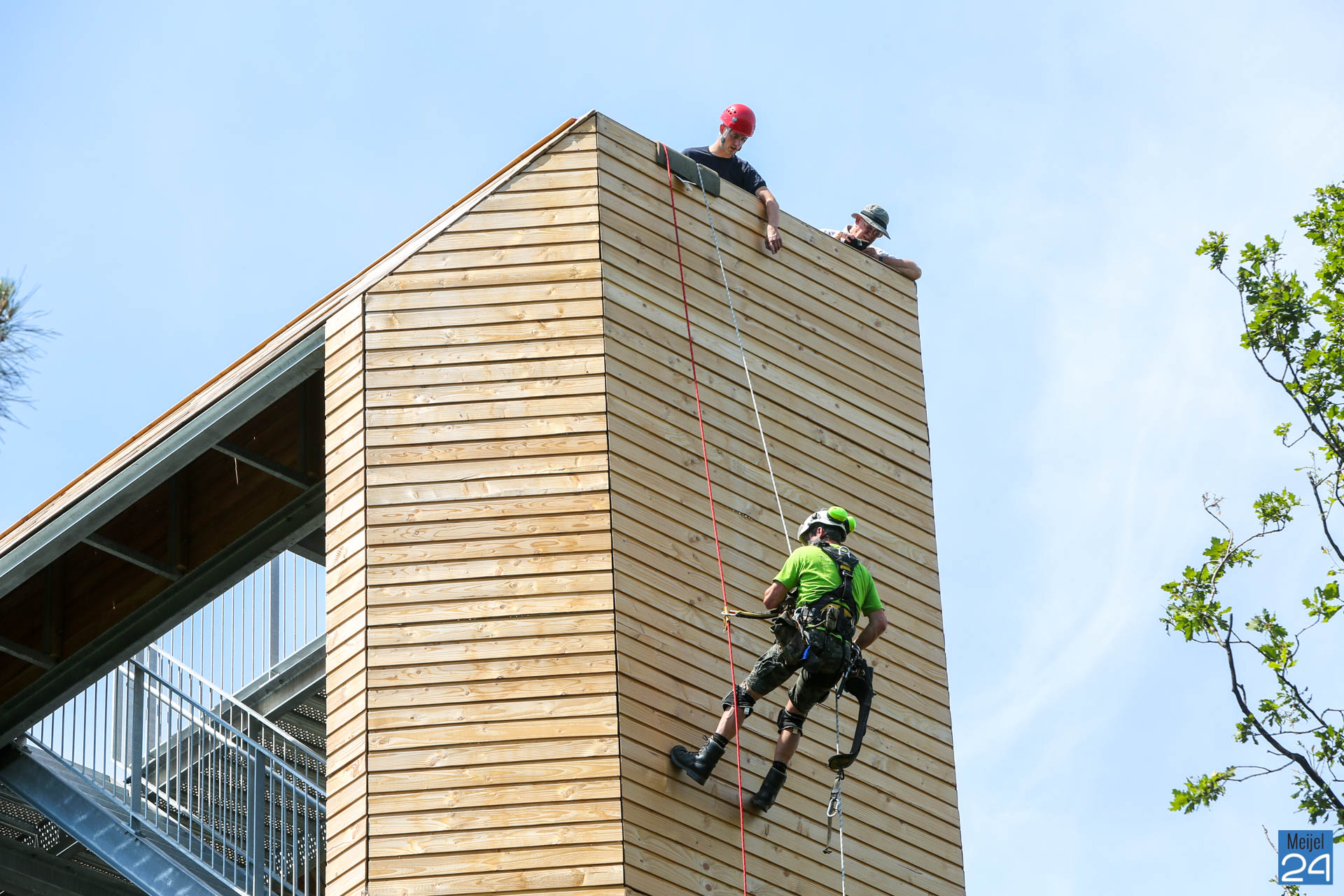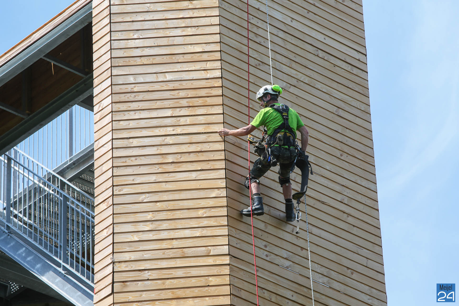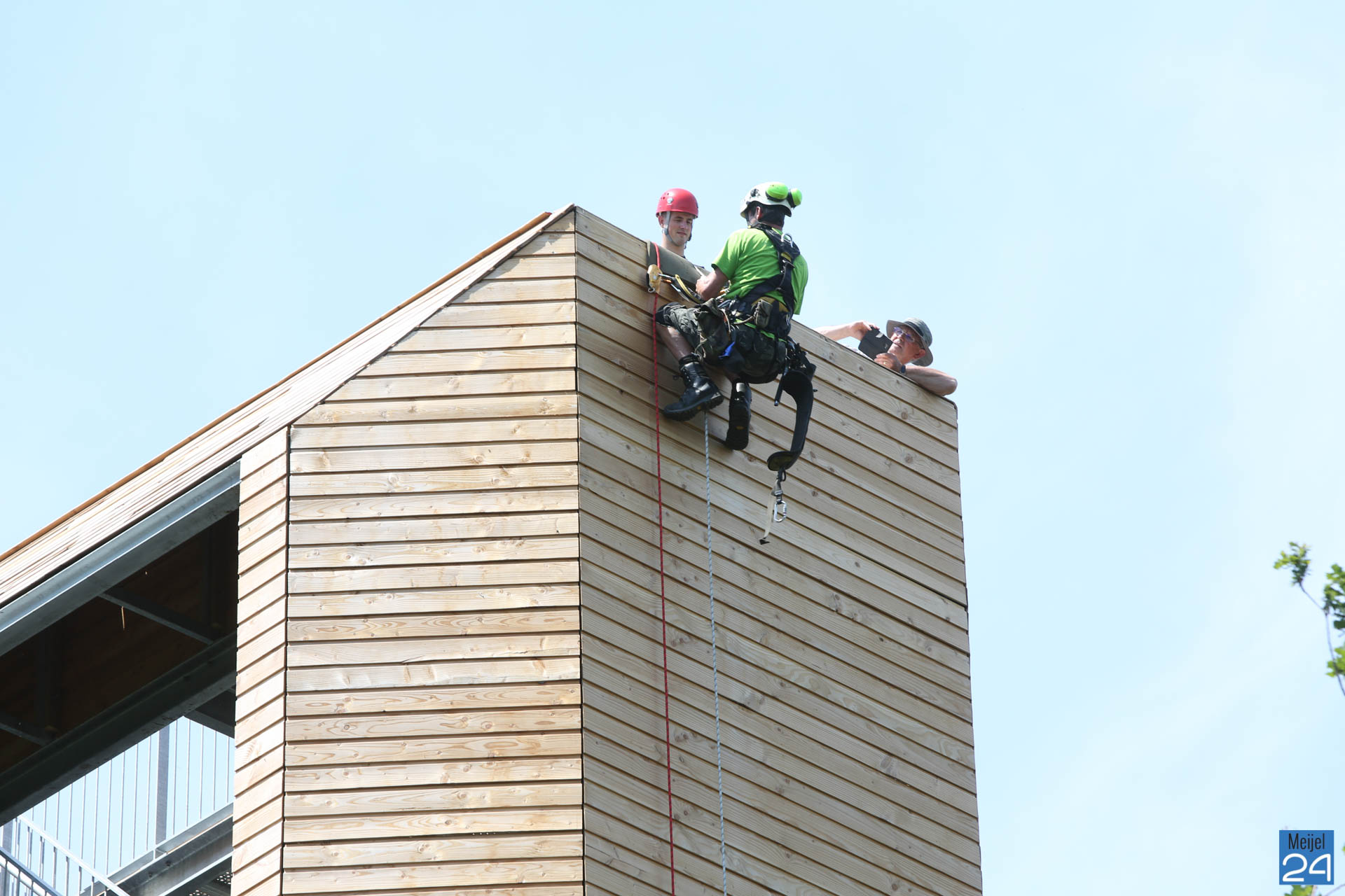 Dinsdagmiddag gingen Lennert en Joep van Adventure & Altitude vrijwillig naar boven om het Belfort te repareren. Gezekerd aan een touw ging Lennert langzaam naar beneden naar het beschadigde gedeelte. Daar werden de los getrapte planken weer vastgemaakt.