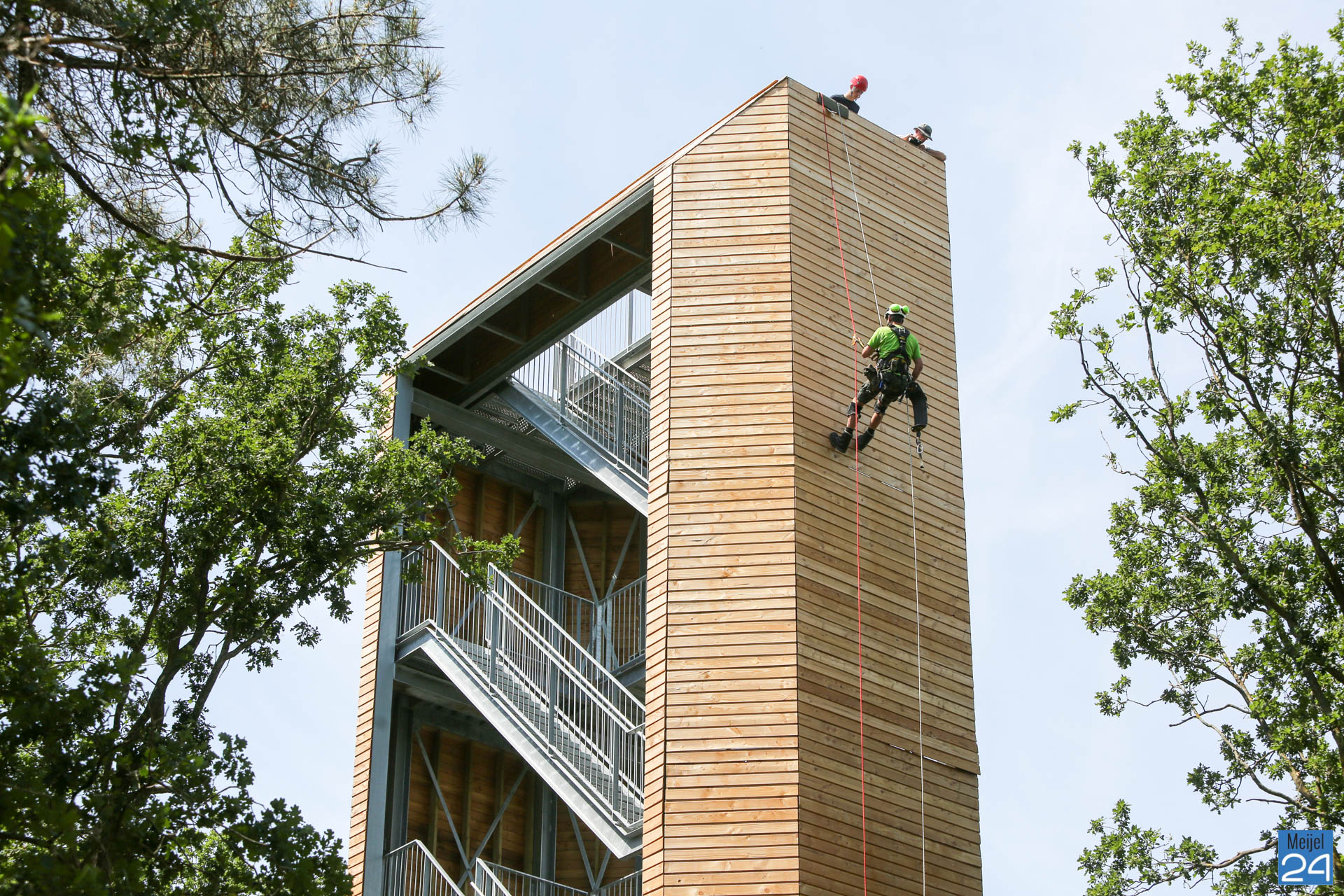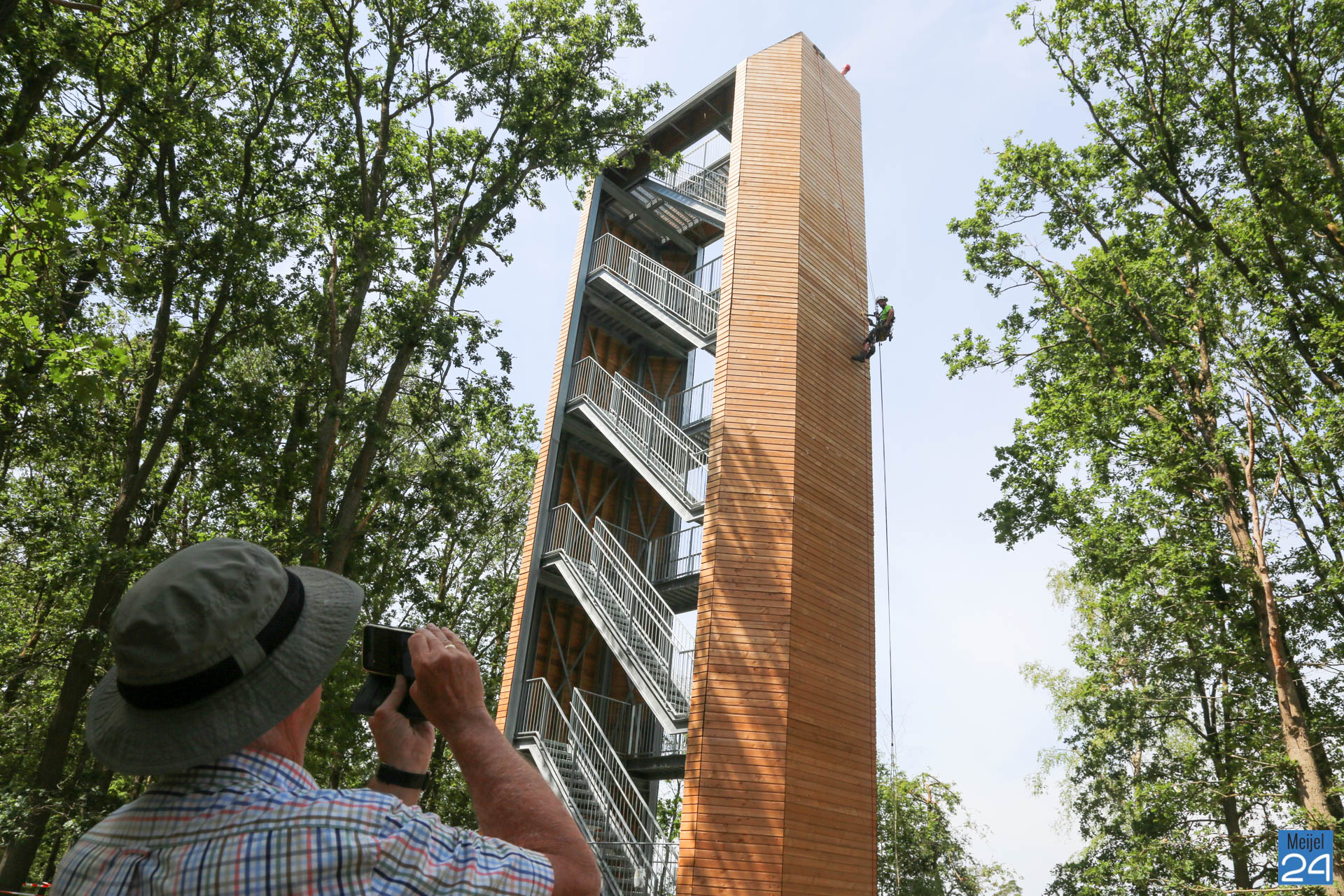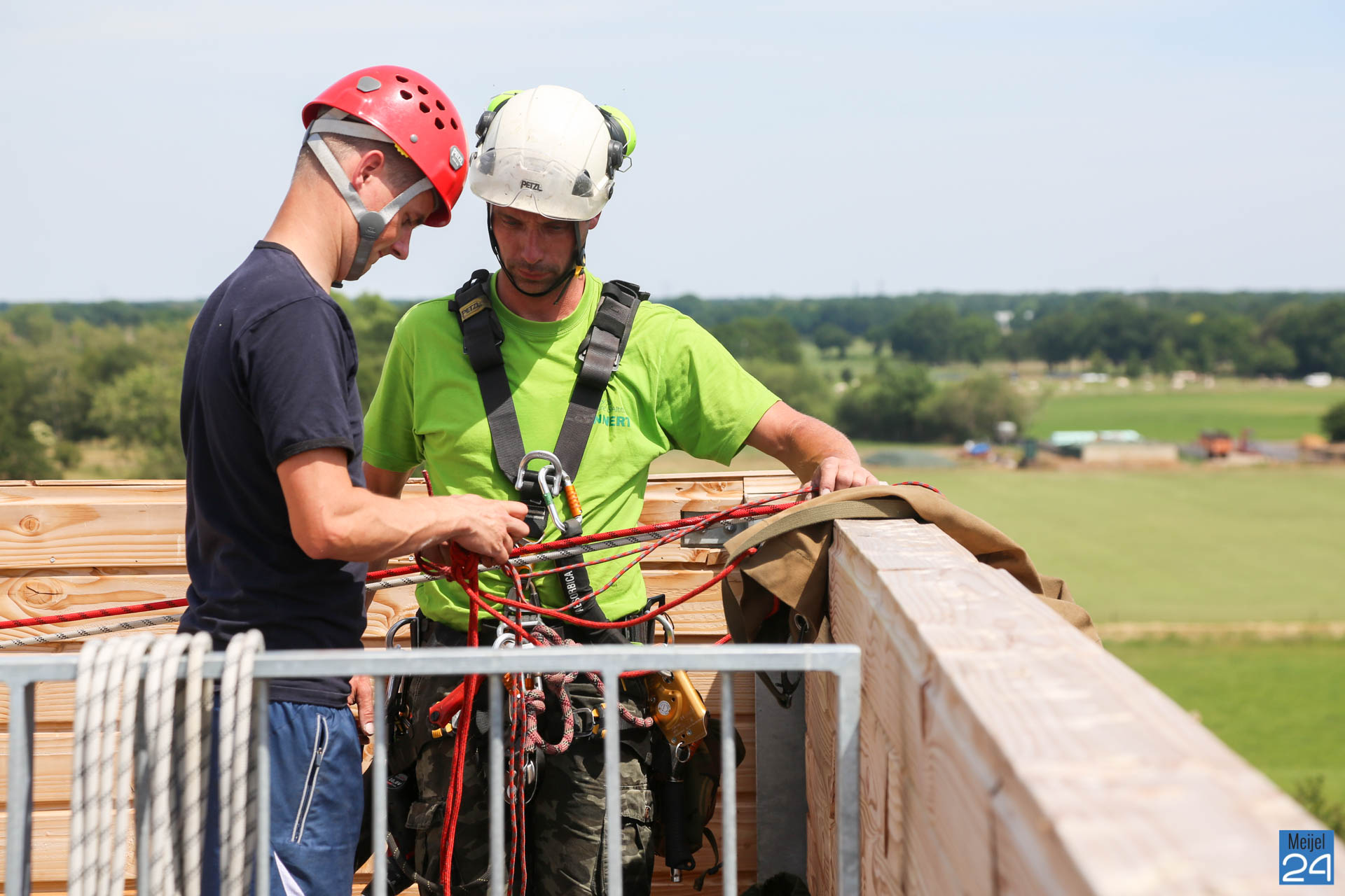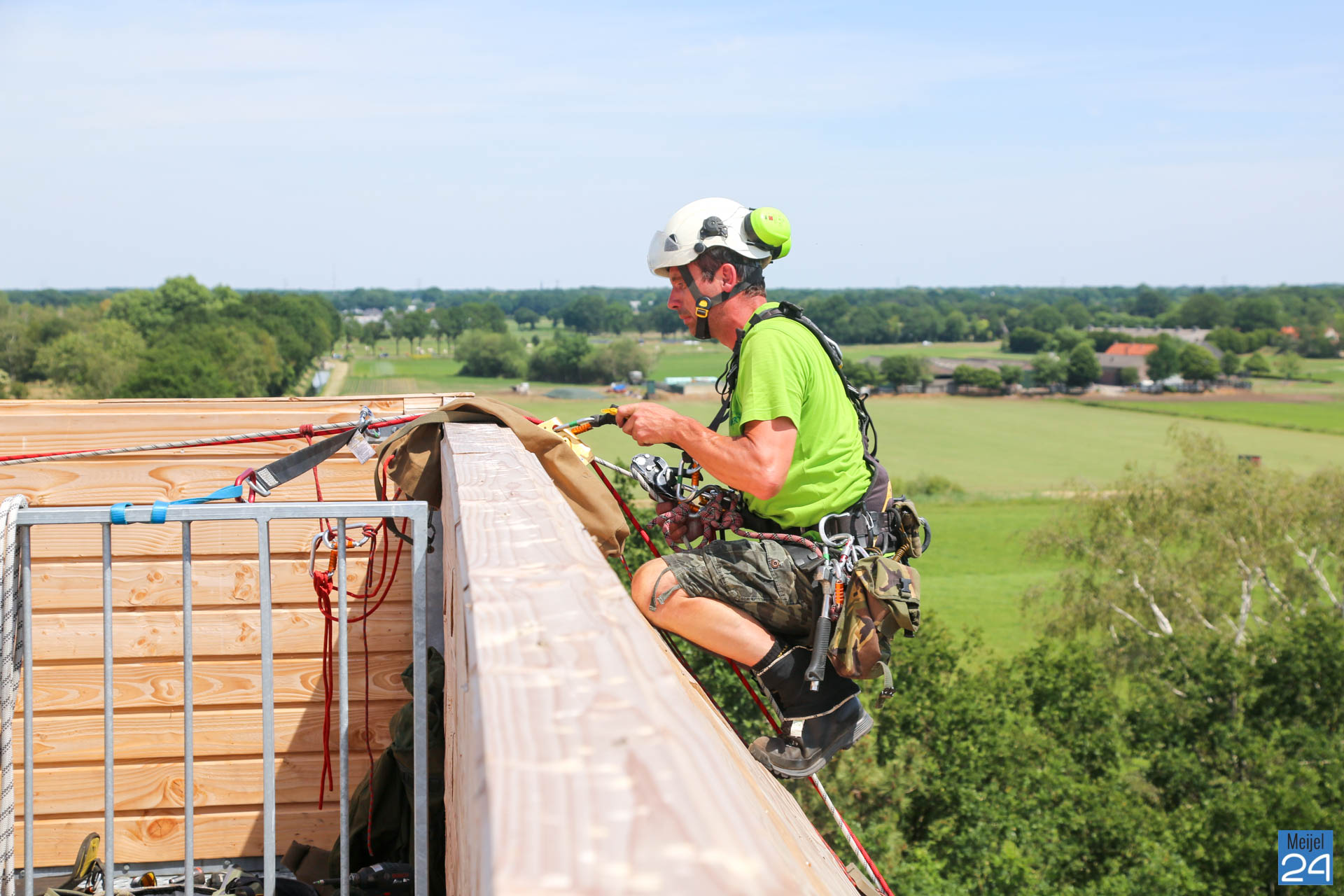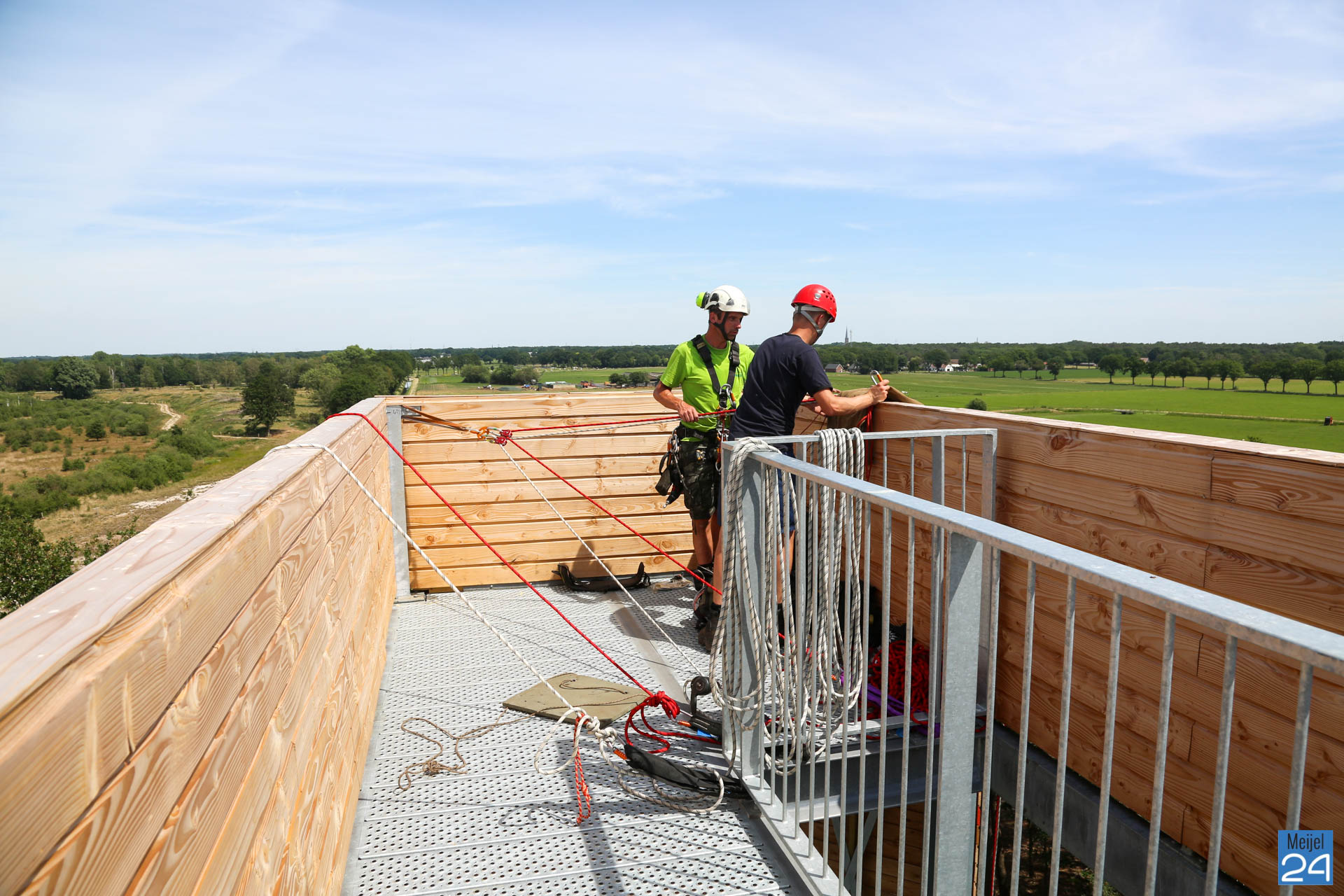 Dinsdagmiddag gingen Lennert en Joep van Adventure & Altitude vrijwillig naar boven om het Belfort te repareren. Gezekerd aan een touw ging Lennert langzaam naar beneden naar het beschadigde gedeelte. Daar werden de los getrapte planken weer vastgemaakt.