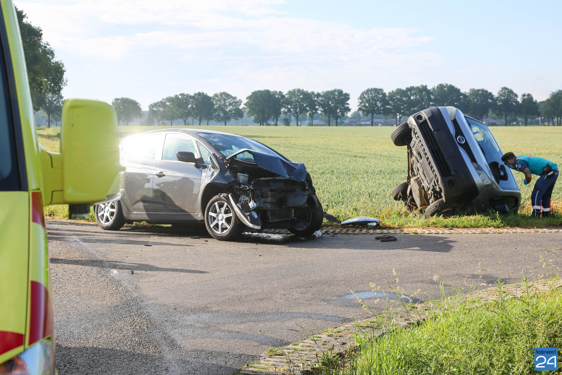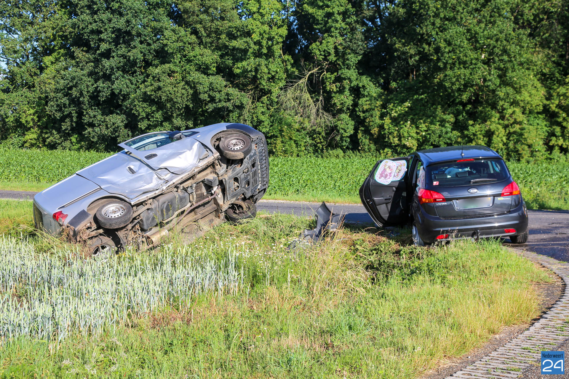 De schade aan de voertuigen is groot. Eén van de twee betrokken auto’s kwam in de greppel terecht. Een berger heeft de voertuigen opgehaald.