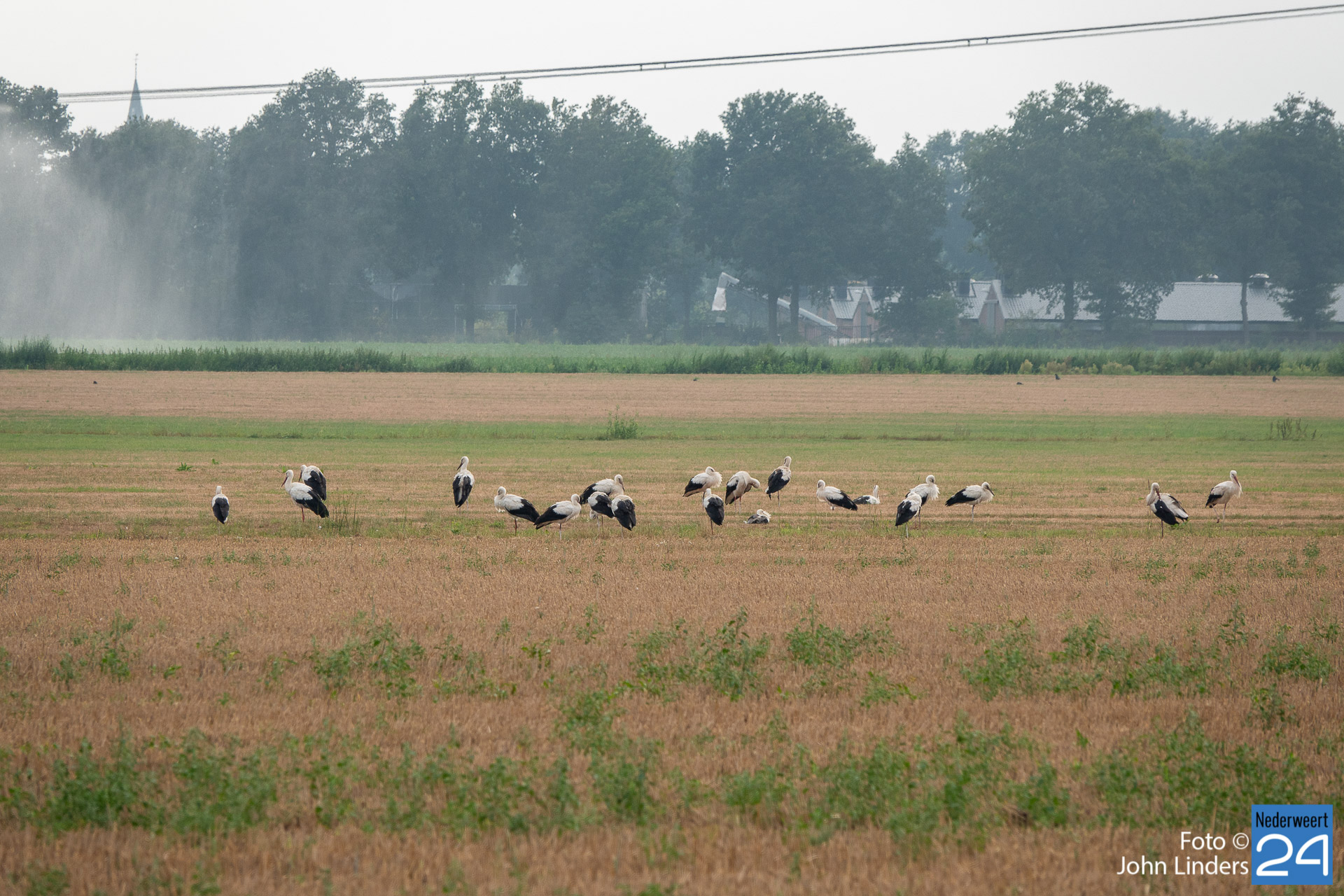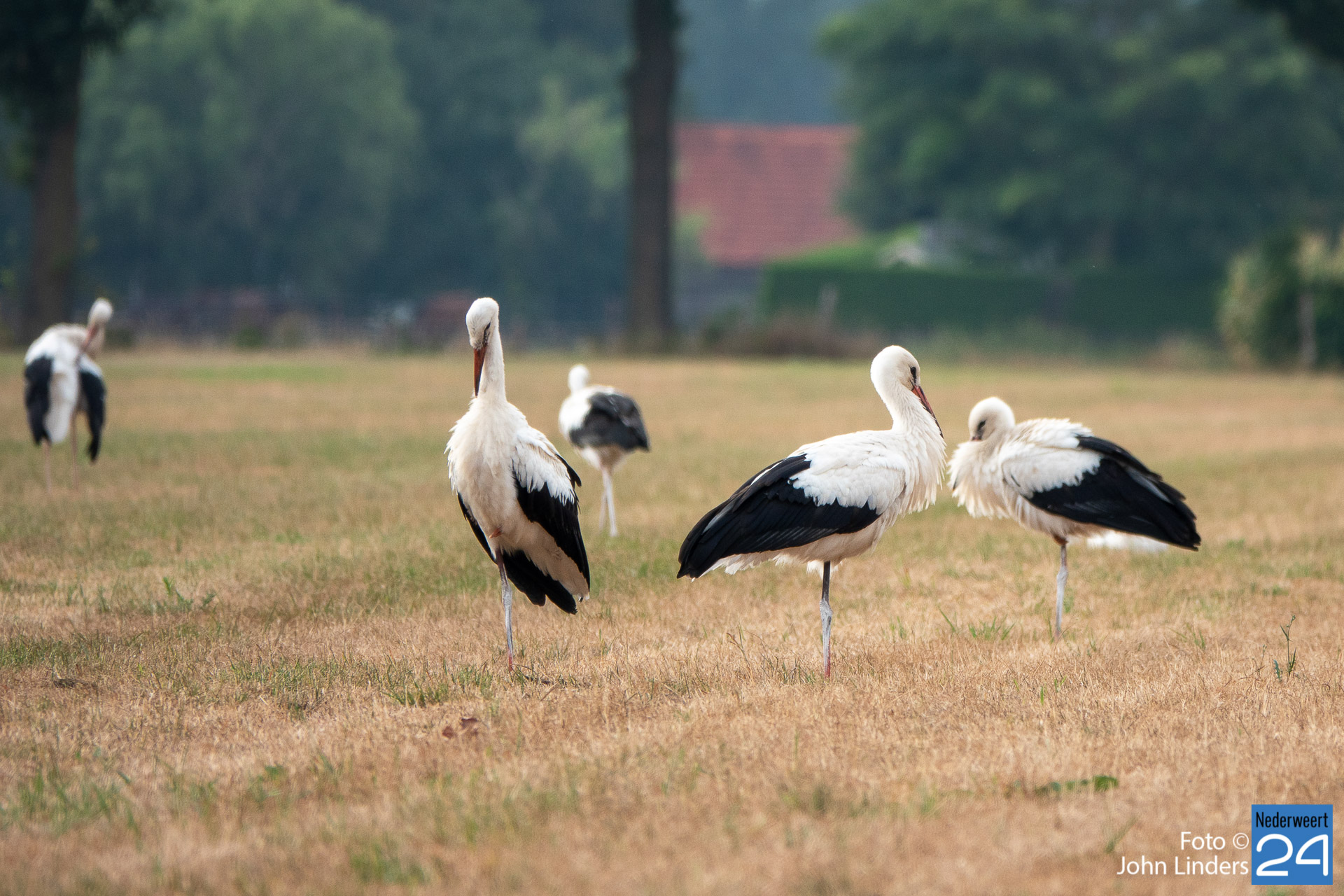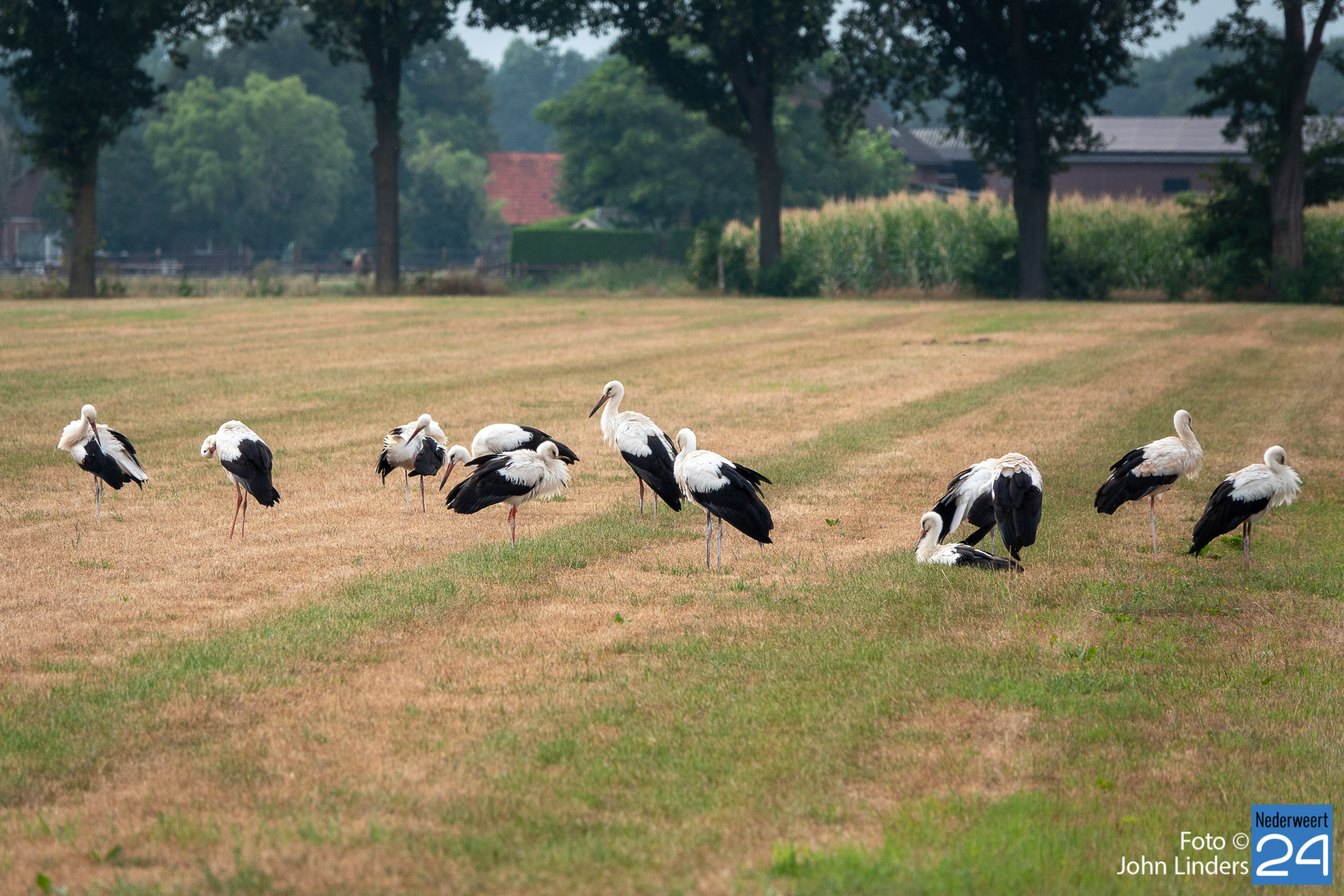 In een weiland aan de Kruisvennendijk in Ospeldijk zijn zaterdagavond ongeveer dertig ooievaars neergestreken. Een bijzonder gezicht wat zorgde voor het nodige bekijks.