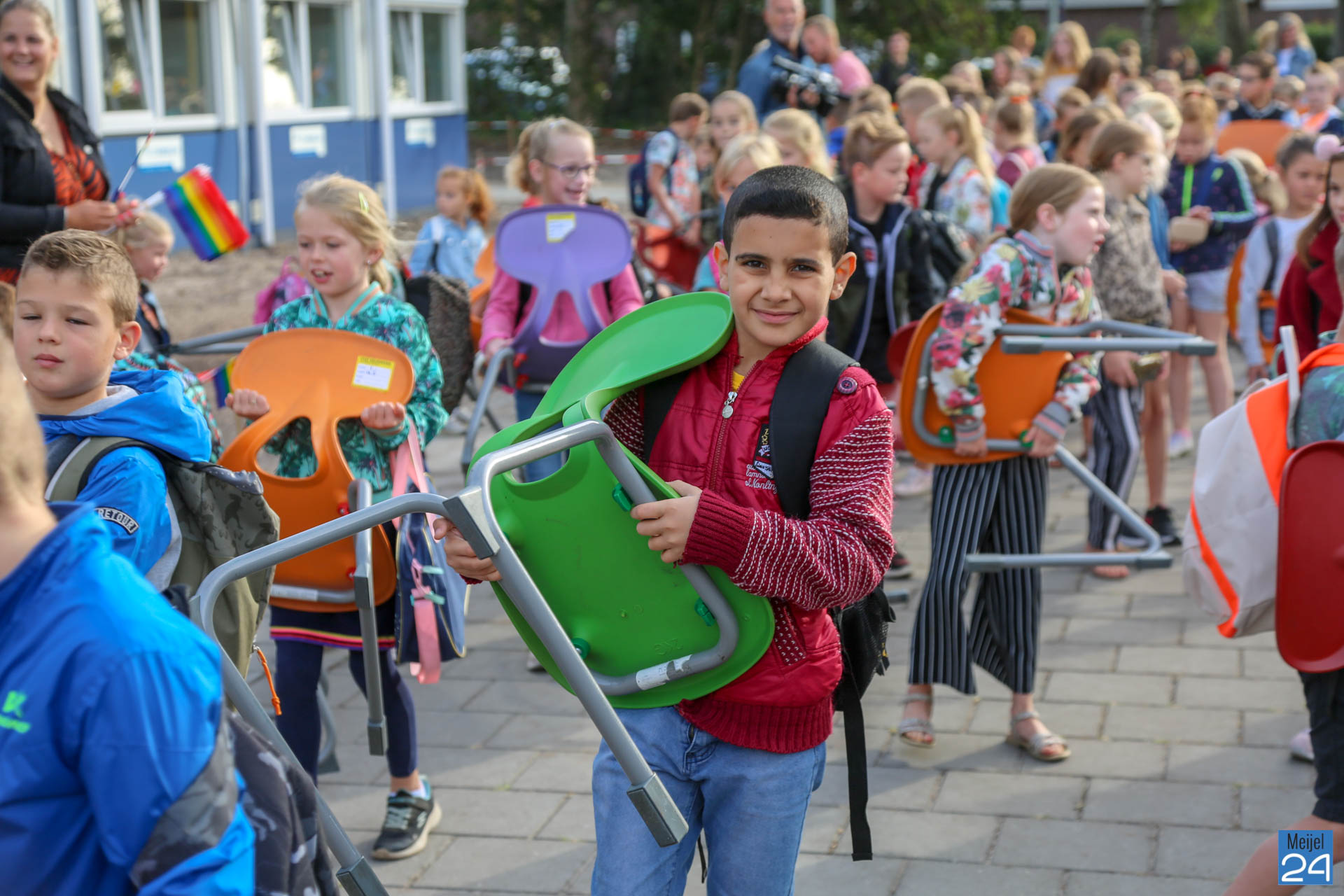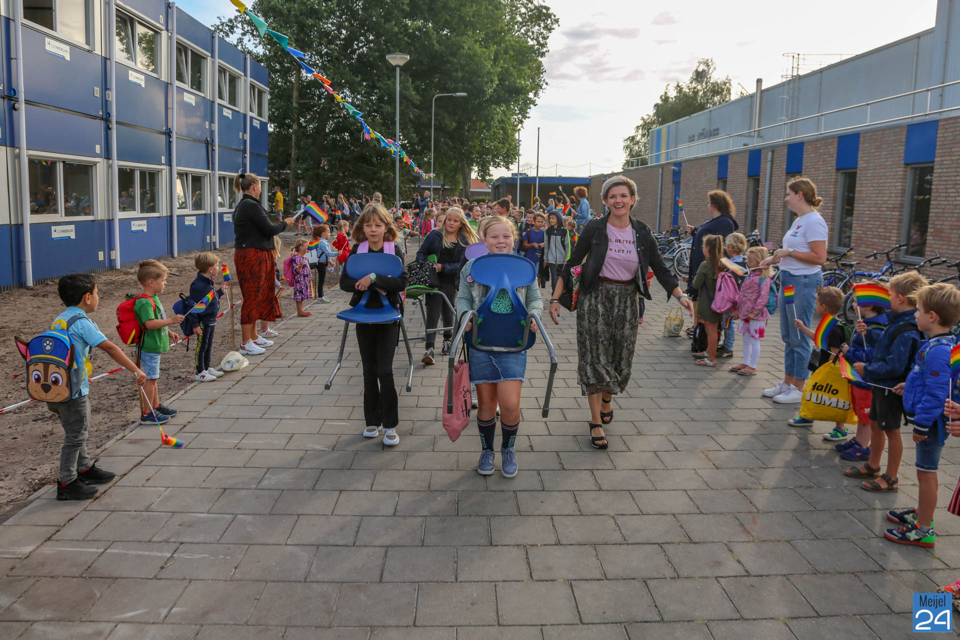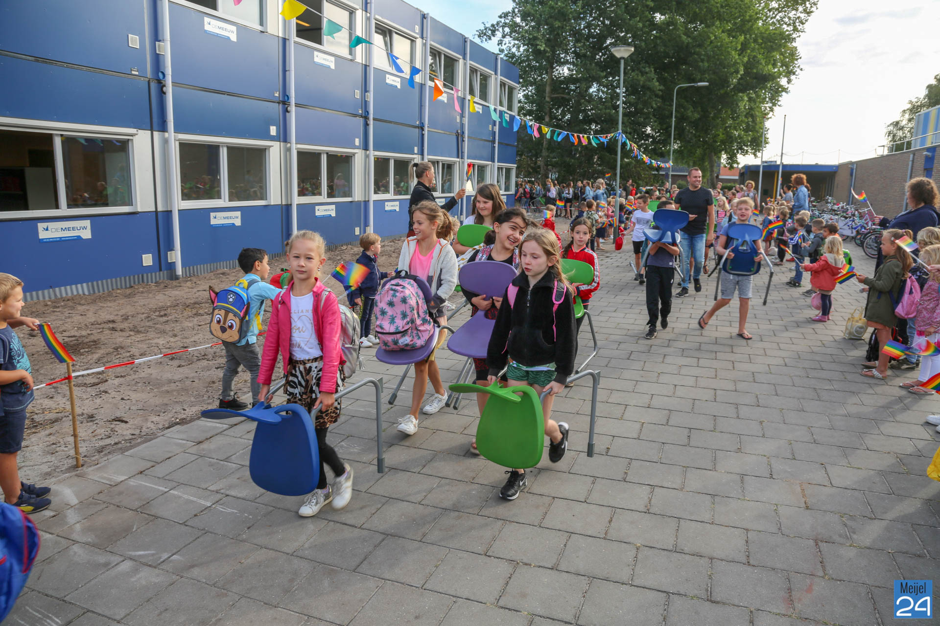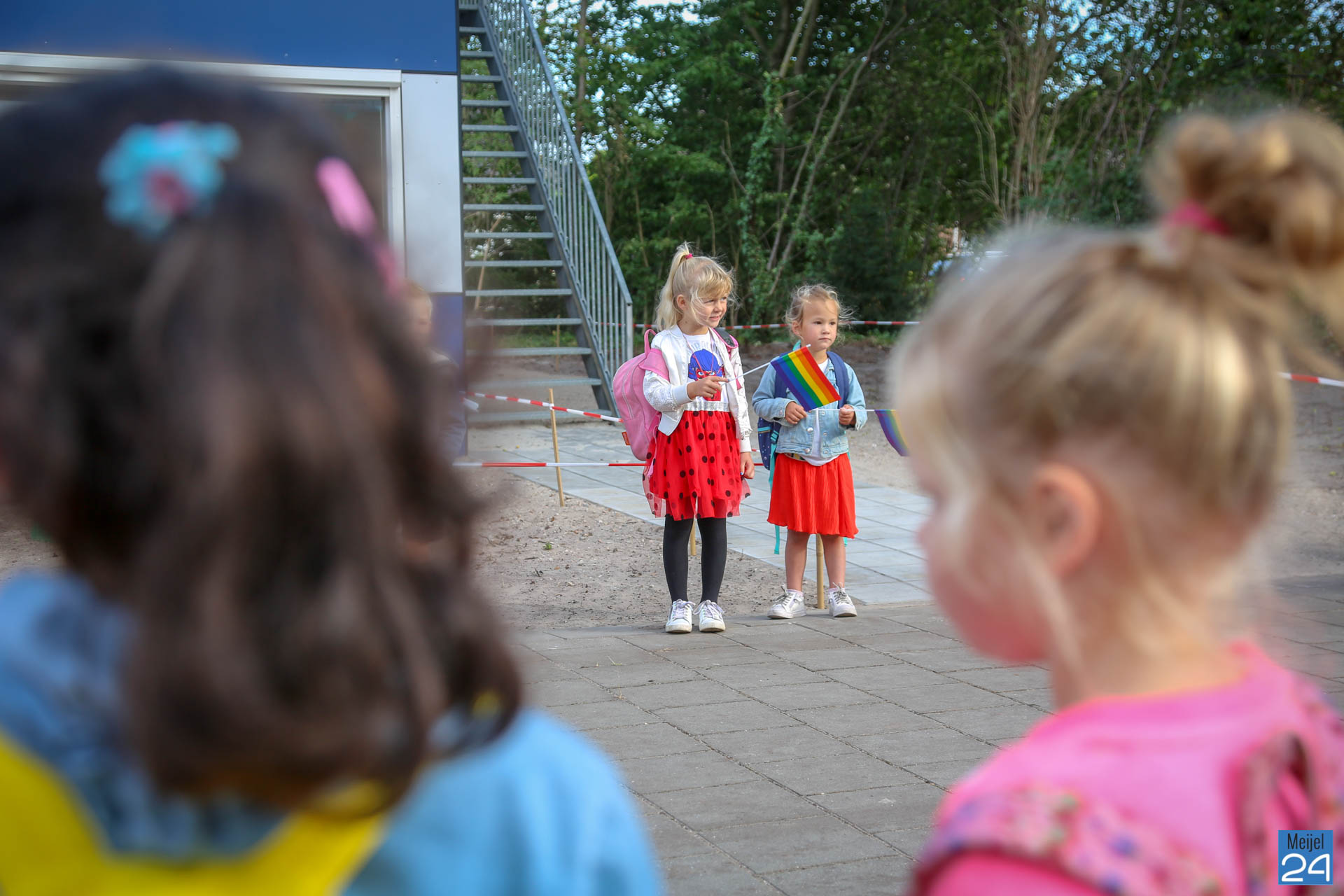De kleuters vormden maandagmorgen met vlaggetjes een erehaag voor de overige studenten. Zij liepen, met stoel in de hand, vanuit het oude gebouw naar de tijdelijke voorziening.