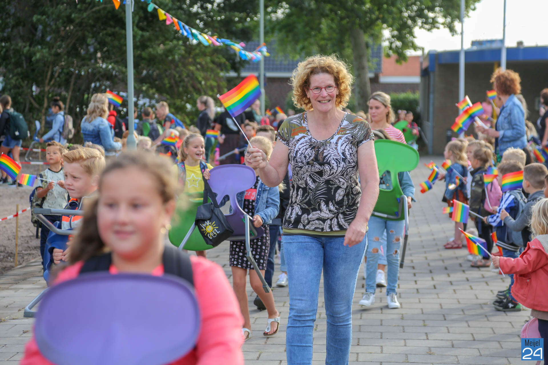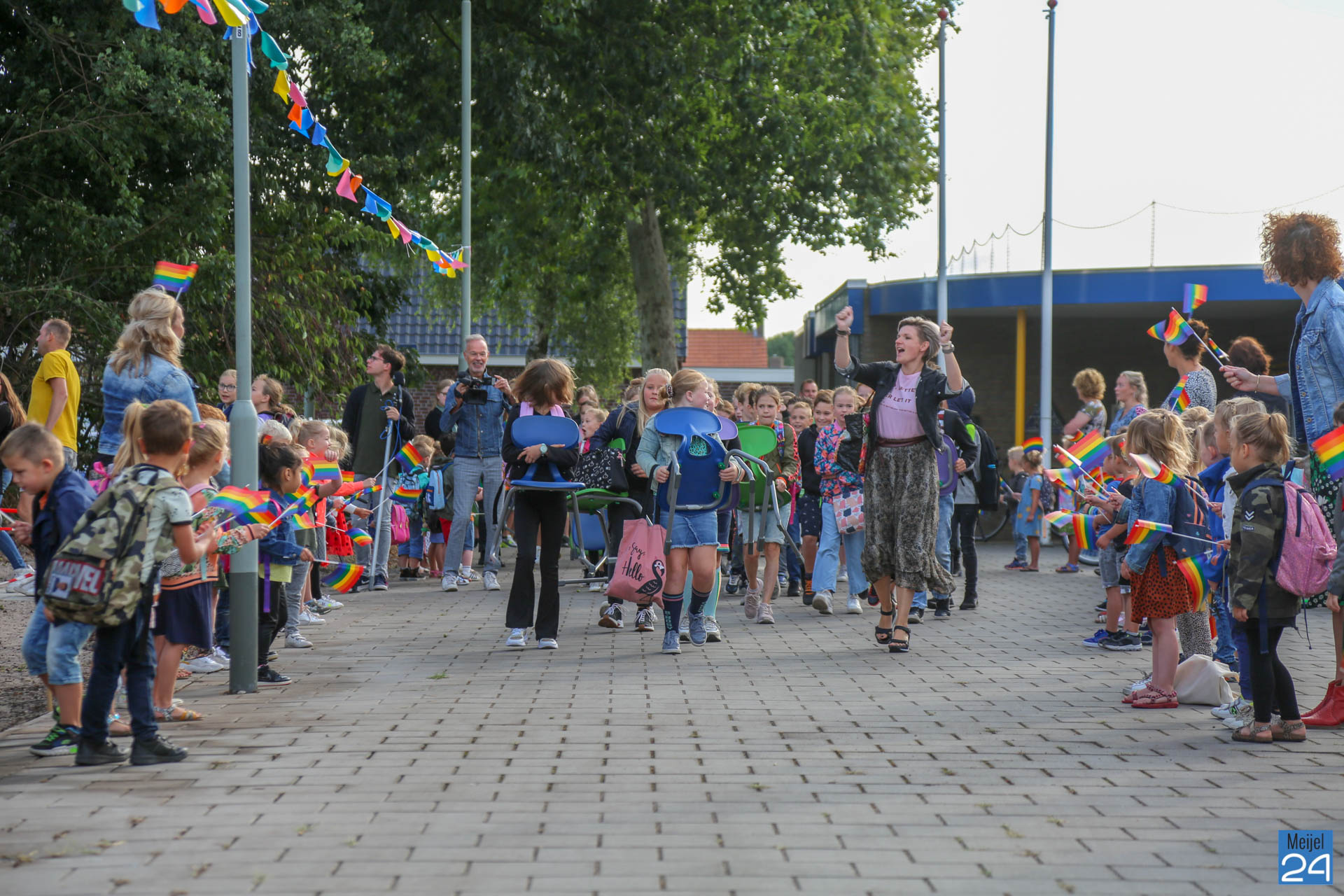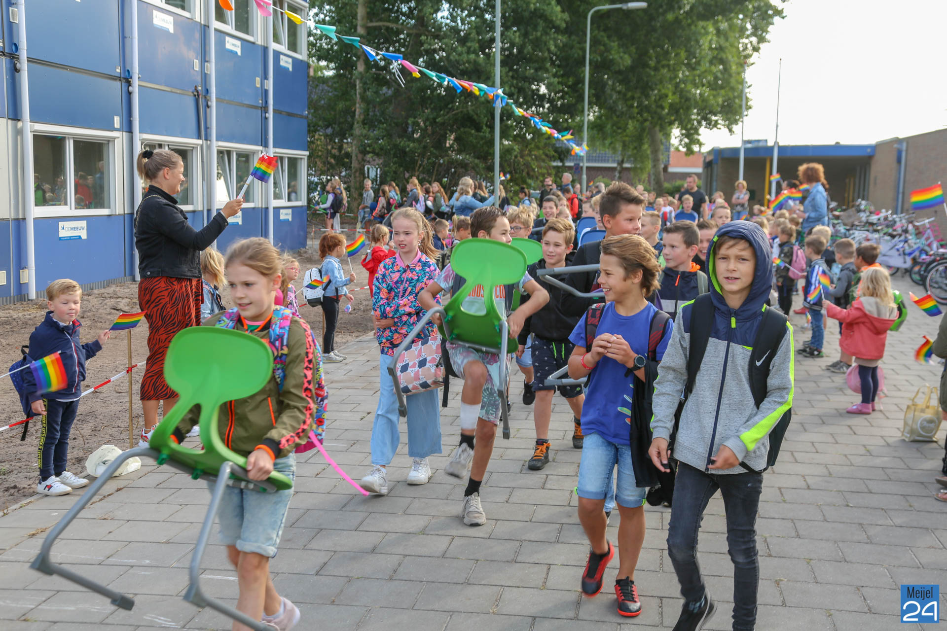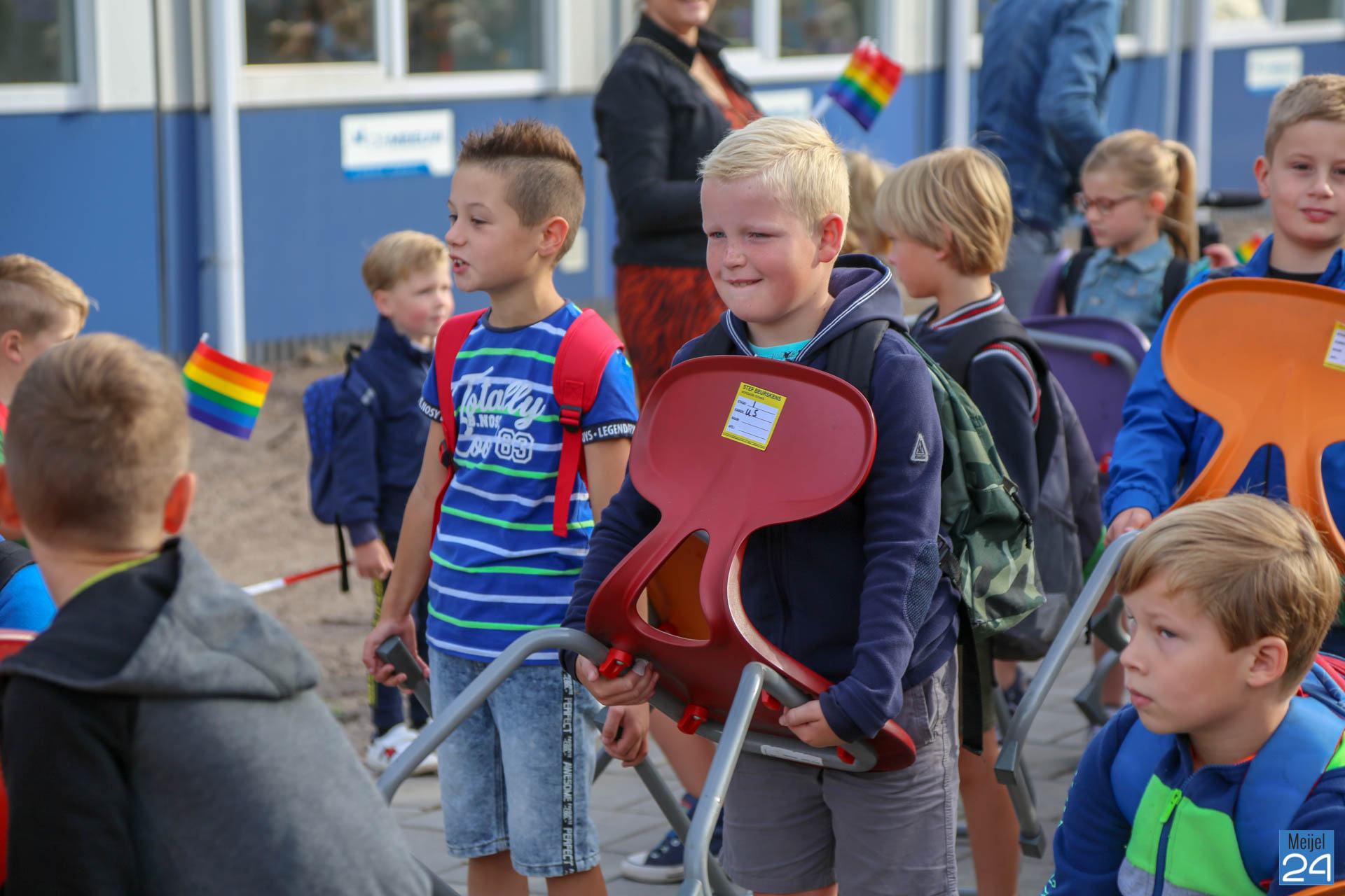 De kleuters vormden maandagmorgen met vlaggetjes een erehaag voor de overige studenten. Zij liepen, met stoel in de hand, vanuit het oude gebouw naar de tijdelijke voorziening.