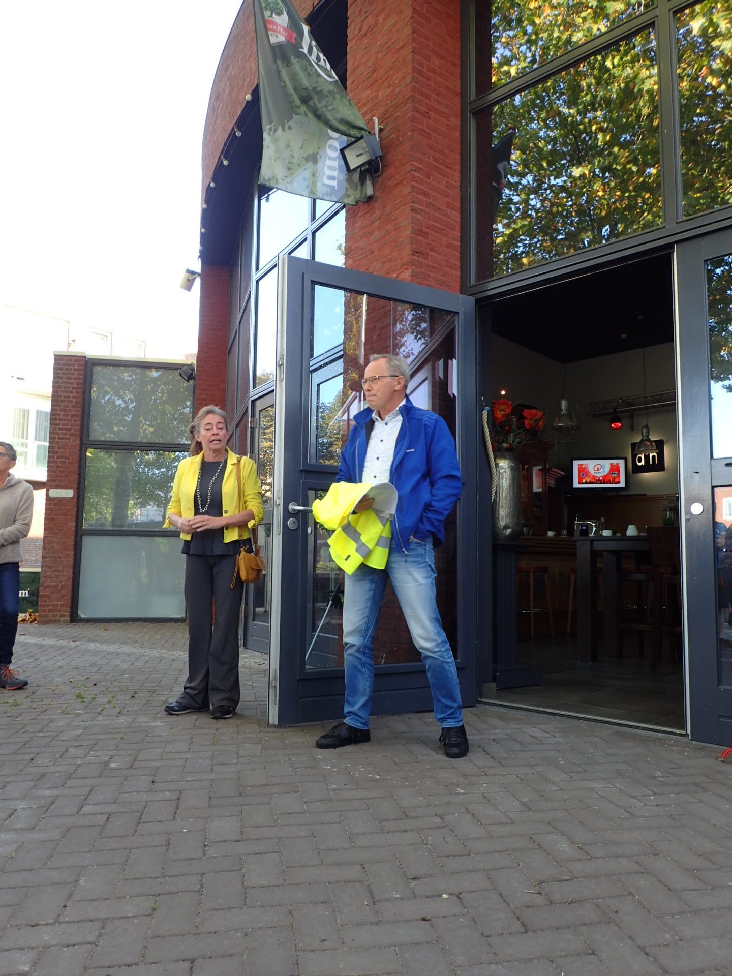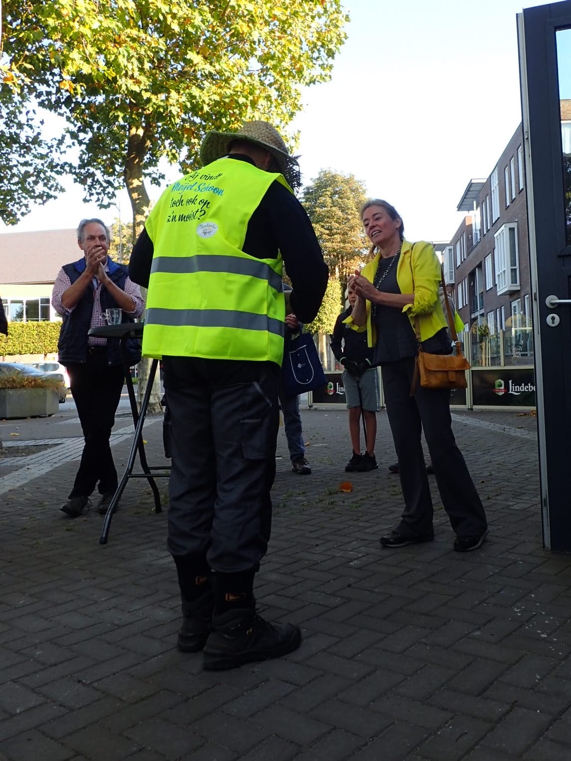 Naast het schoner maken van Meijel werd er ook een speciaal voor Meijel Schoon ontworpen veiligheidshesje gepresenteerd en uitgedeeld aan alle adoptanten die gedurende het hele jaar in Meijel een straat of gebied zwerfafval vrij maken. Na het welkomstwoord van het team Meijel Schoon was het de eer aan wethouder Anget Mestrom om het eerste nieuwe hesje aan te bieden. De wethouder bedankte team Meijel Schoon voor z’n inzet en resultaten en reikte daarna het eerste hesje uit aan Marc Graus, werkzaam bij Oppe Koffie. Marc was al lang voordat Meijel Schoon opgericht werd bezig het zwerfafval rond de kern van Meijel op te ruimen en heeft hiervoor al eens een waarderingslintje ontvangen van de gemeente.