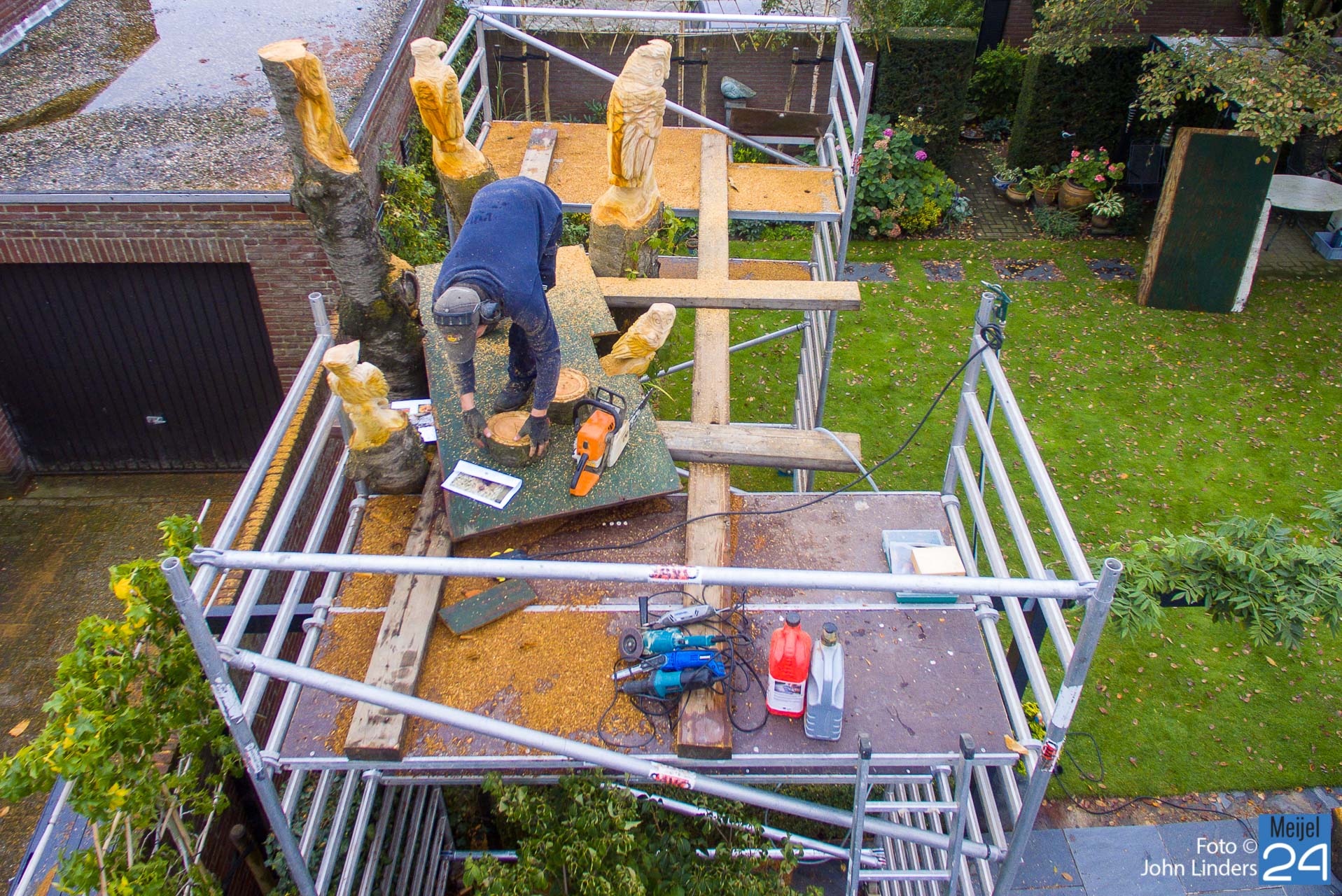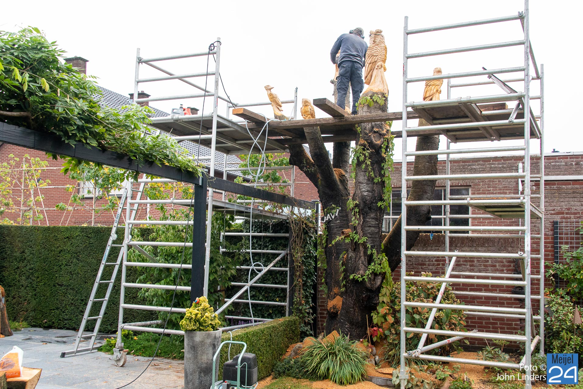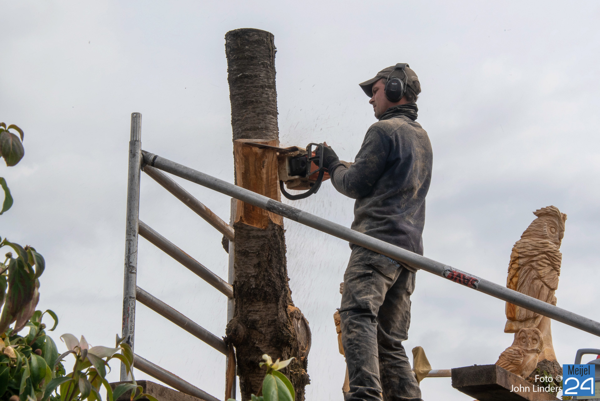 In Meijel aan de Prins Bernhardstraat is de stam van een oude kersenboom omgetoverd tot een kunstwerk. Lars Cuijpers uit Beringe nam de opdracht aan om met de kettingzaag, lamellenfrees, dremel en schuurpapier op elk van de vijf uiteinden een mooie creatie te maken.