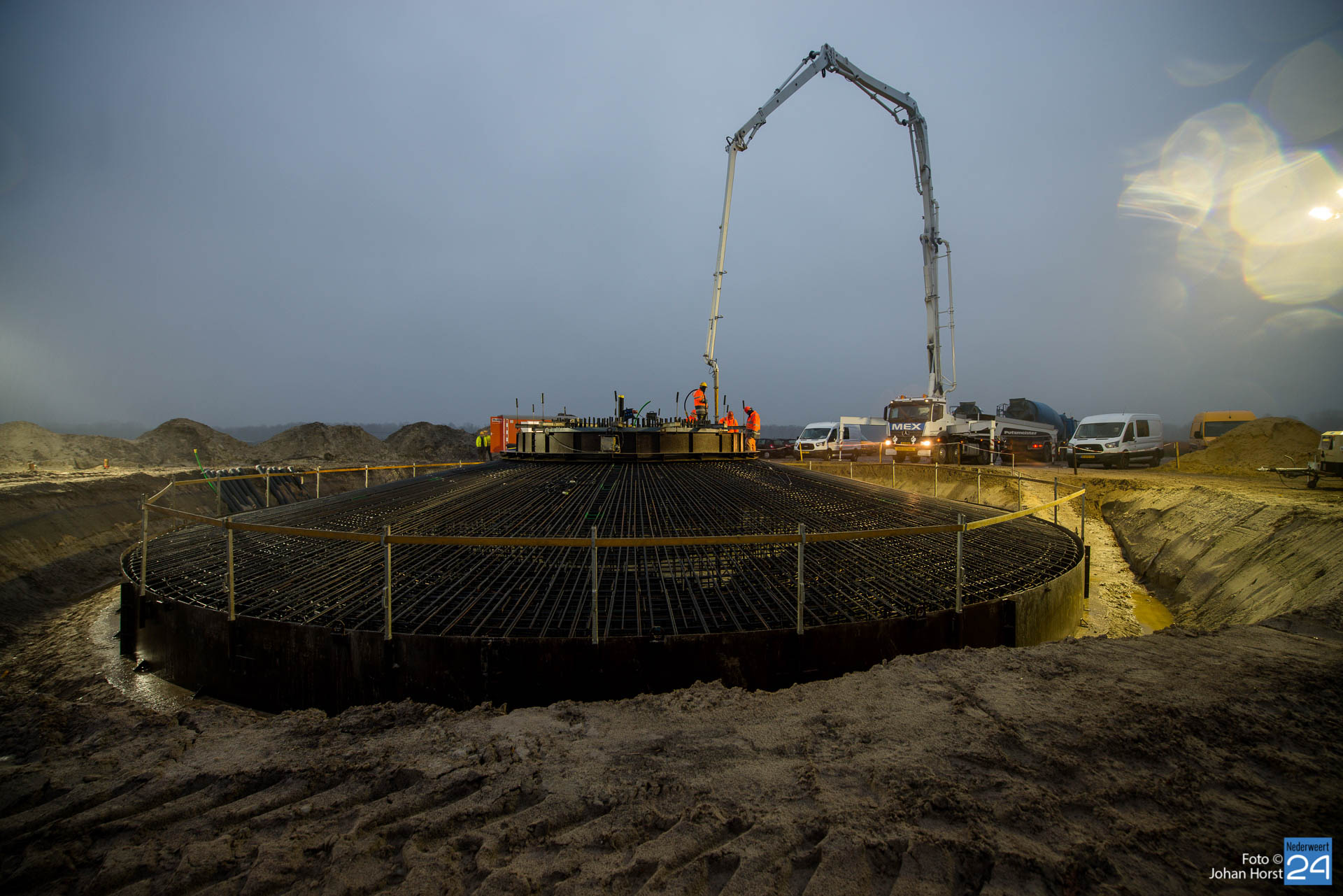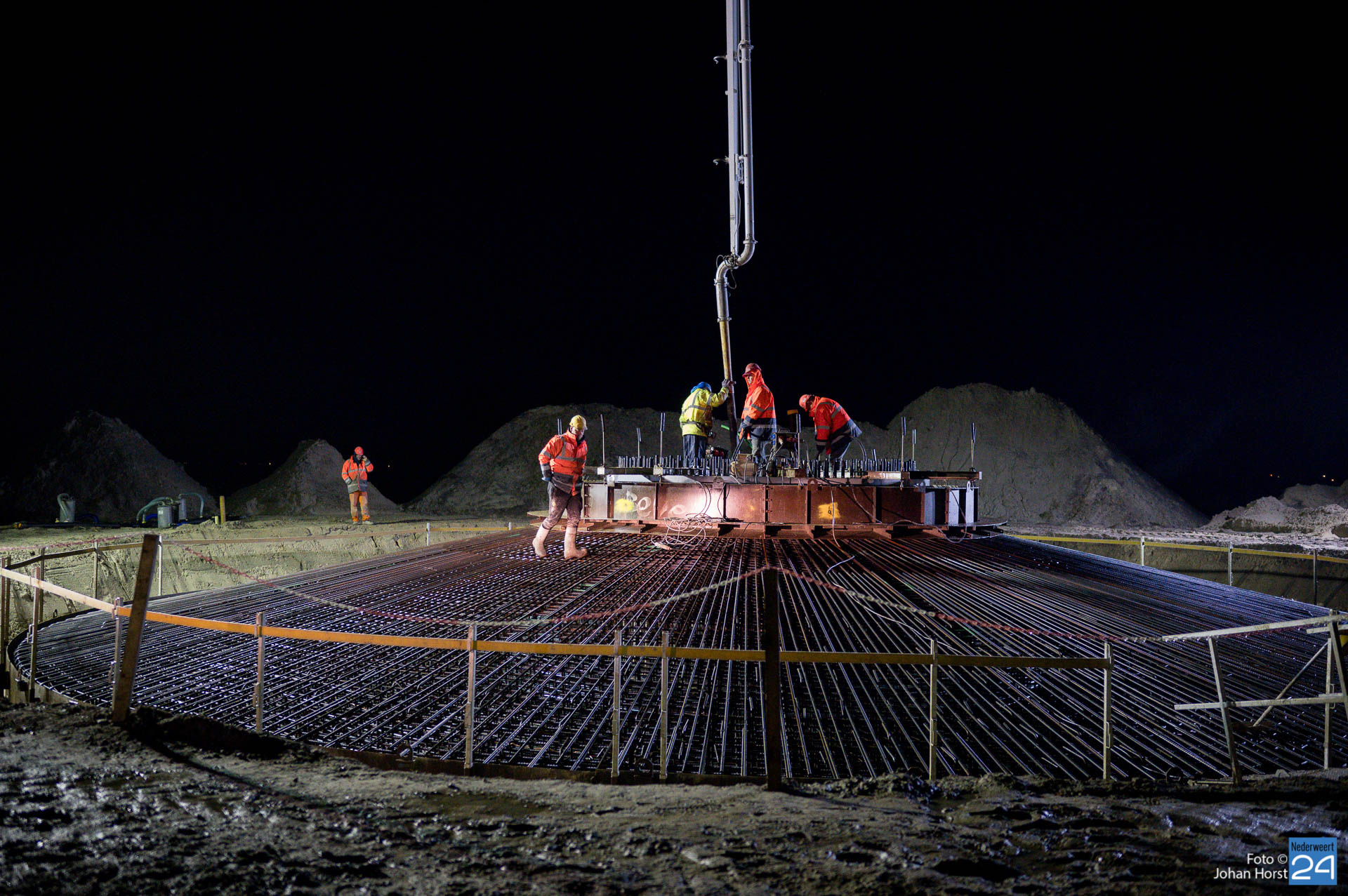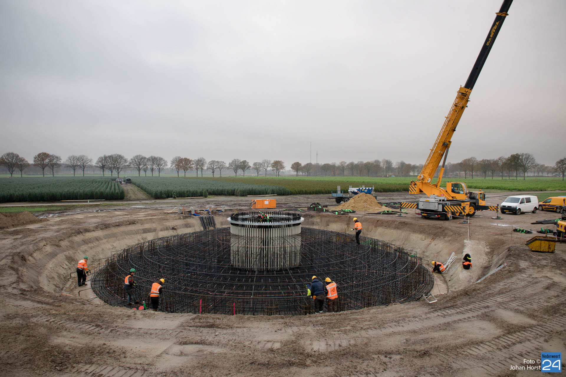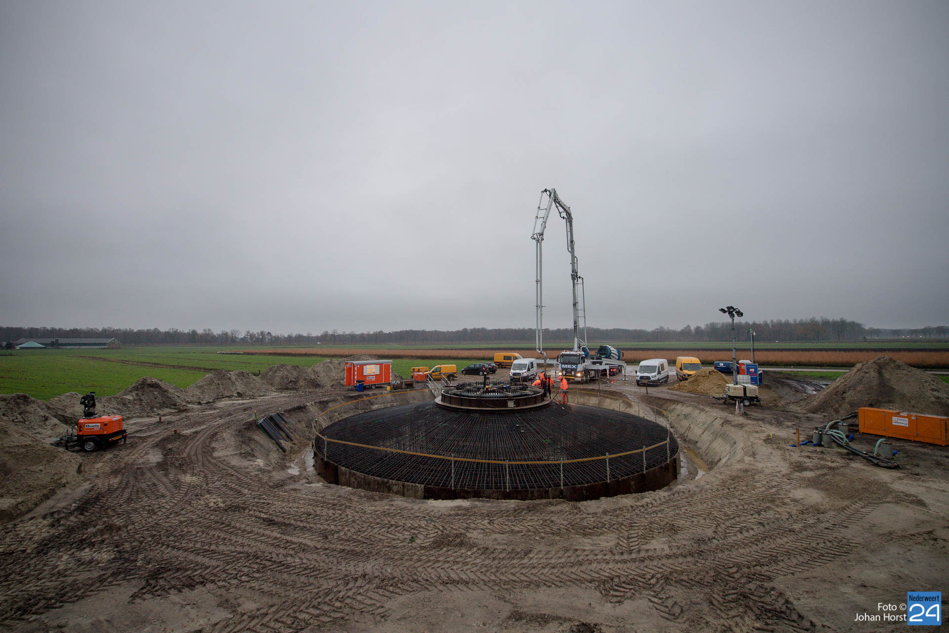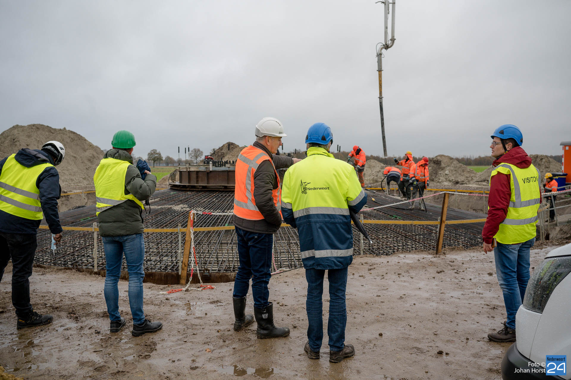 In Ospeldijk bouwt Zuidenwind samen met WML vier Nordex-windturbines. Het zijn dezelfde type molens als onlangs gebouwd in Heibloem, maar dan met een masthoogte van 135 meter. Men is momenteel druk bezig met het aanbrengen van de fundering. Elke fundering is goed voor circa 600 m3 beton, dat zijn flink wat vrachten die naar Ospel worden gereden. Vroeg beginnen is dan ook vanzelfsprekend. Dinsdagmorgen kwam een delegatie van de gemeente een kijkje nemen.