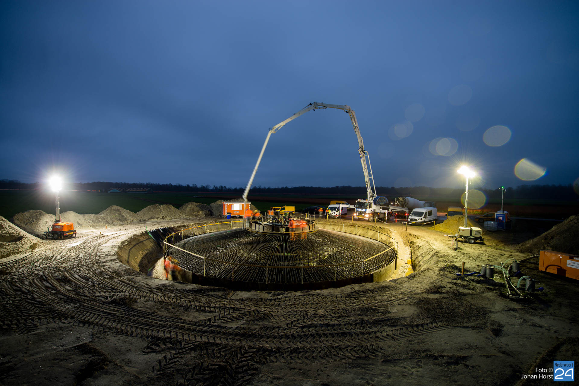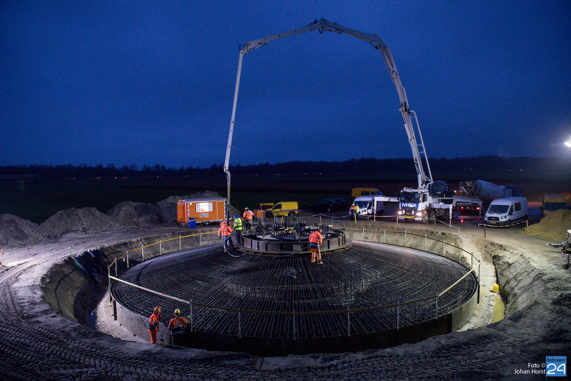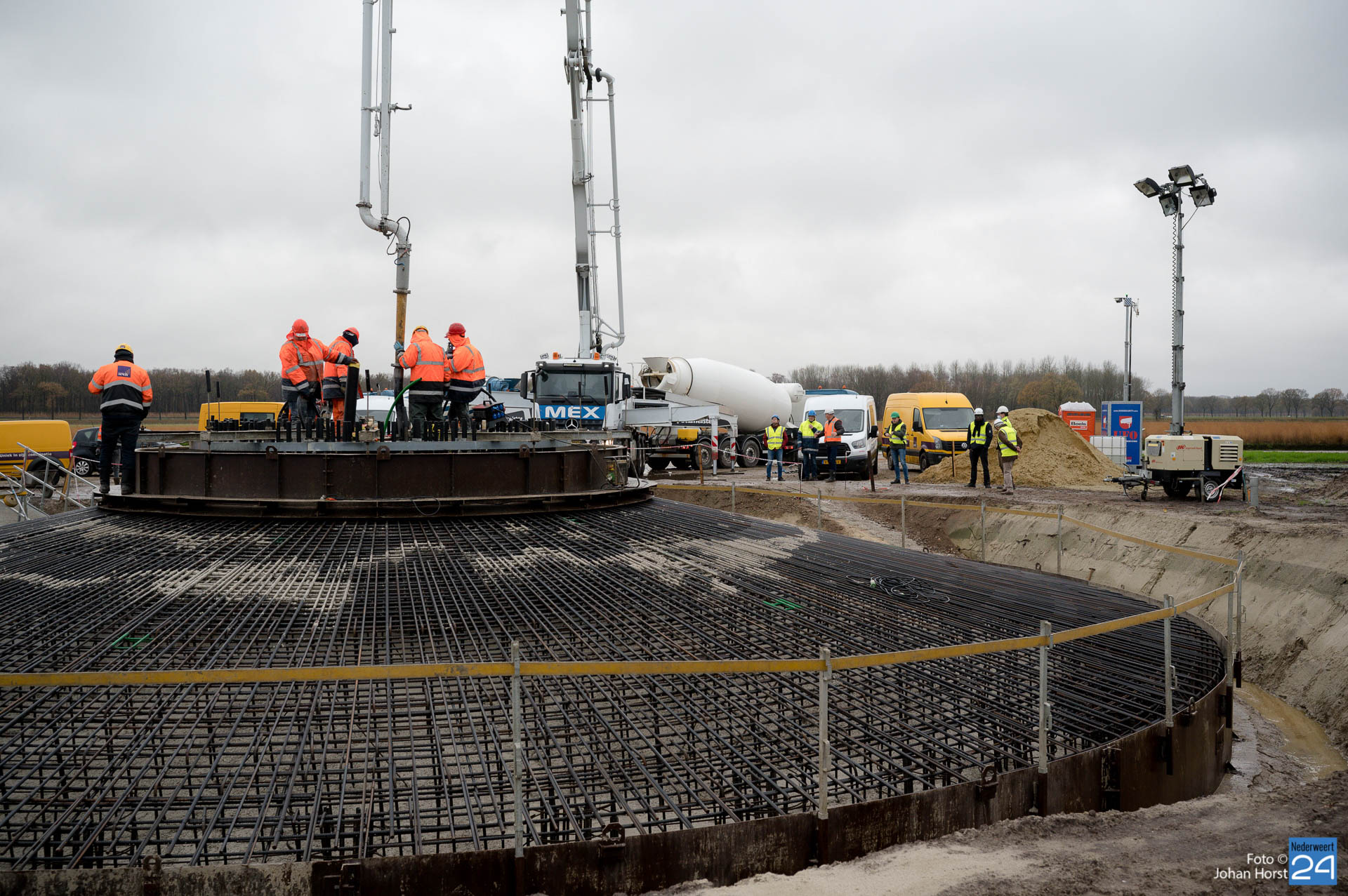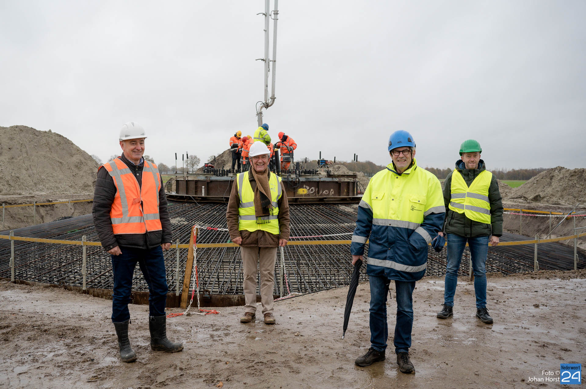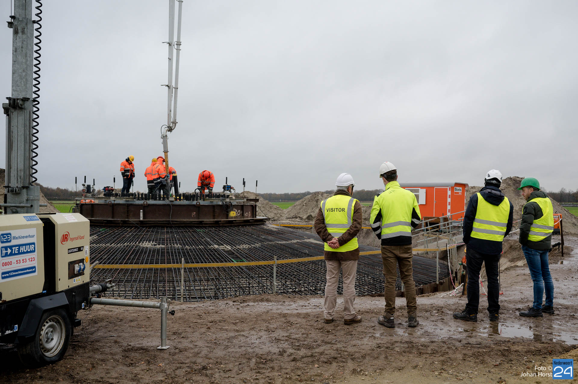 In Ospeldijk bouwt Zuidenwind samen met WML vier Nordex-windturbines. Het zijn dezelfde type molens als onlangs gebouwd in Heibloem, maar dan met een masthoogte van 135 meter. Men is momenteel druk bezig met het aanbrengen van de fundering. Elke fundering is goed voor circa 600 m3 beton, dat zijn flink wat vrachten die naar Ospel worden gereden. Vroeg beginnen is dan ook vanzelfsprekend. Dinsdagmorgen kwam een delegatie van de gemeente een kijkje nemen.