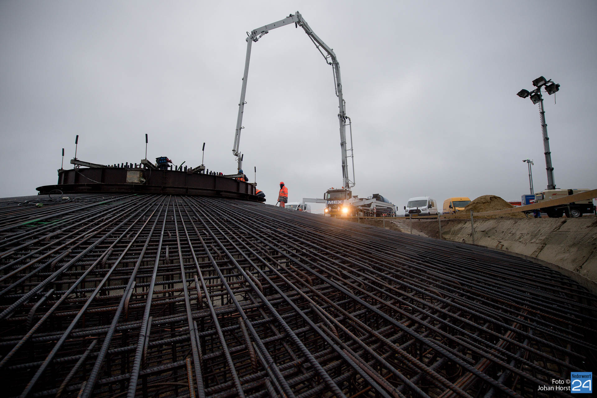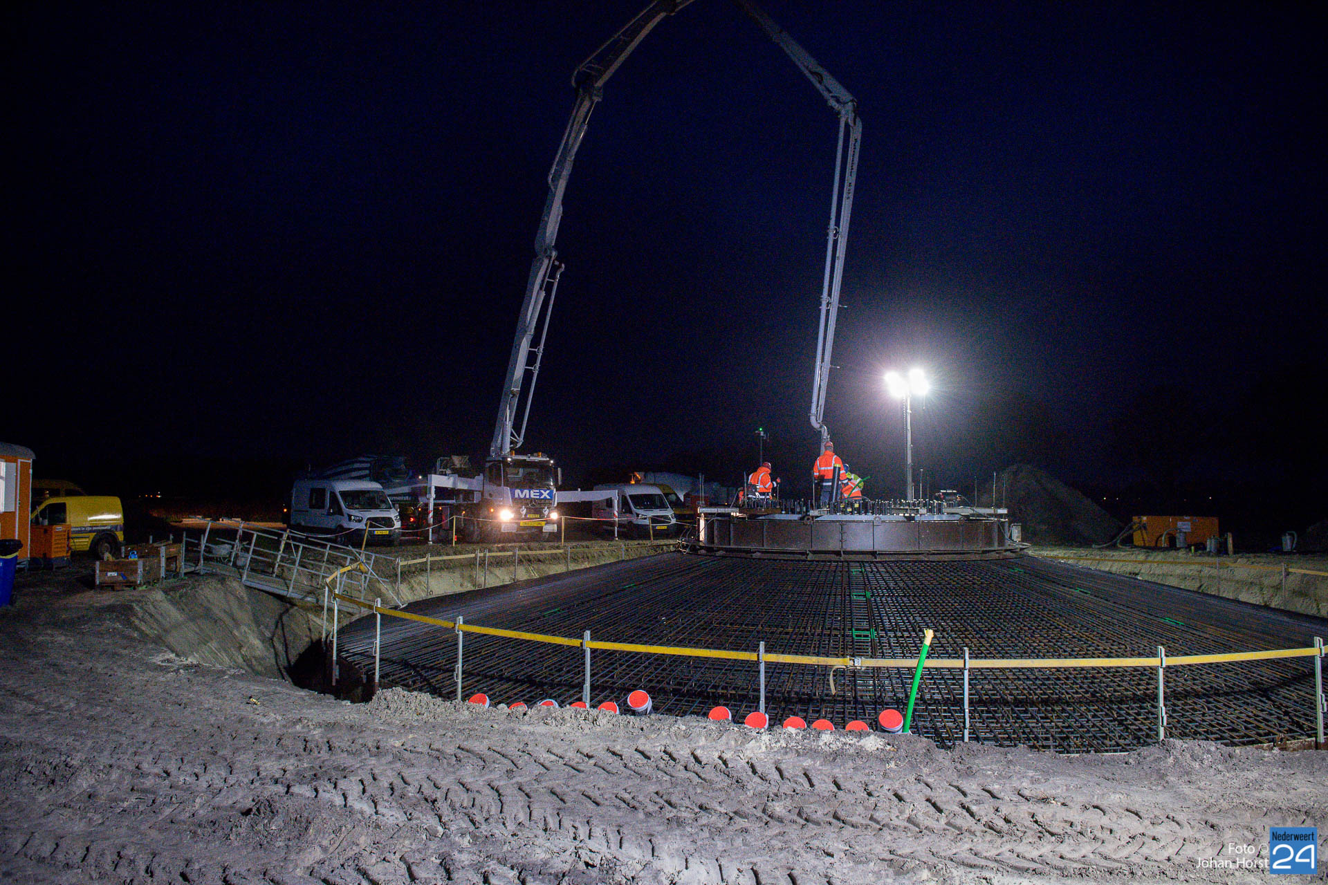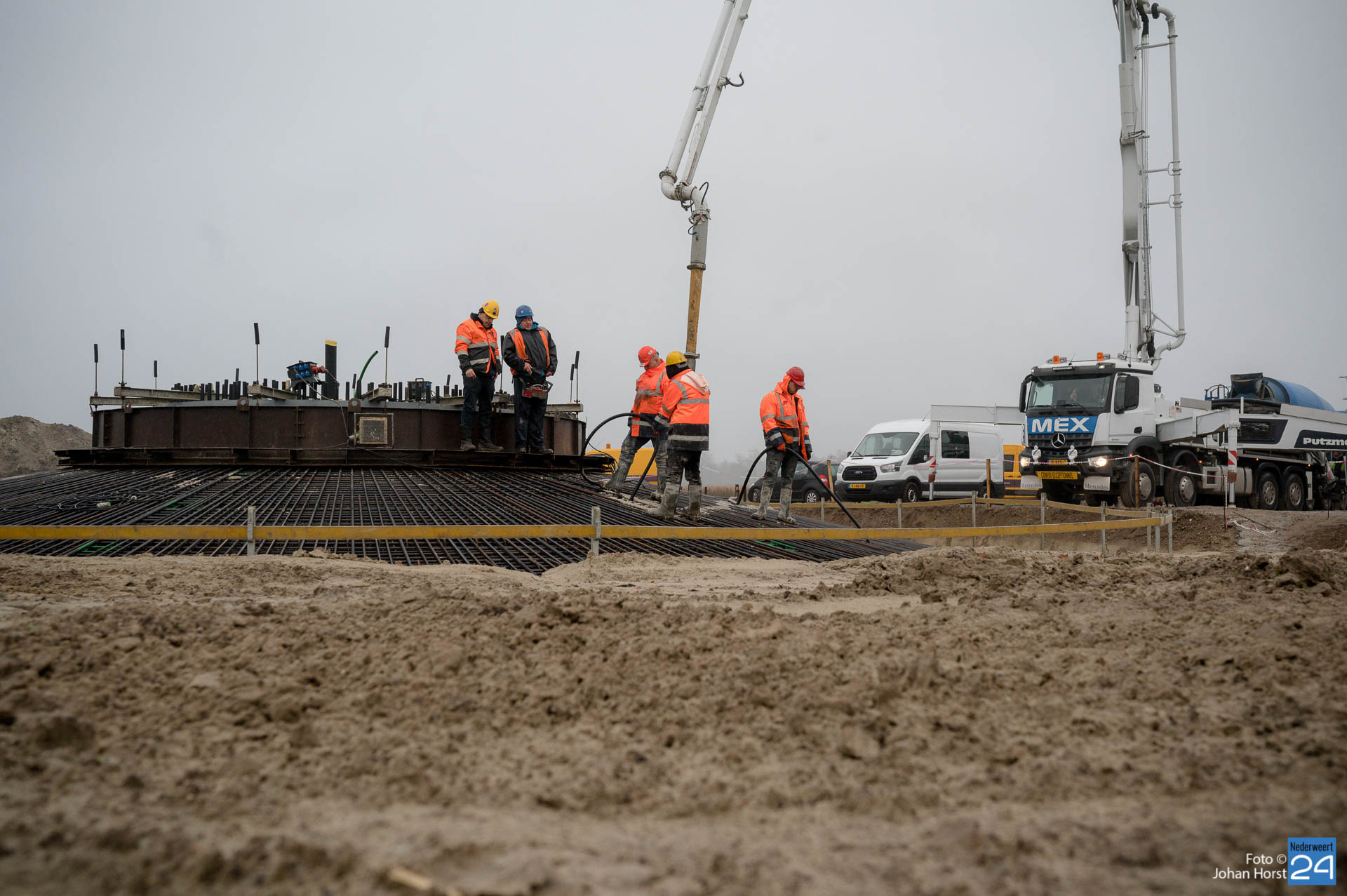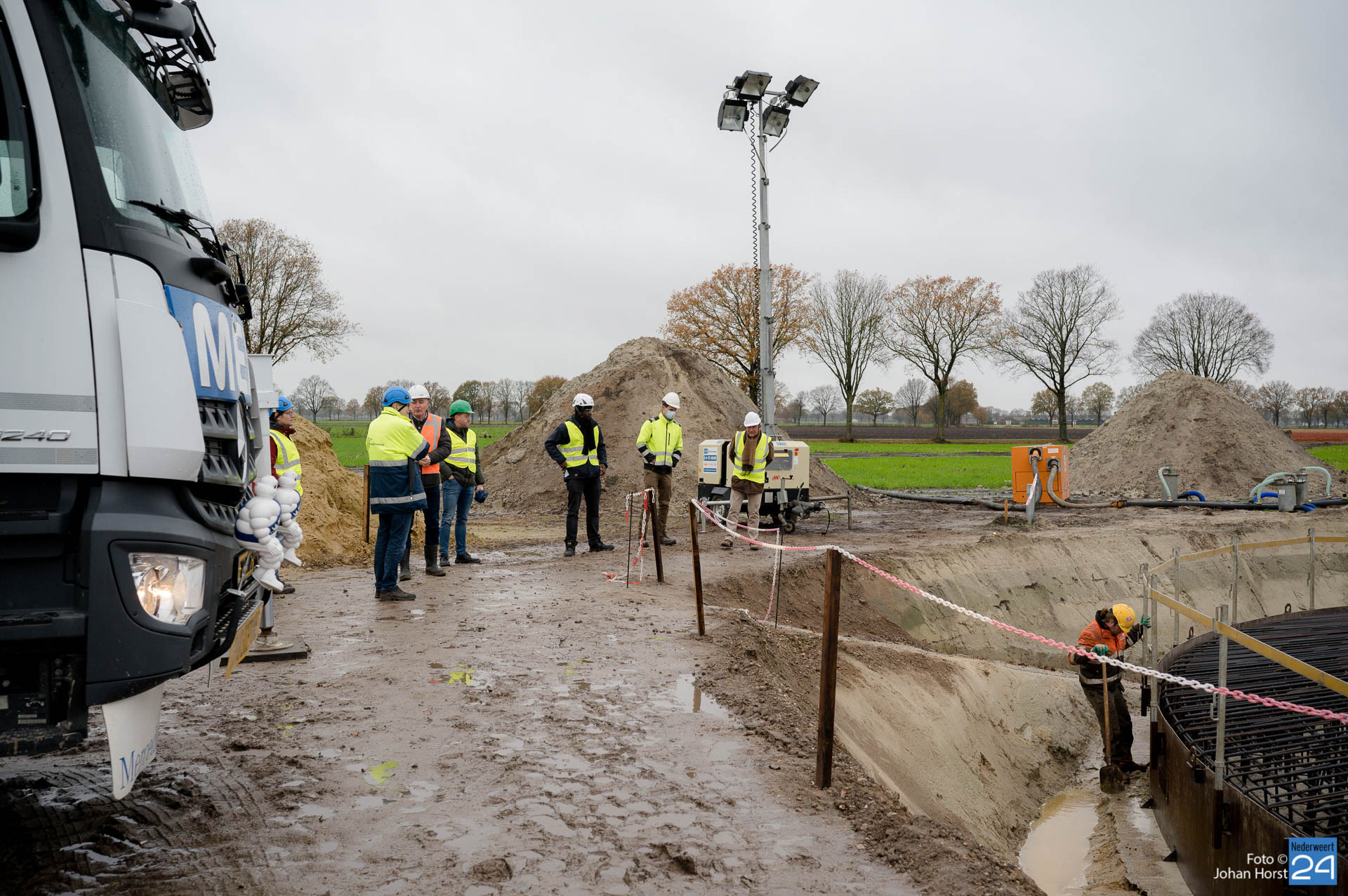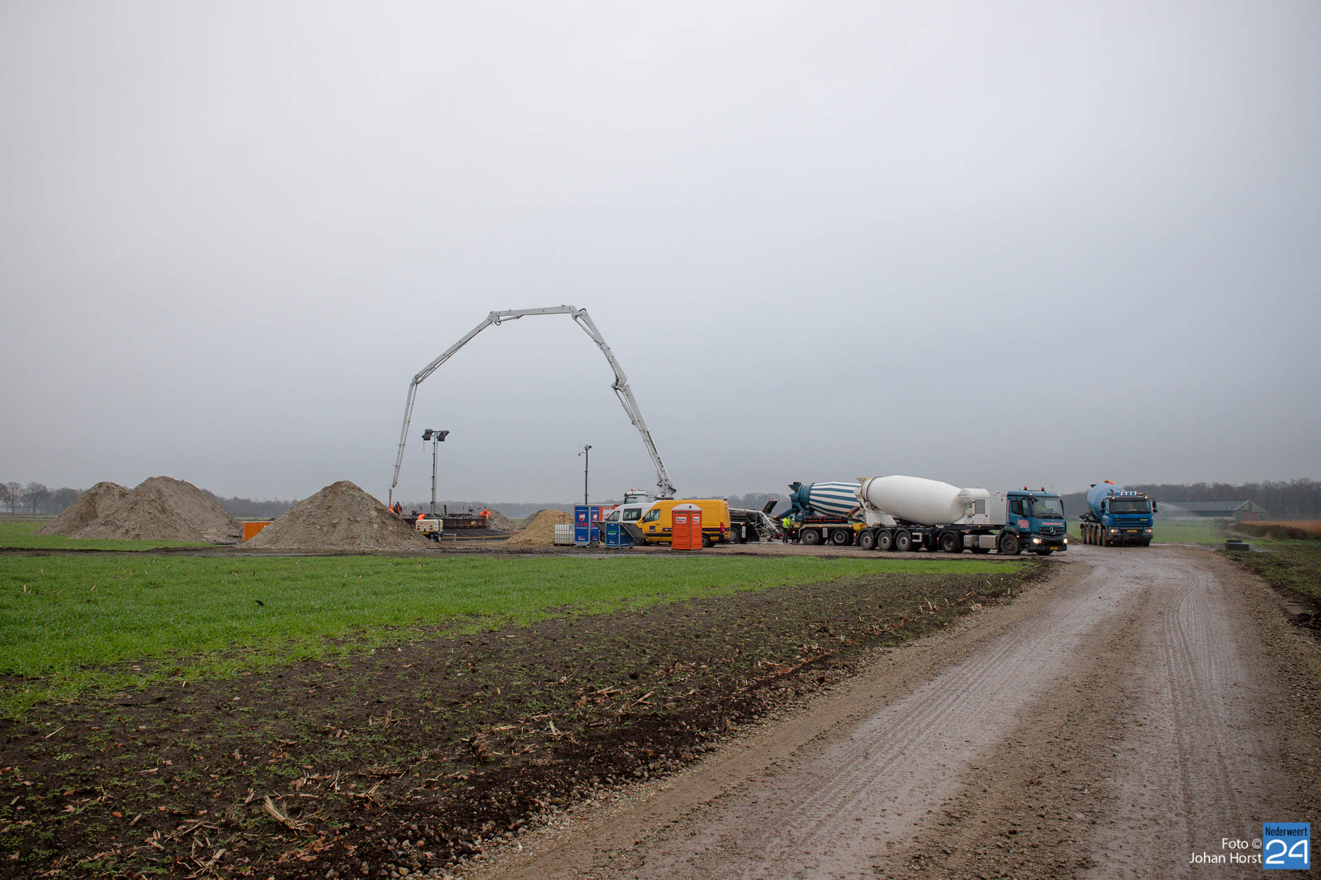 In Ospeldijk bouwt Zuidenwind samen met WML vier Nordex-windturbines. Het zijn dezelfde type molens als onlangs gebouwd in Heibloem, maar dan met een masthoogte van 135 meter. Men is momenteel druk bezig met het aanbrengen van de fundering. Elke fundering is goed voor circa 600 m3 beton, dat zijn flink wat vrachten die naar Ospel worden gereden. Vroeg beginnen is dan ook vanzelfsprekend. Dinsdagmorgen kwam een delegatie van de gemeente een kijkje nemen.