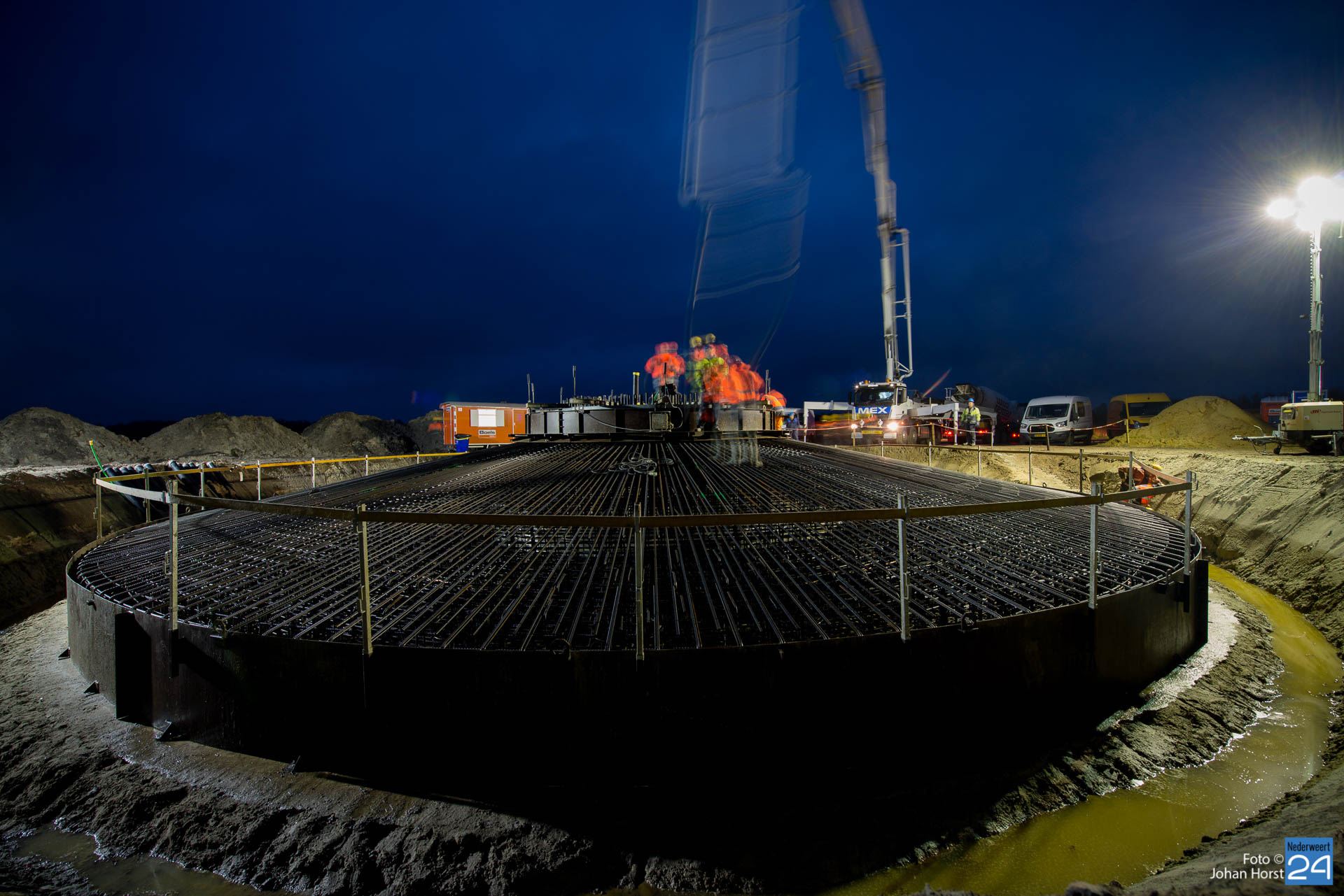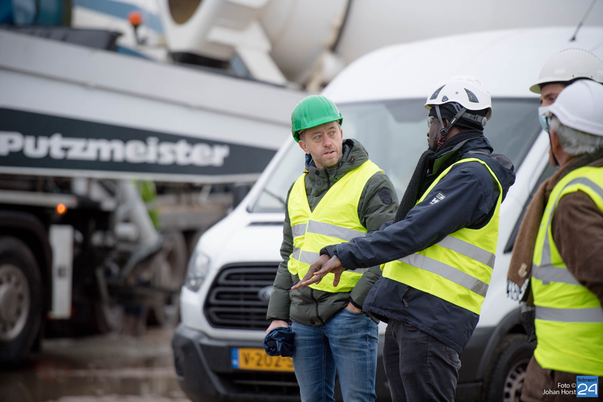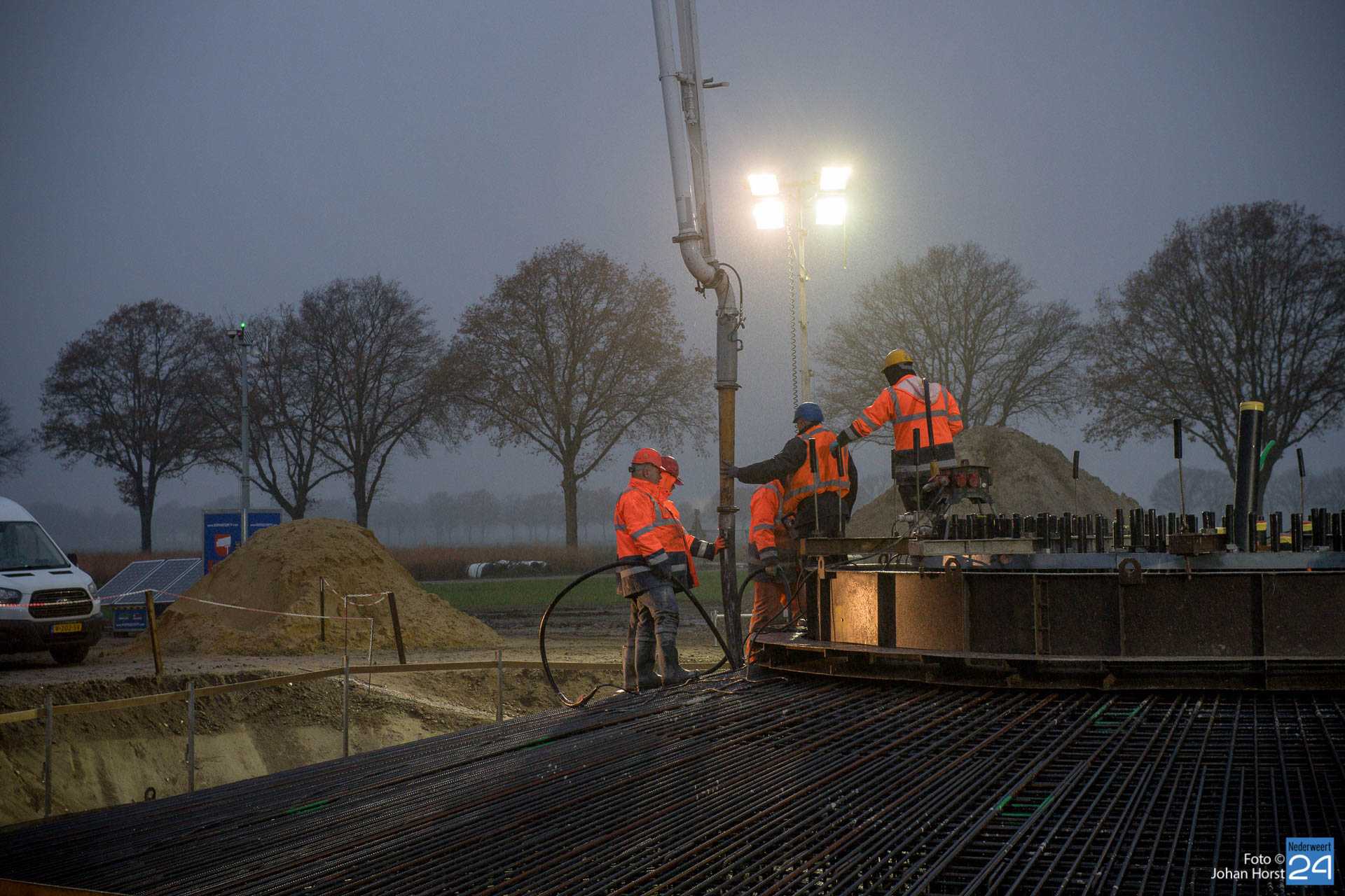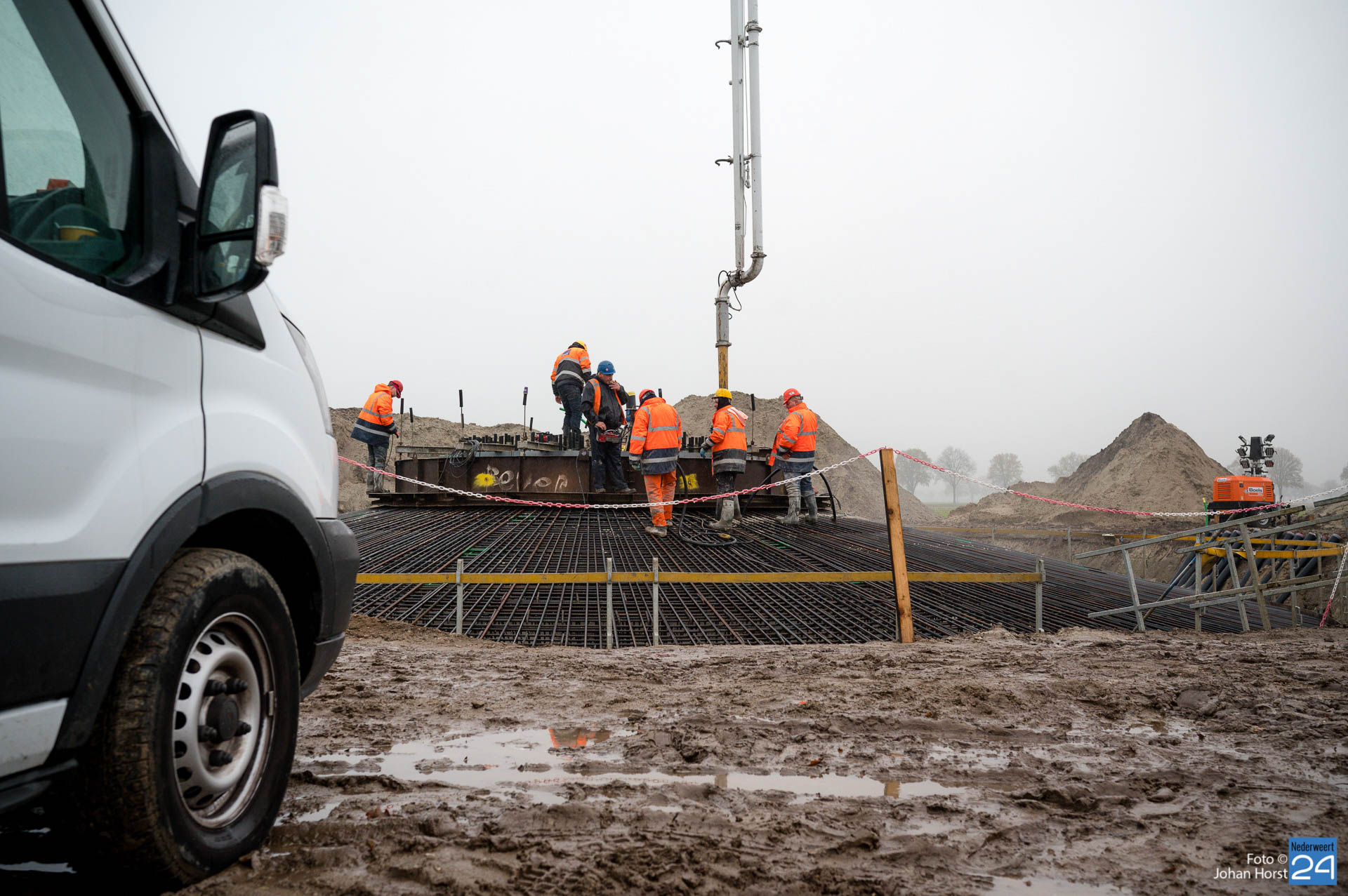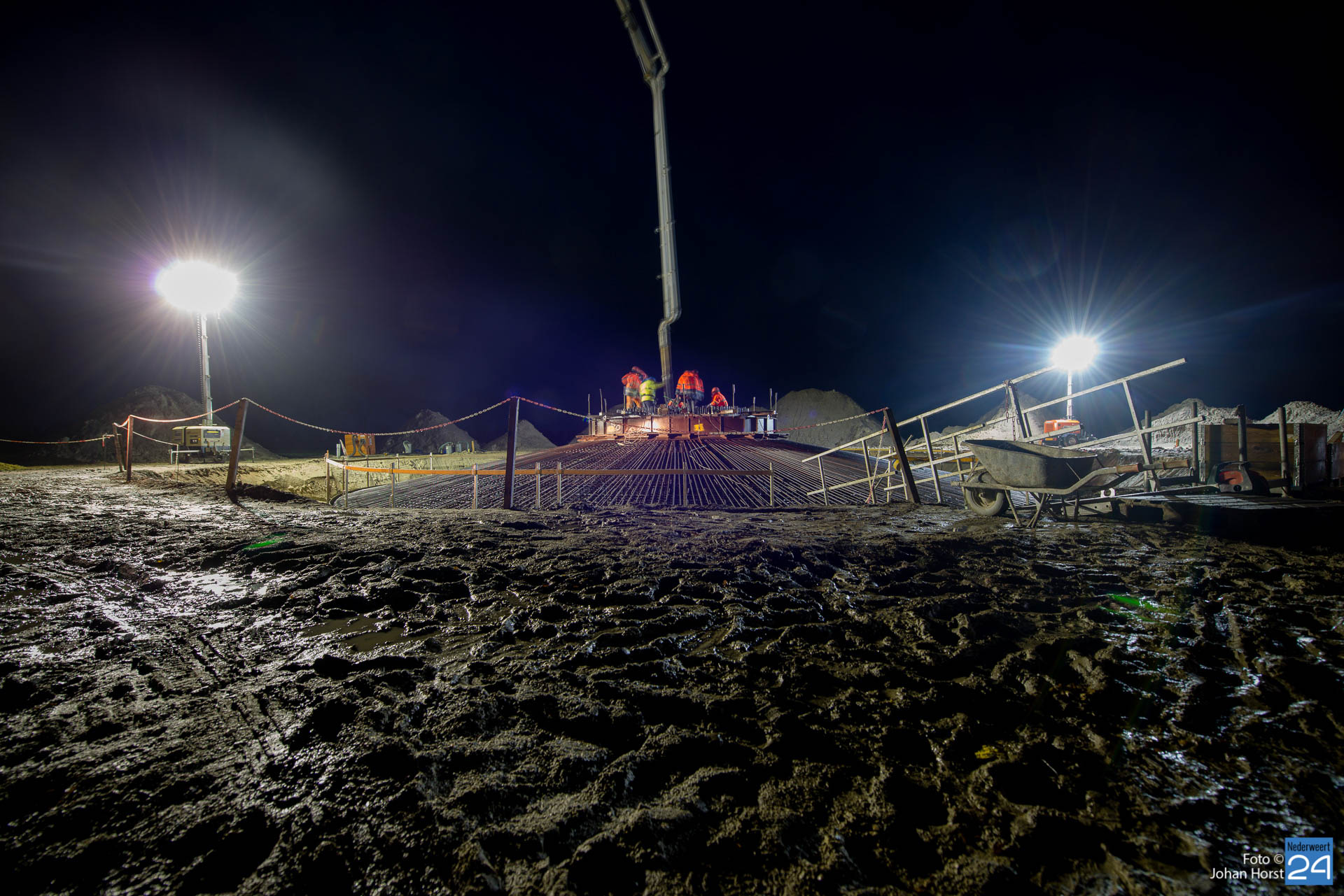In Ospeldijk bouwt Zuidenwind samen met WML vier Nordex-windturbines. Het zijn dezelfde type molens als onlangs gebouwd in Heibloem, maar dan met een masthoogte van 135 meter. Men is momenteel druk bezig met het aanbrengen van de fundering. Elke fundering is goed voor circa 600 m3 beton, dat zijn flink wat vrachten die naar Ospel worden gereden. Vroeg beginnen is dan ook vanzelfsprekend. Dinsdagmorgen kwam een delegatie van de gemeente een kijkje nemen.