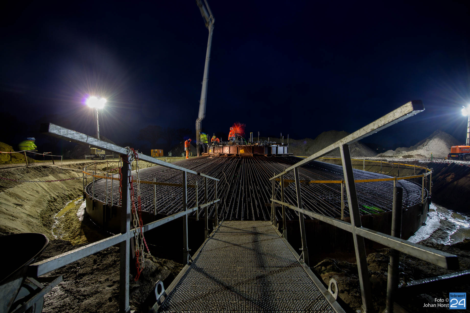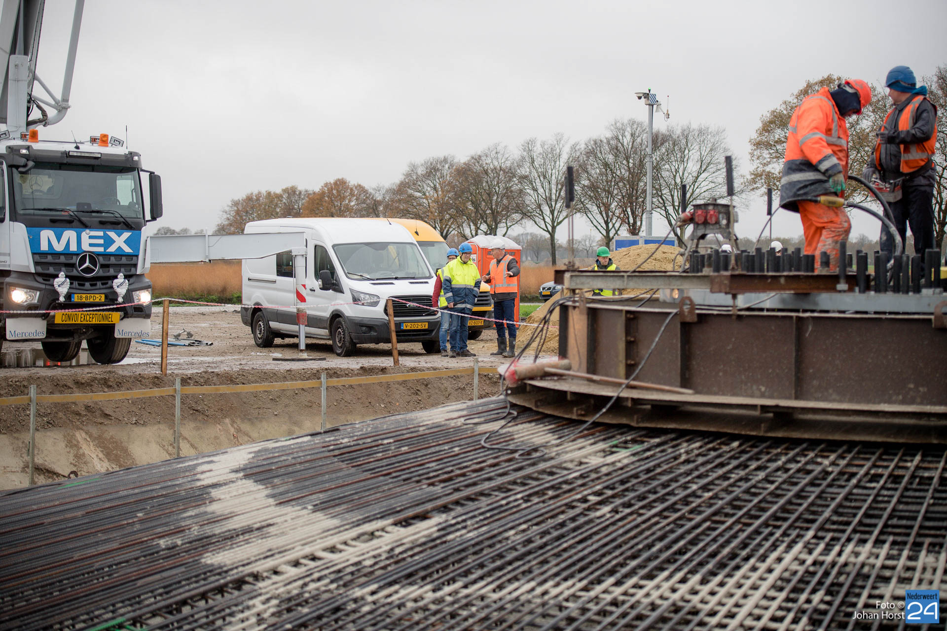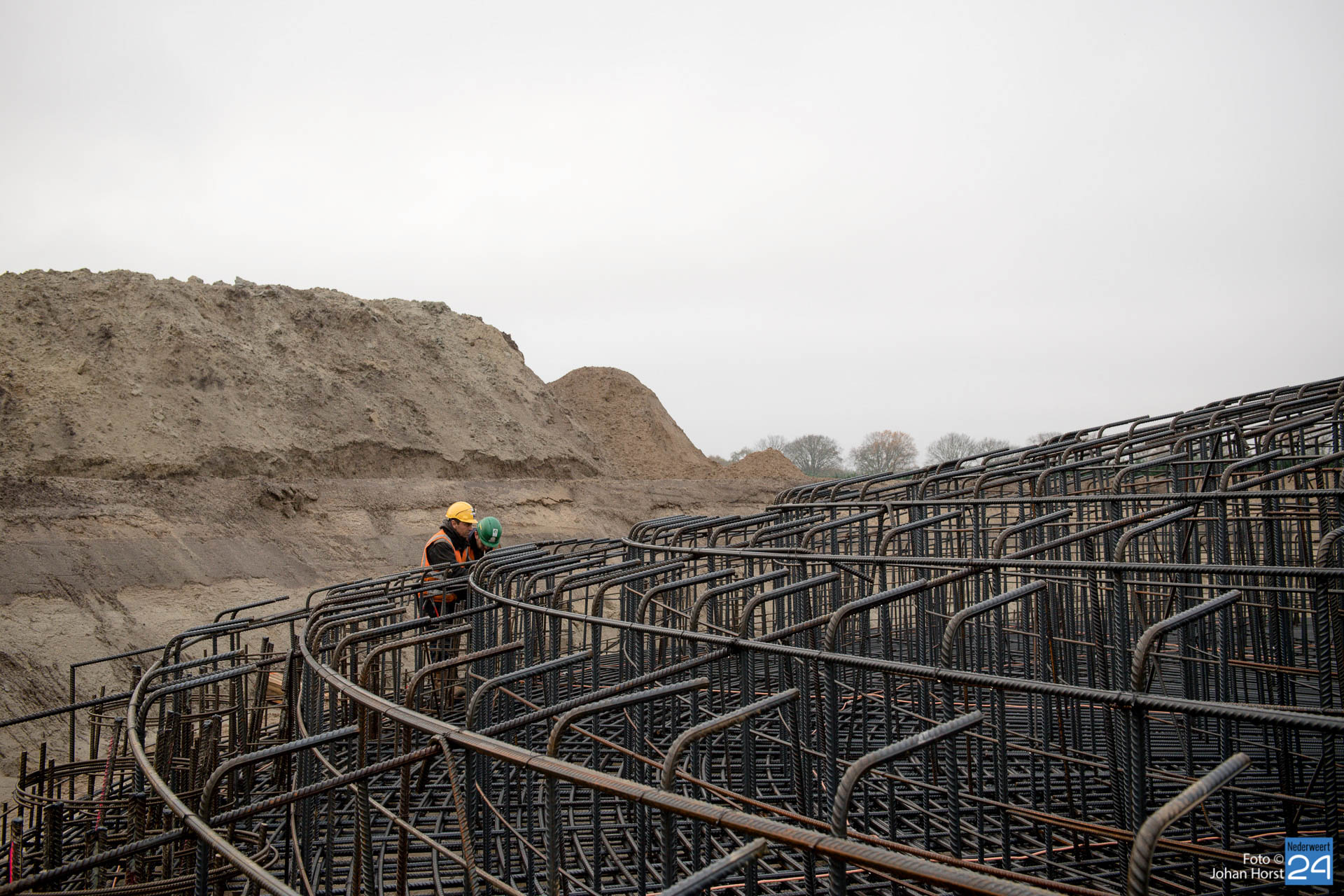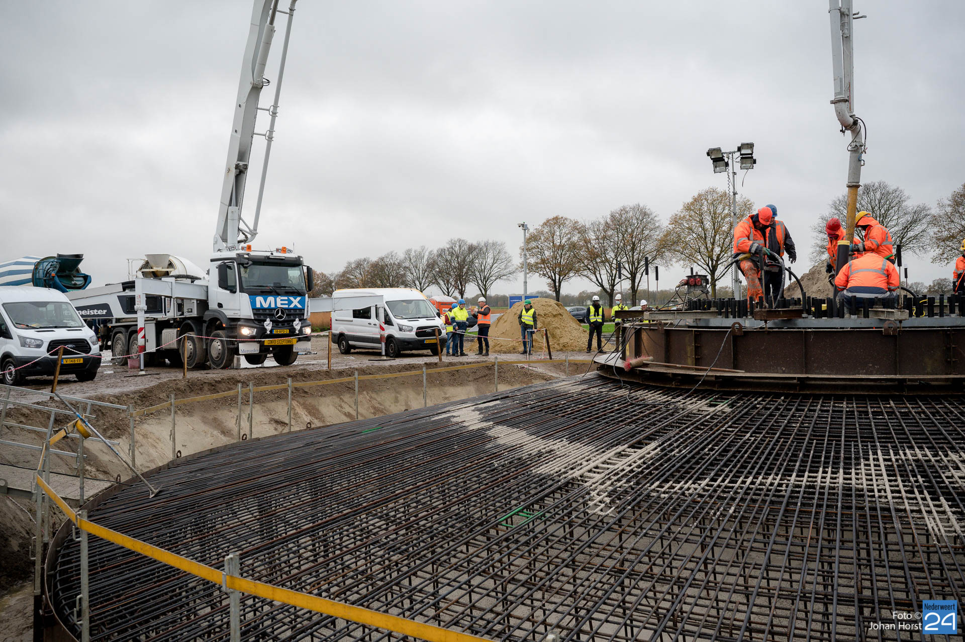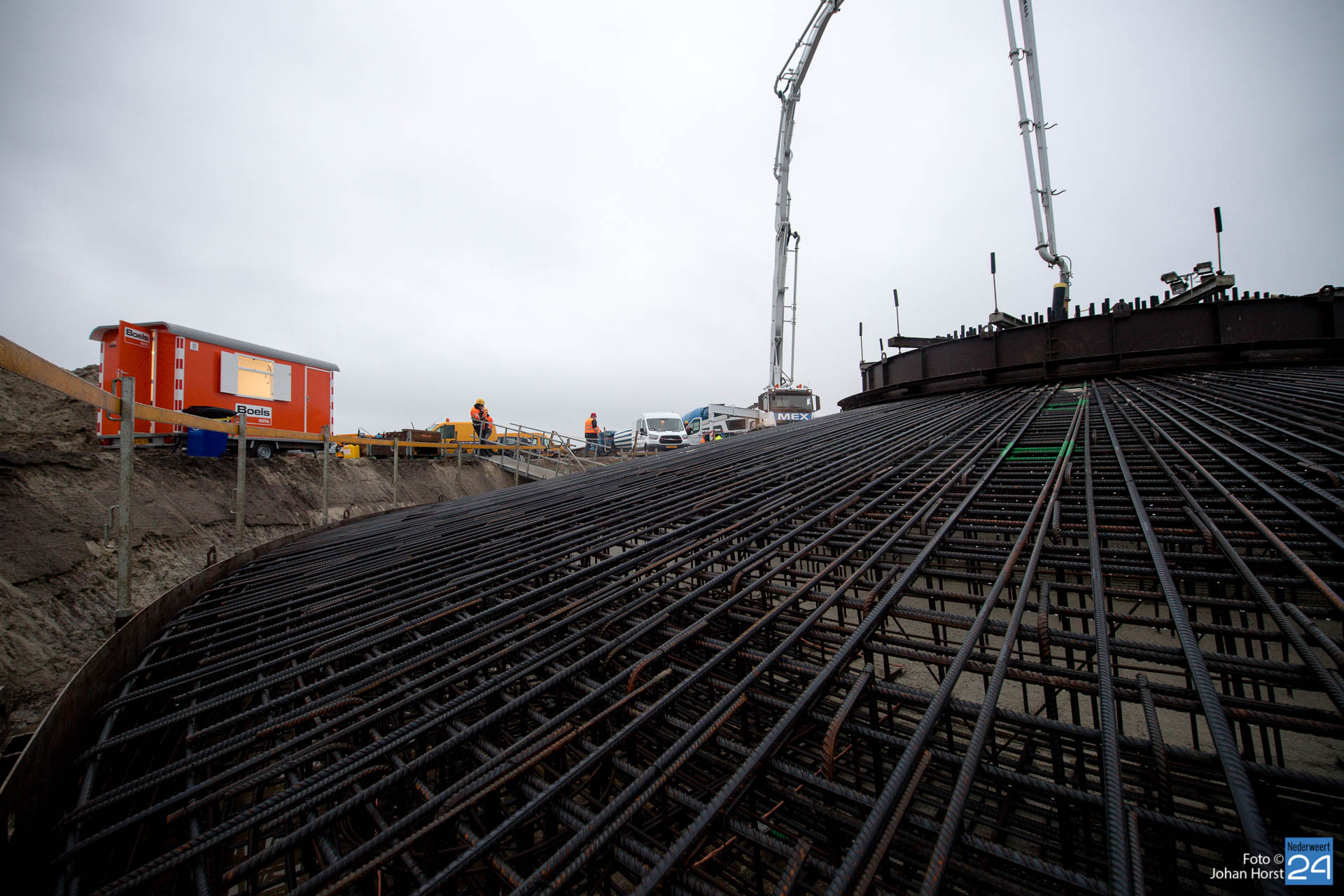 In Ospeldijk bouwt Zuidenwind samen met WML vier Nordex-windturbines. Het zijn dezelfde type molens als onlangs gebouwd in Heibloem, maar dan met een masthoogte van 135 meter. Men is momenteel druk bezig met het aanbrengen van de fundering. Elke fundering is goed voor circa 600 m3 beton, dat zijn flink wat vrachten die naar Ospel worden gereden. Vroeg beginnen is dan ook vanzelfsprekend. Dinsdagmorgen kwam een delegatie van de gemeente een kijkje nemen.