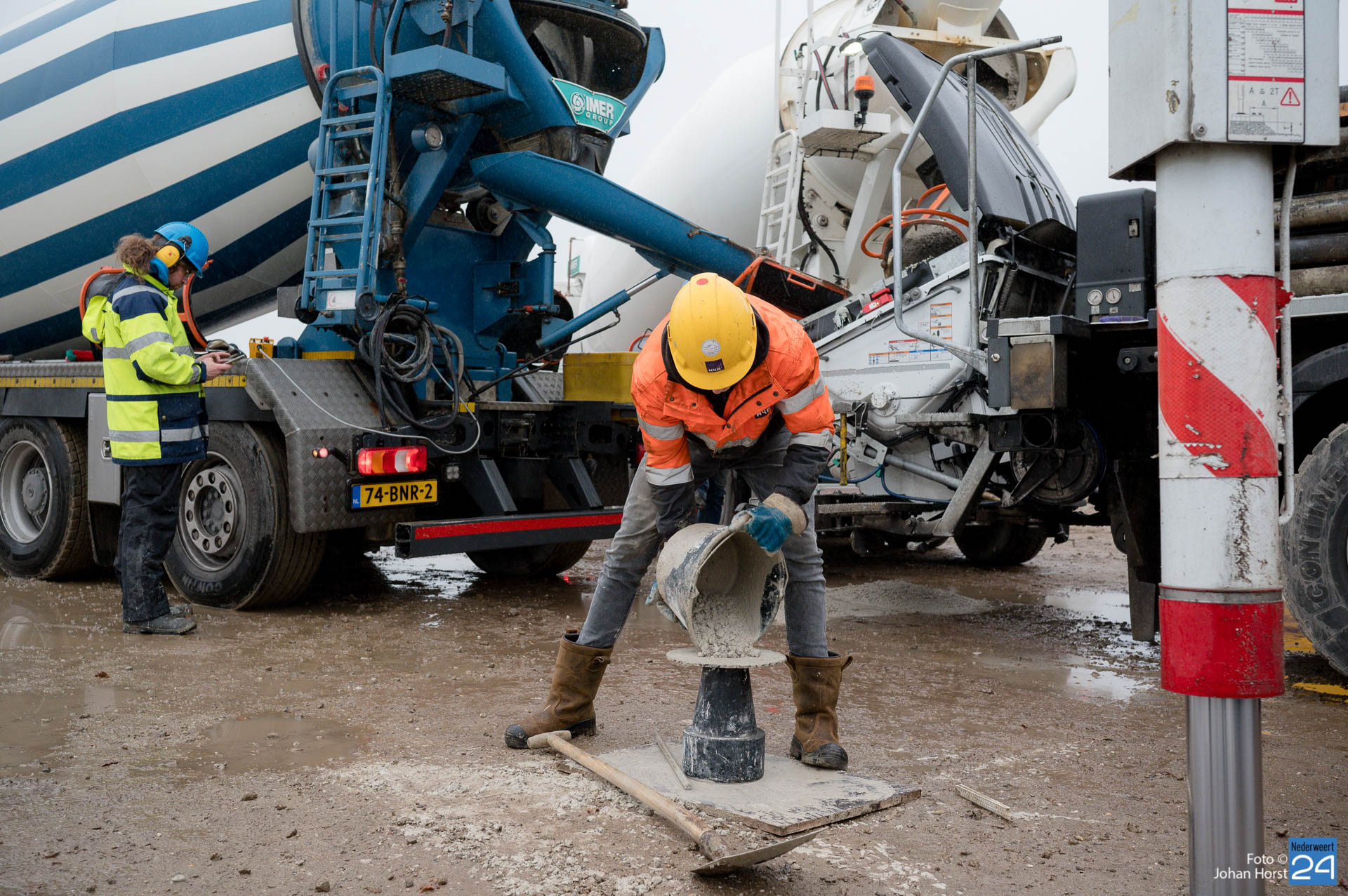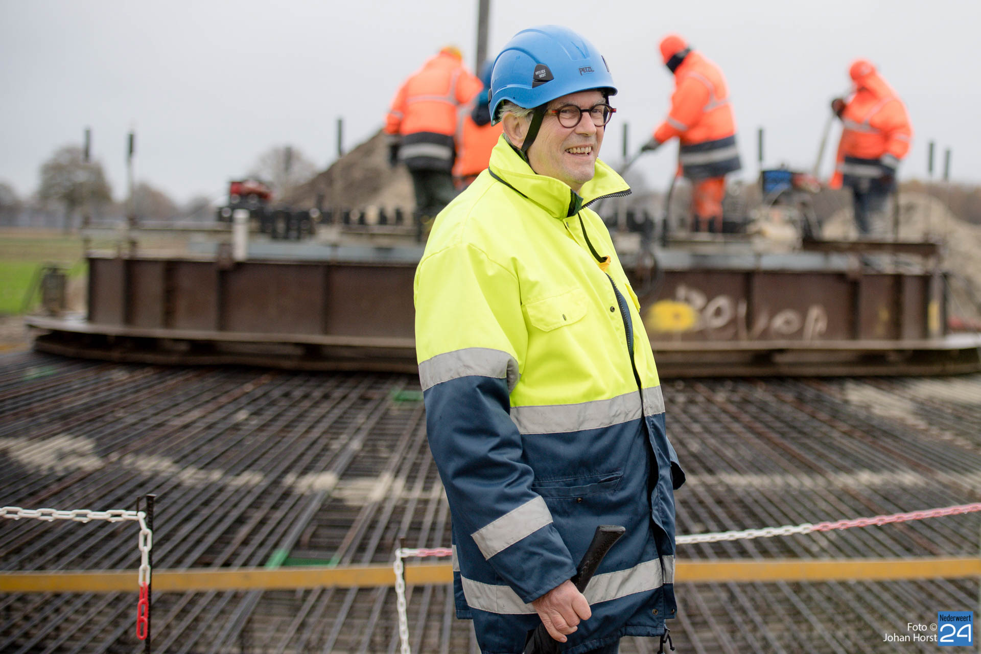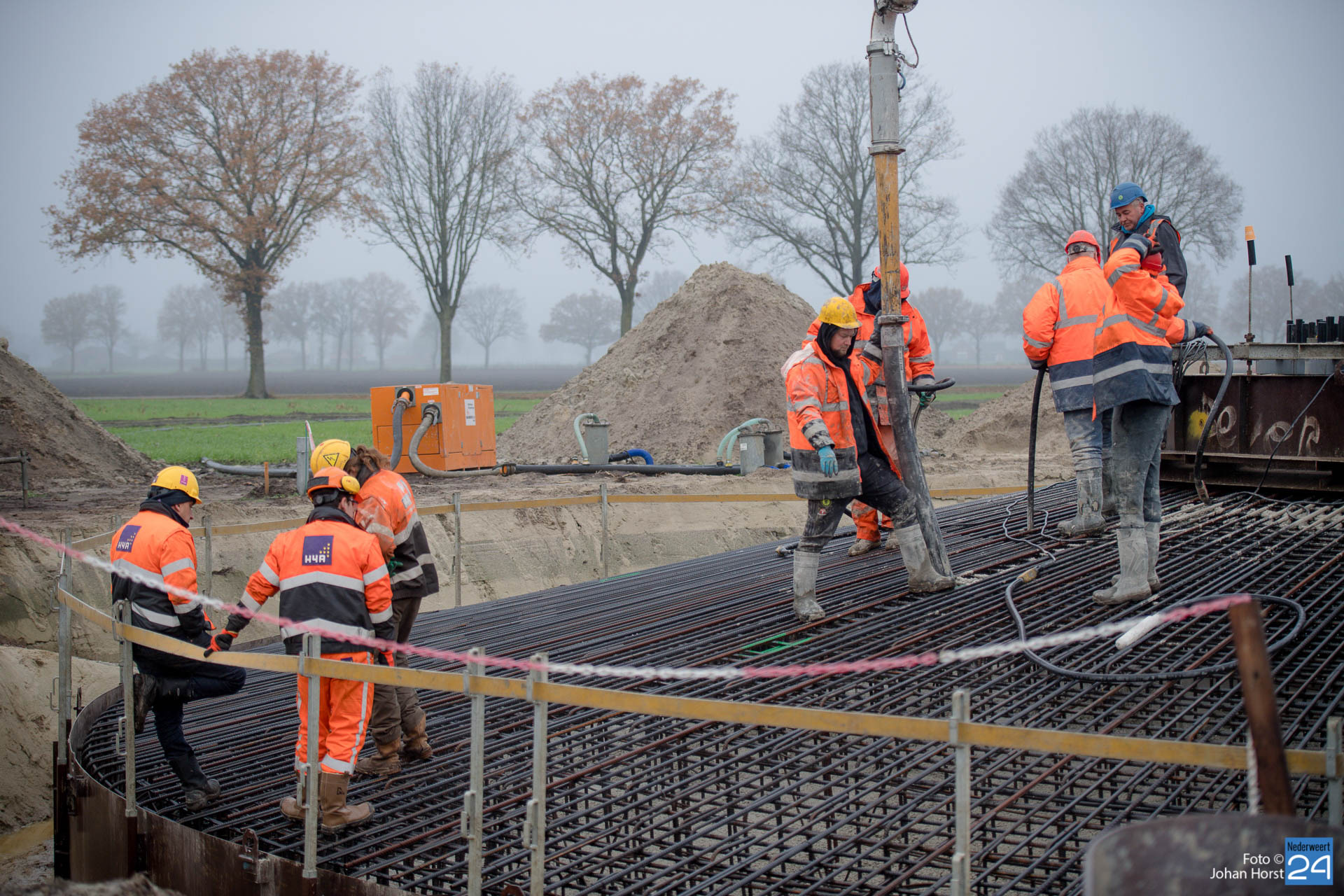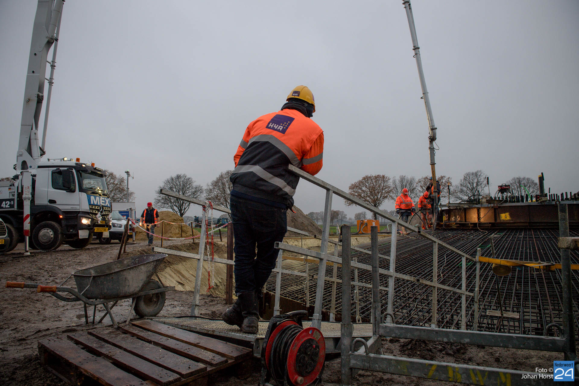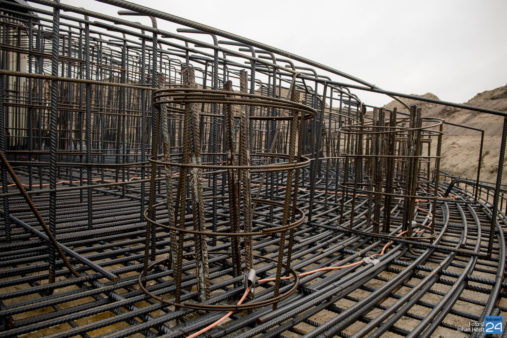 In Ospeldijk bouwt Zuidenwind samen met WML vier Nordex-windturbines. Het zijn dezelfde type molens als onlangs gebouwd in Heibloem, maar dan met een masthoogte van 135 meter. Men is momenteel druk bezig met het aanbrengen van de fundering. Elke fundering is goed voor circa 600 m3 beton, dat zijn flink wat vrachten die naar Ospel worden gereden. Vroeg beginnen is dan ook vanzelfsprekend. Dinsdagmorgen kwam een delegatie van de gemeente een kijkje nemen.