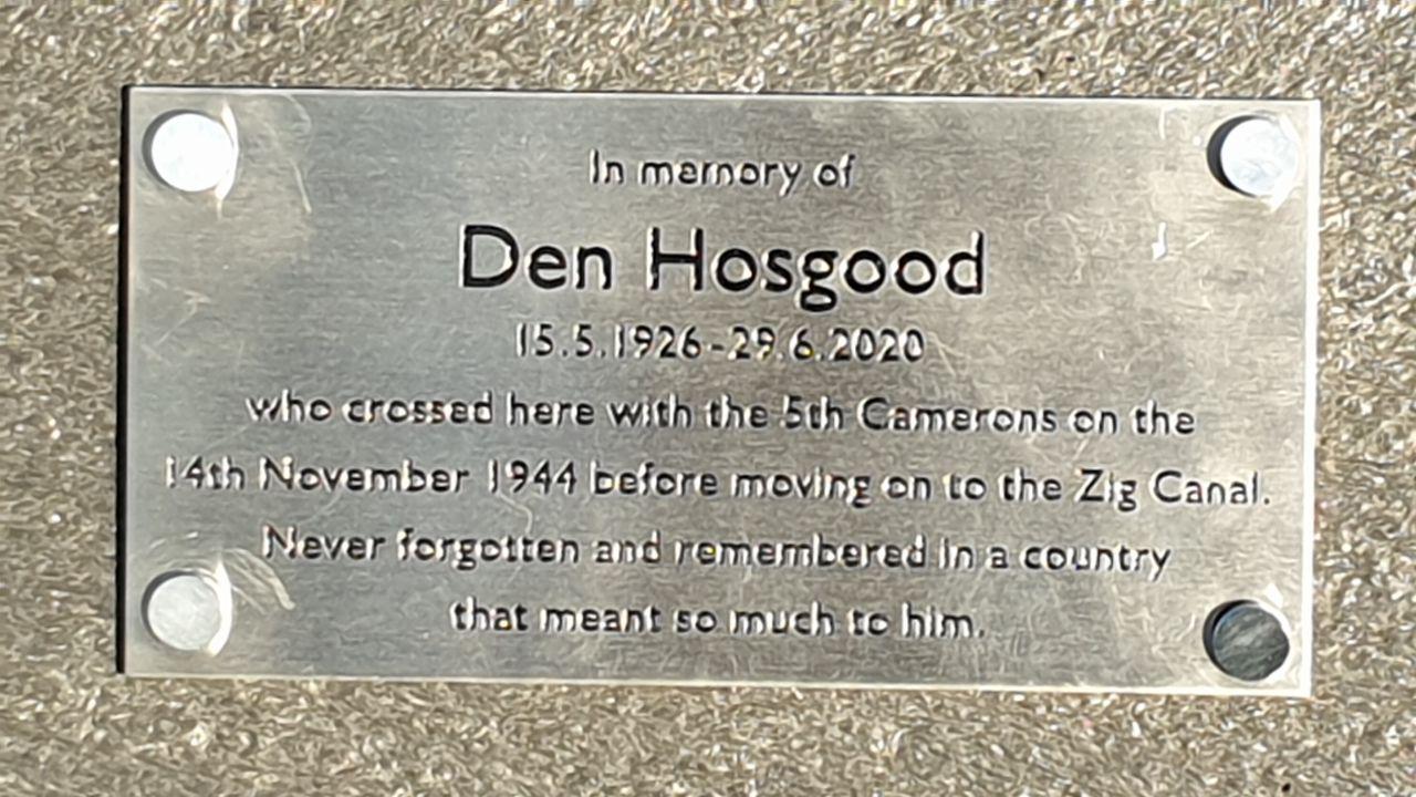 Op de plaquette staat te lezen: “In memory of Den Hosgood 15.5.1926 – 29.6.2020. Who crossed here with the 5th Camerons on the 14th november 1944 before moving to the Zig Canal. Never forgotten and remembered in a country that meant so much to him.’’ (Ter nagedachtenis aan Den Hosgood 15.5.1926 – 29.6.2020, die hier op 14 november 1944 met het 5e bataljon van de Cameron Highlanders het kanaal overstak en daarna oprukte naar het Uitwateringskanaal. Nooit vergeten en herdacht in een land dat zoveel voor hem betekende).