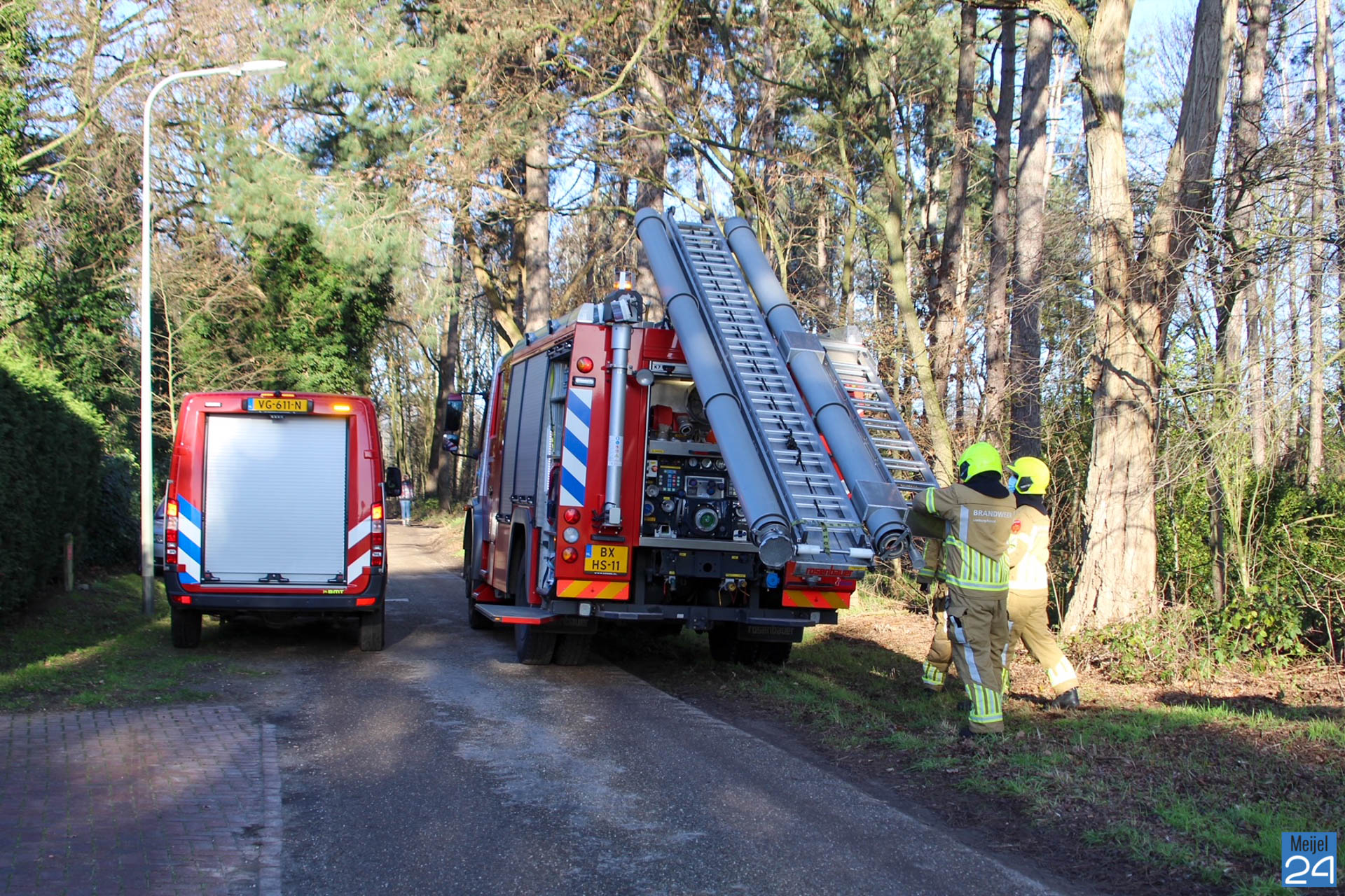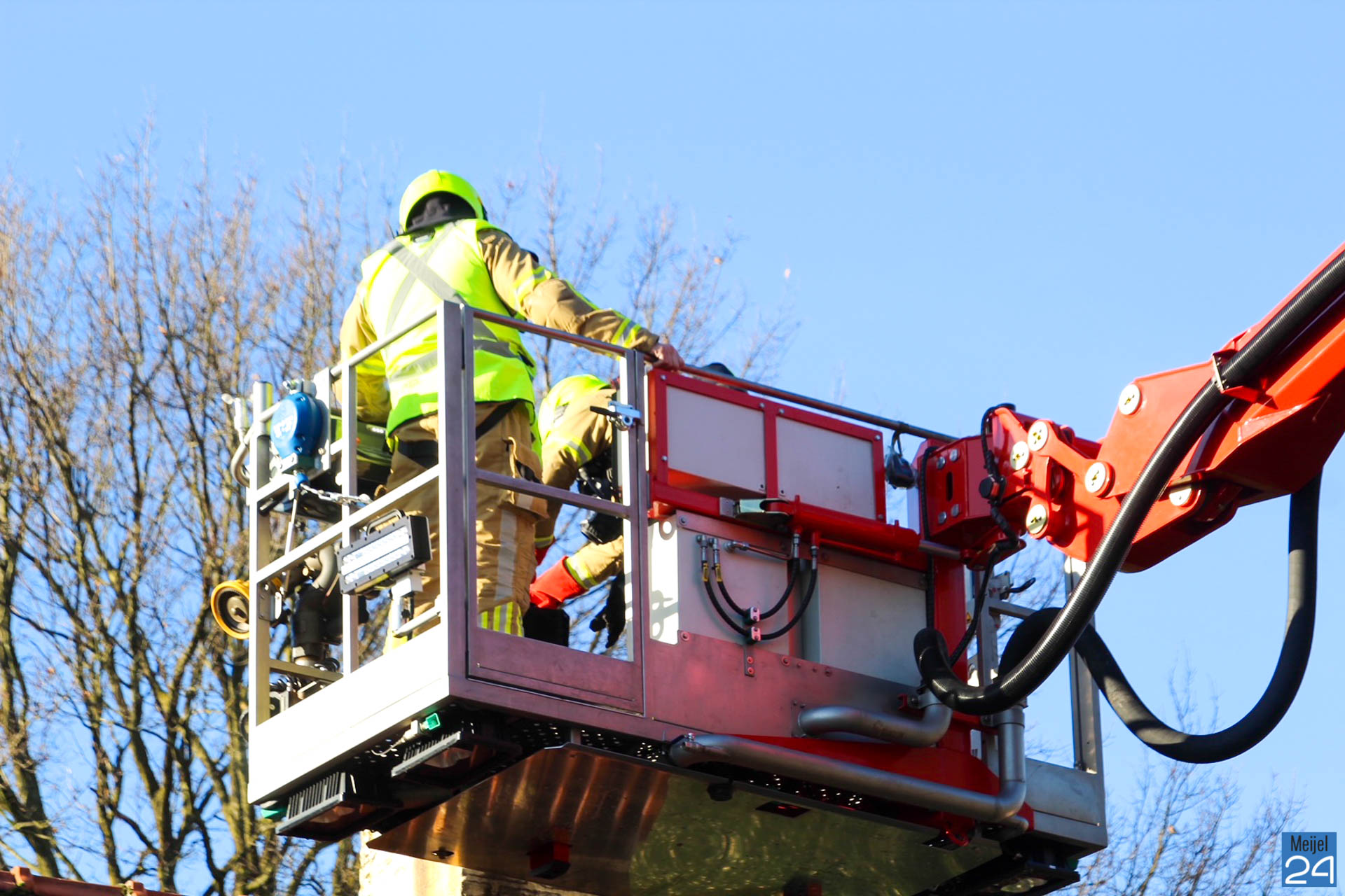 De brandweer kwam met een Snel Interventie Voertuig (SIV), een tankautospuit en hoogwerker ter plaatse. Nog vóór de hoogwerker er was, was er al een deel van wat brandde naar buiten gebracht door de brandweer. Met behulp van de hoogwerker is het rookkanaal met een ‘ramoneur’ verder gecontroleerd.