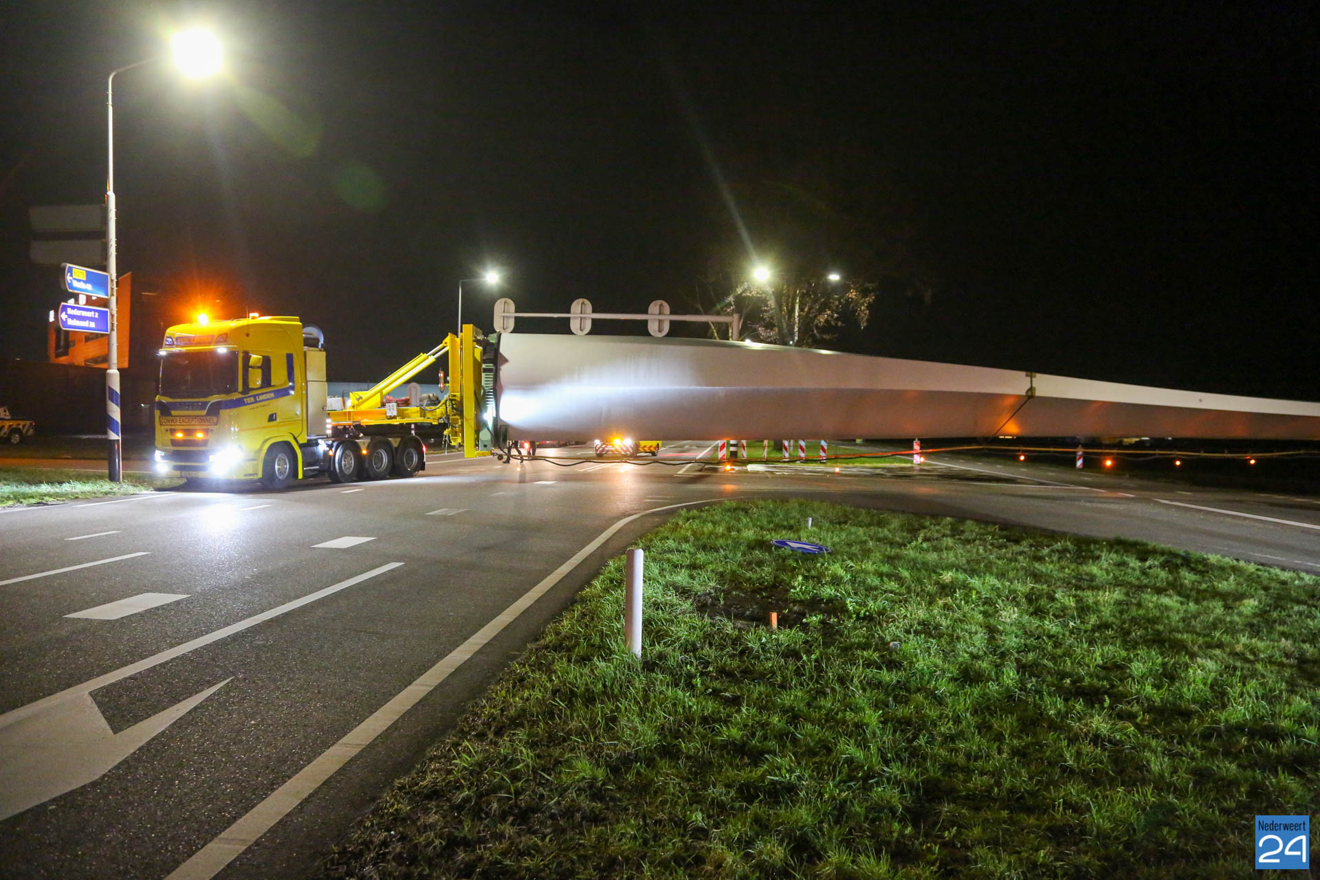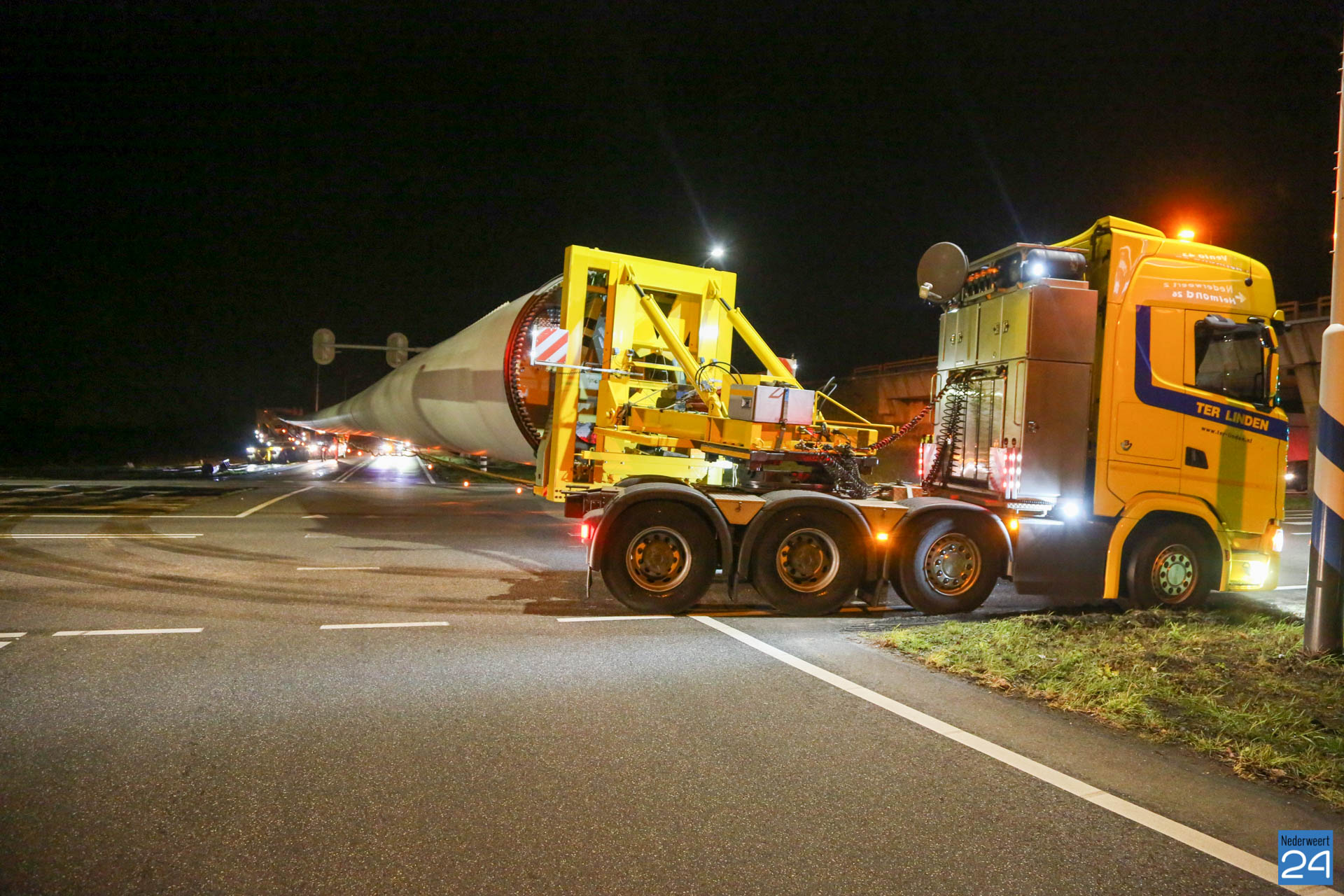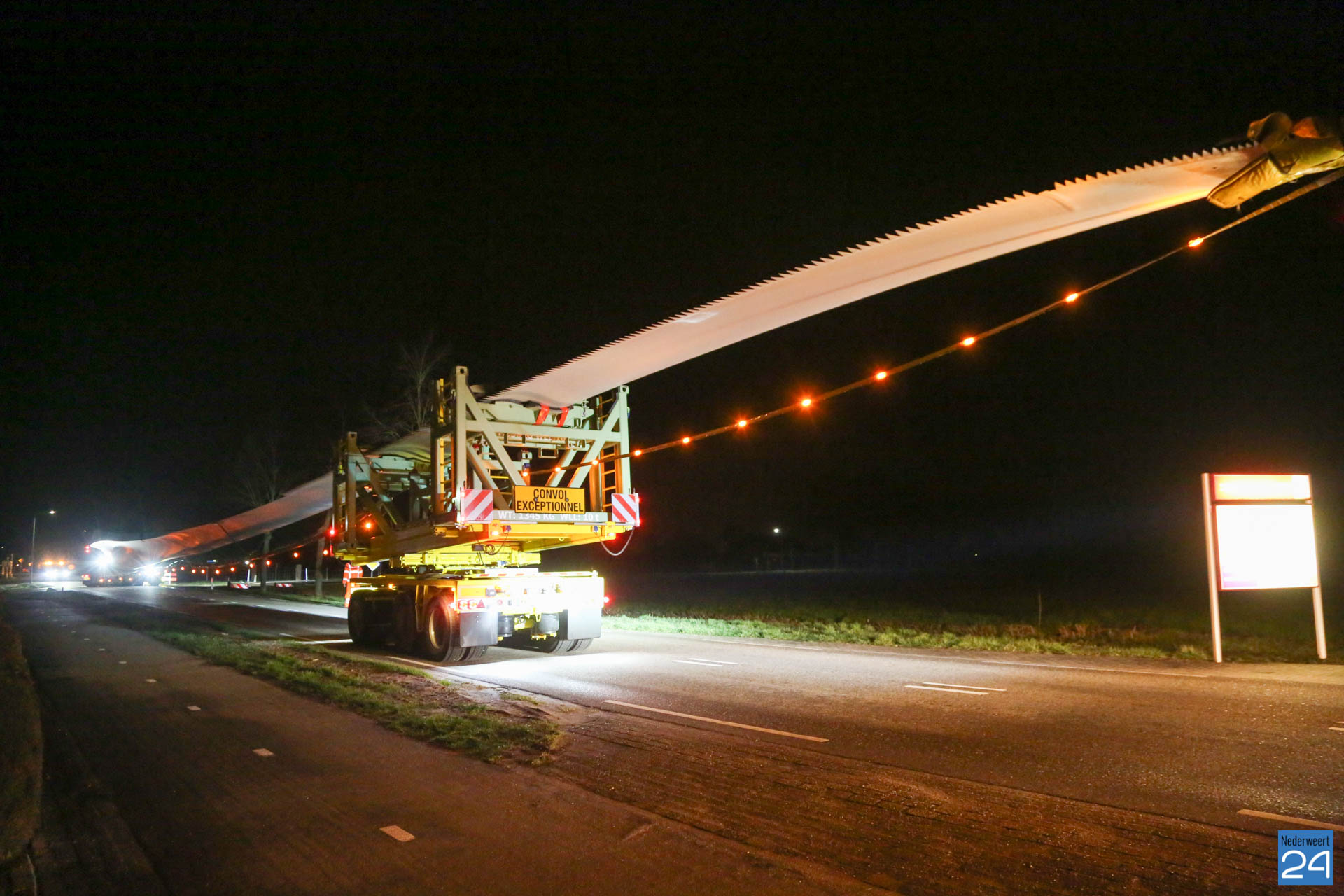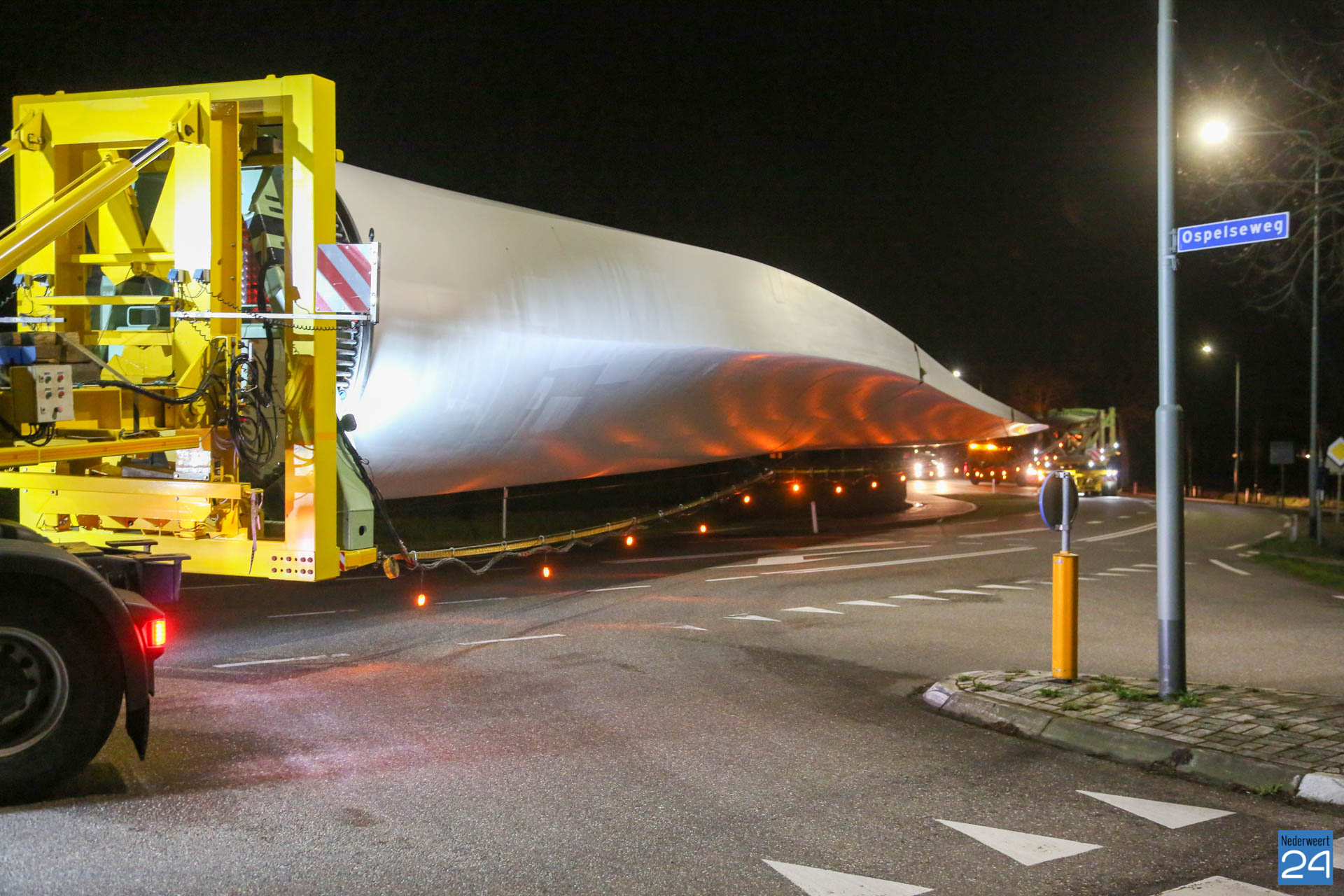 Het eerste rotorblad arriveerde afgelopen vrijdagavond tegen middennacht in Ospeldijk. Het tweede transport arriveerde maandagavond. Komende nachten zijn er ook weer nieuwe transporten gepland. Deze enorme transport van 81 meter lang komen vanaf Antwerpen naar Nederweert. Dit zijn speciale transporten, die uitgevoerd worden door een gespecialiseerd transportbedrijf “Ter Linden” uit Doetinchem. De firma hoort bij de eredivisie van de transporteurs.