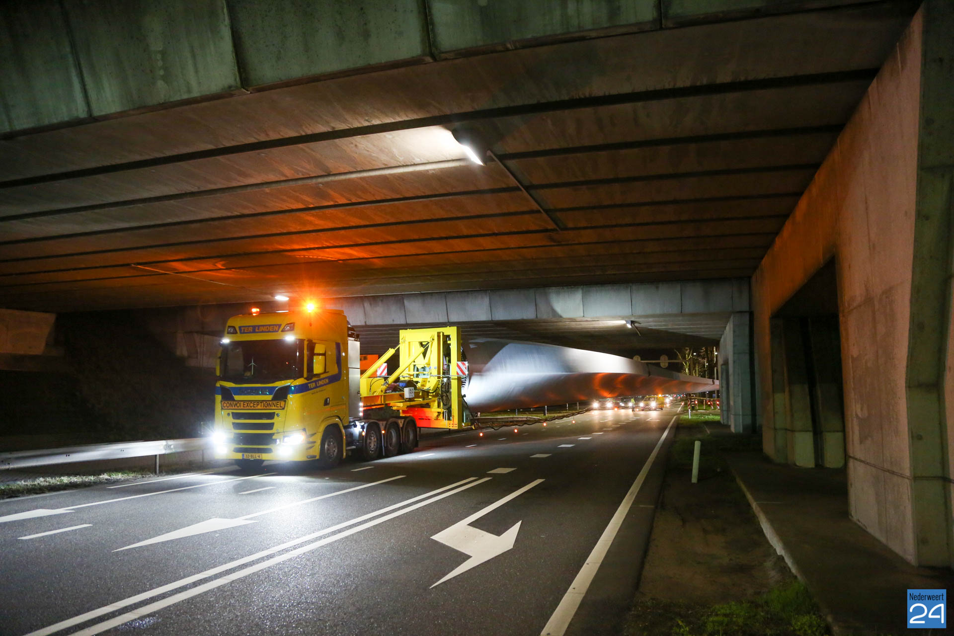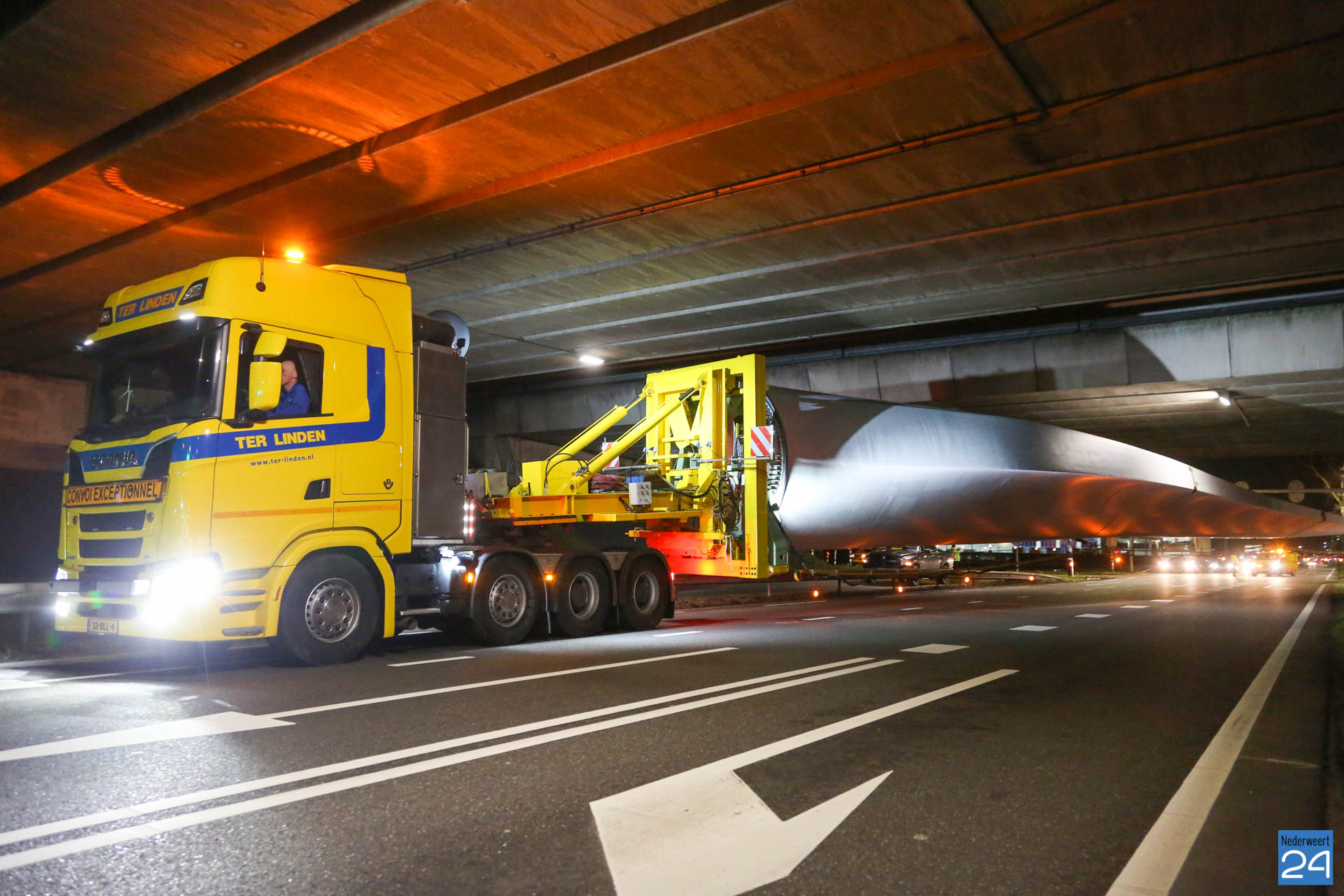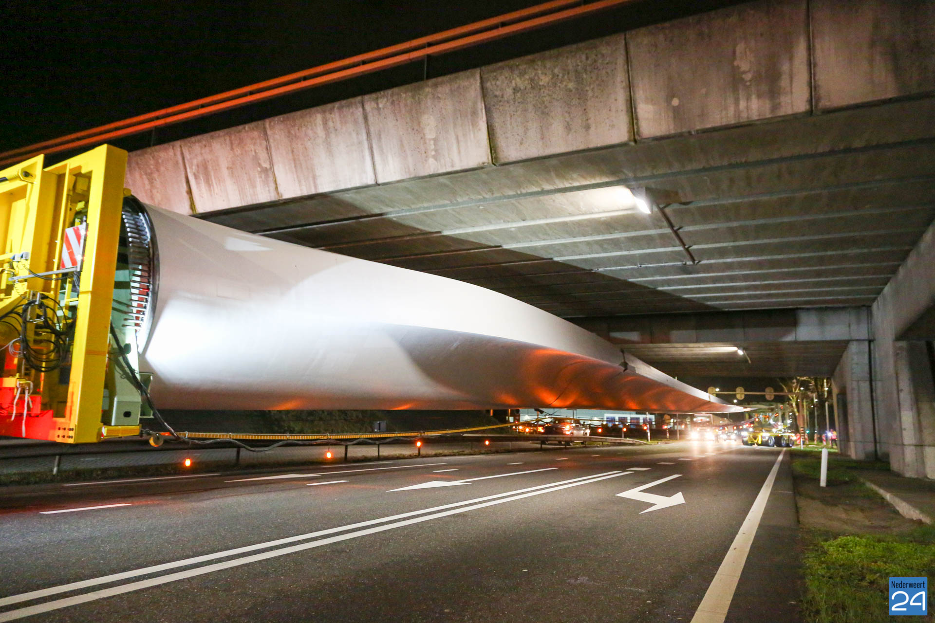Het eerste rotorblad arriveerde afgelopen vrijdagavond tegen middennacht in Ospeldijk. Het tweede transport arriveerde maandagavond. Komende nachten zijn er ook weer nieuwe transporten gepland. Deze enorme transport van 81 meter lang komen vanaf Antwerpen naar Nederweert. Dit zijn speciale transporten, die uitgevoerd worden door een gespecialiseerd transportbedrijf “Ter Linden” uit Doetinchem. De firma hoort bij de eredivisie van de transporteurs.