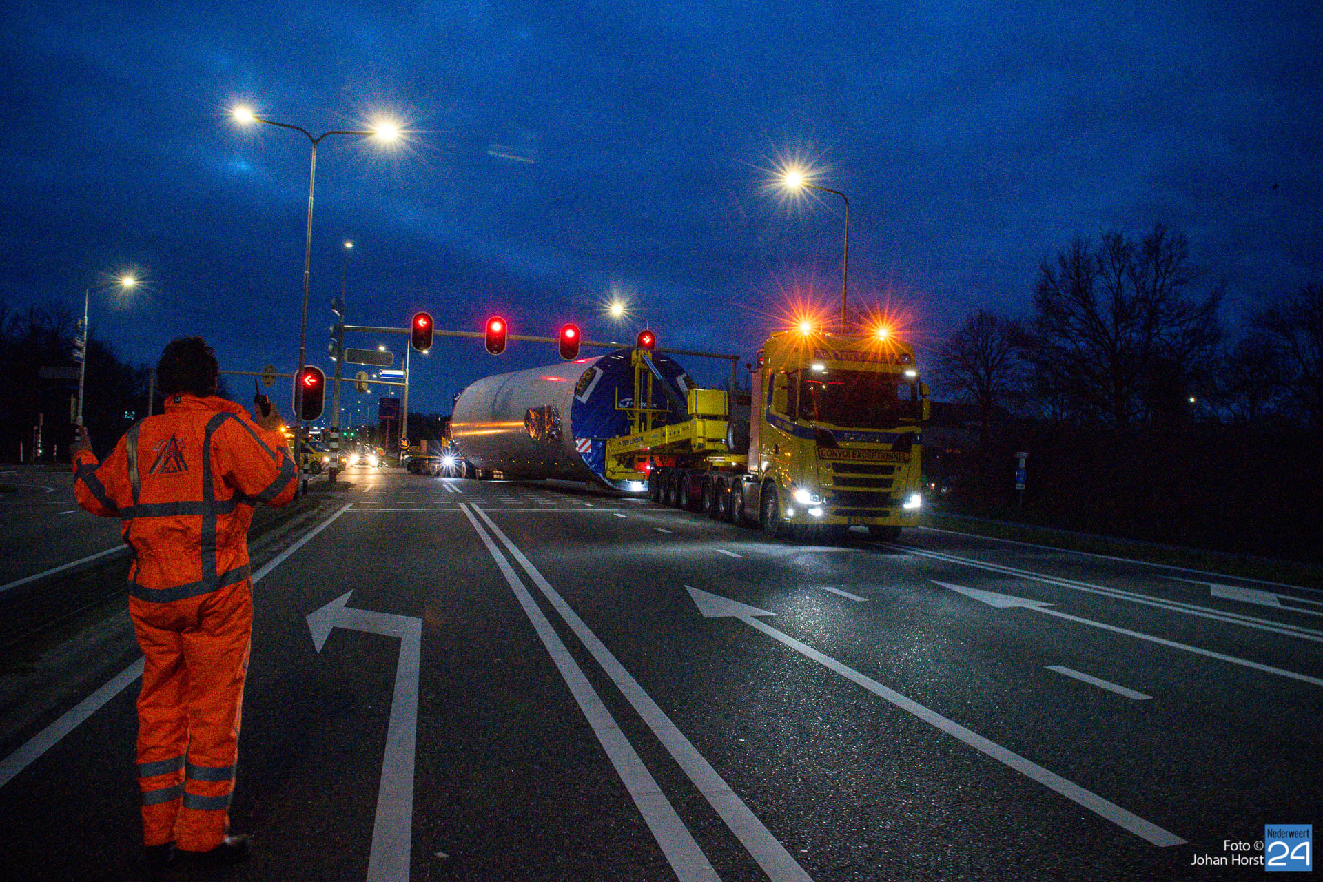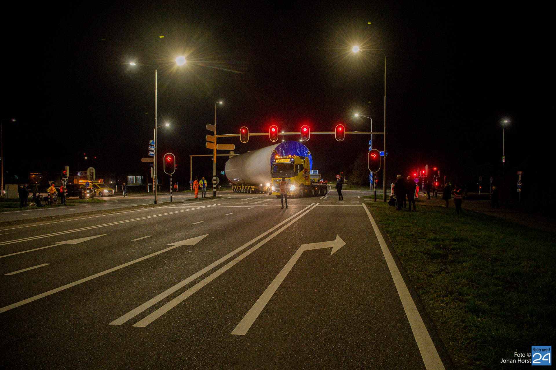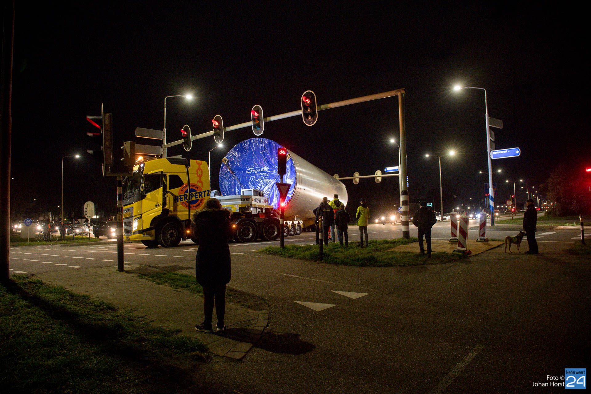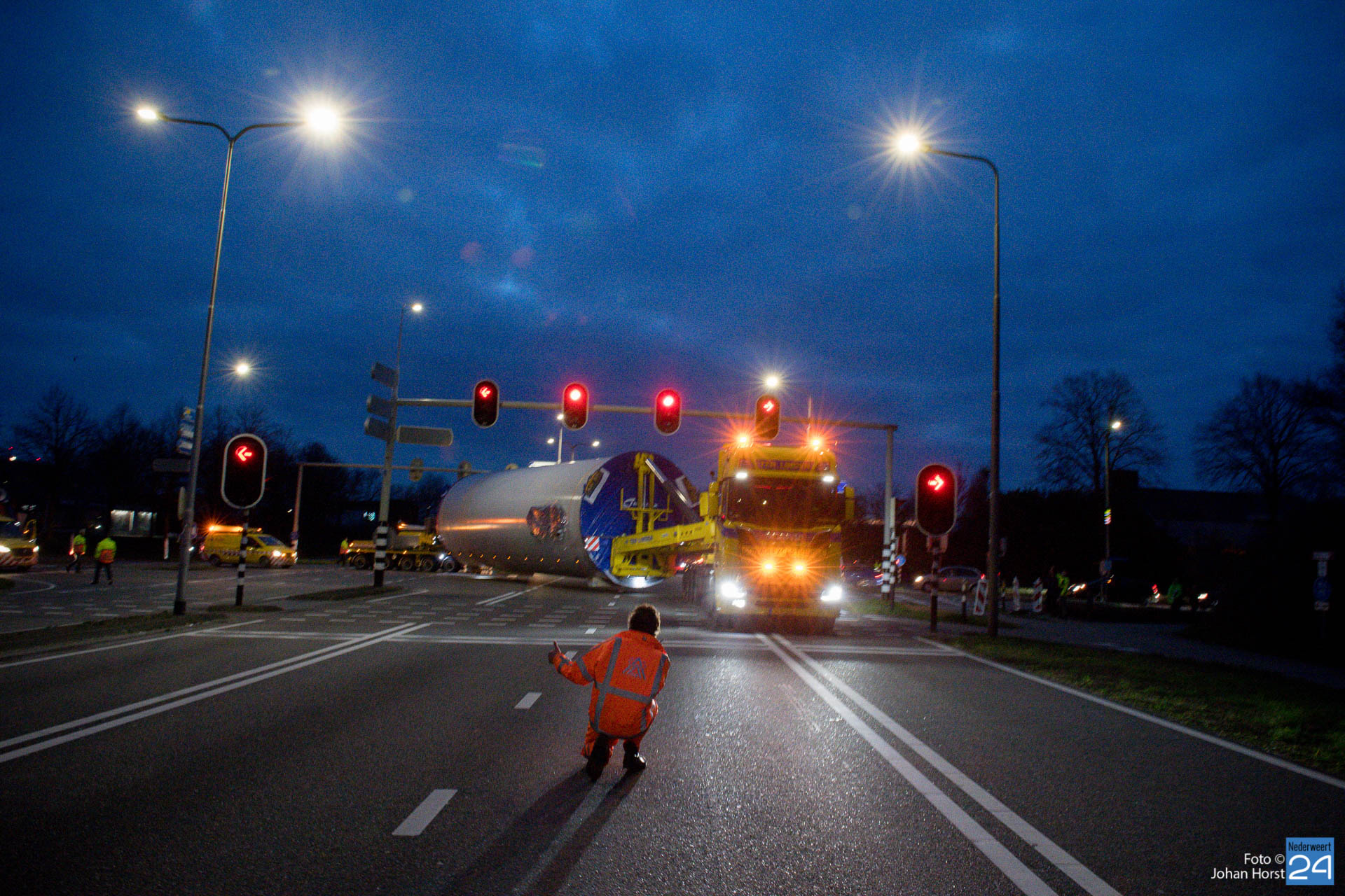 Het was even spannend of het gevaarte onder de verkeerslichten paste op de Randweg Zuid N275. Ondanks het late tijdstip en de naderende avondklok veel belangstelling om het vakmanschap van de chauffeurs te zien.