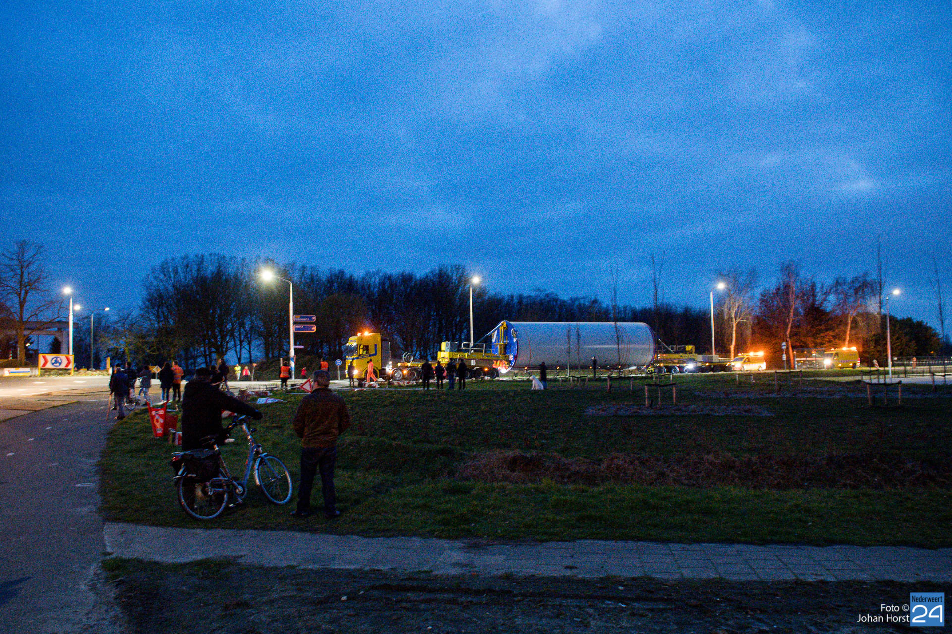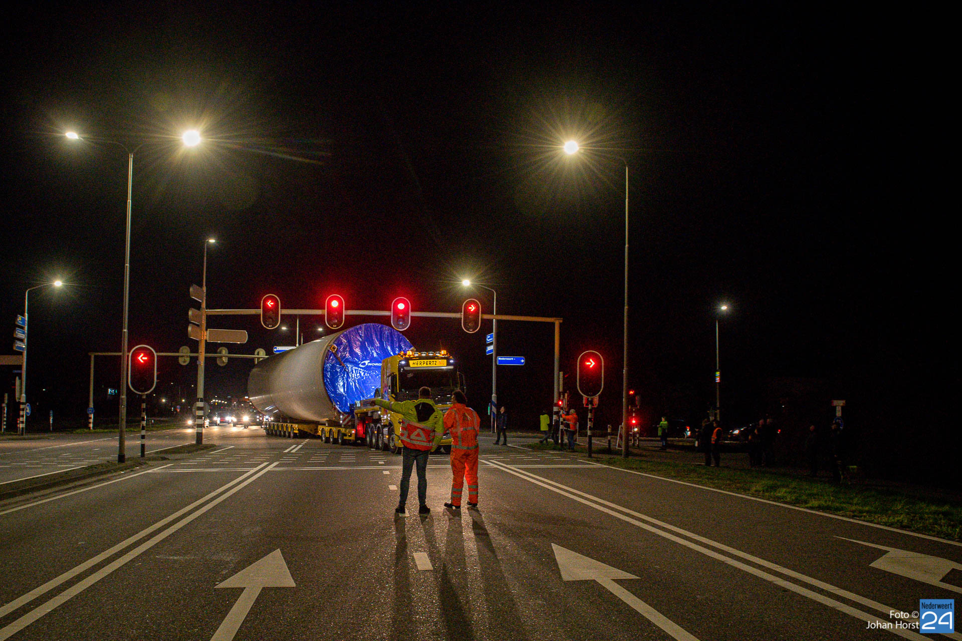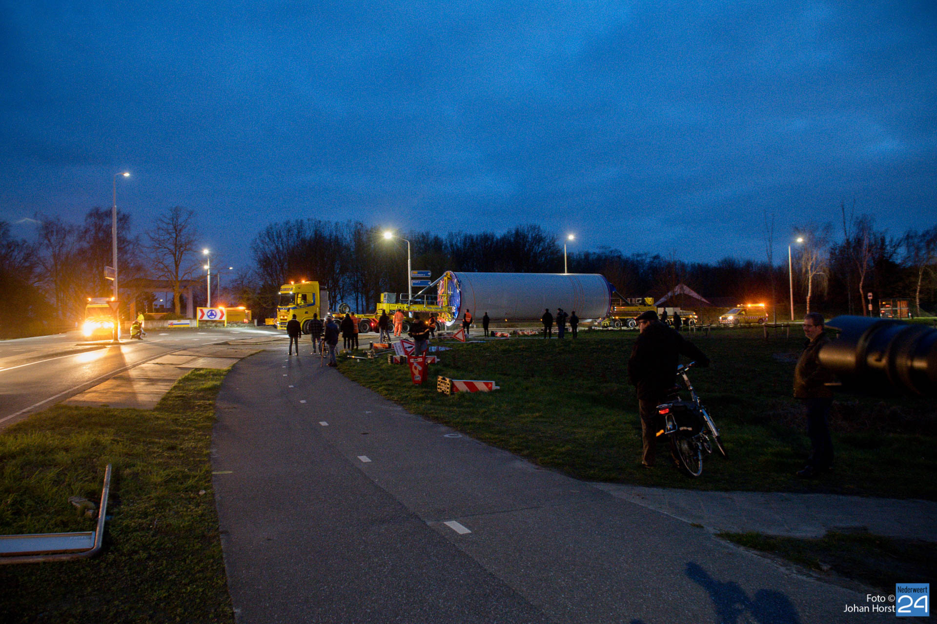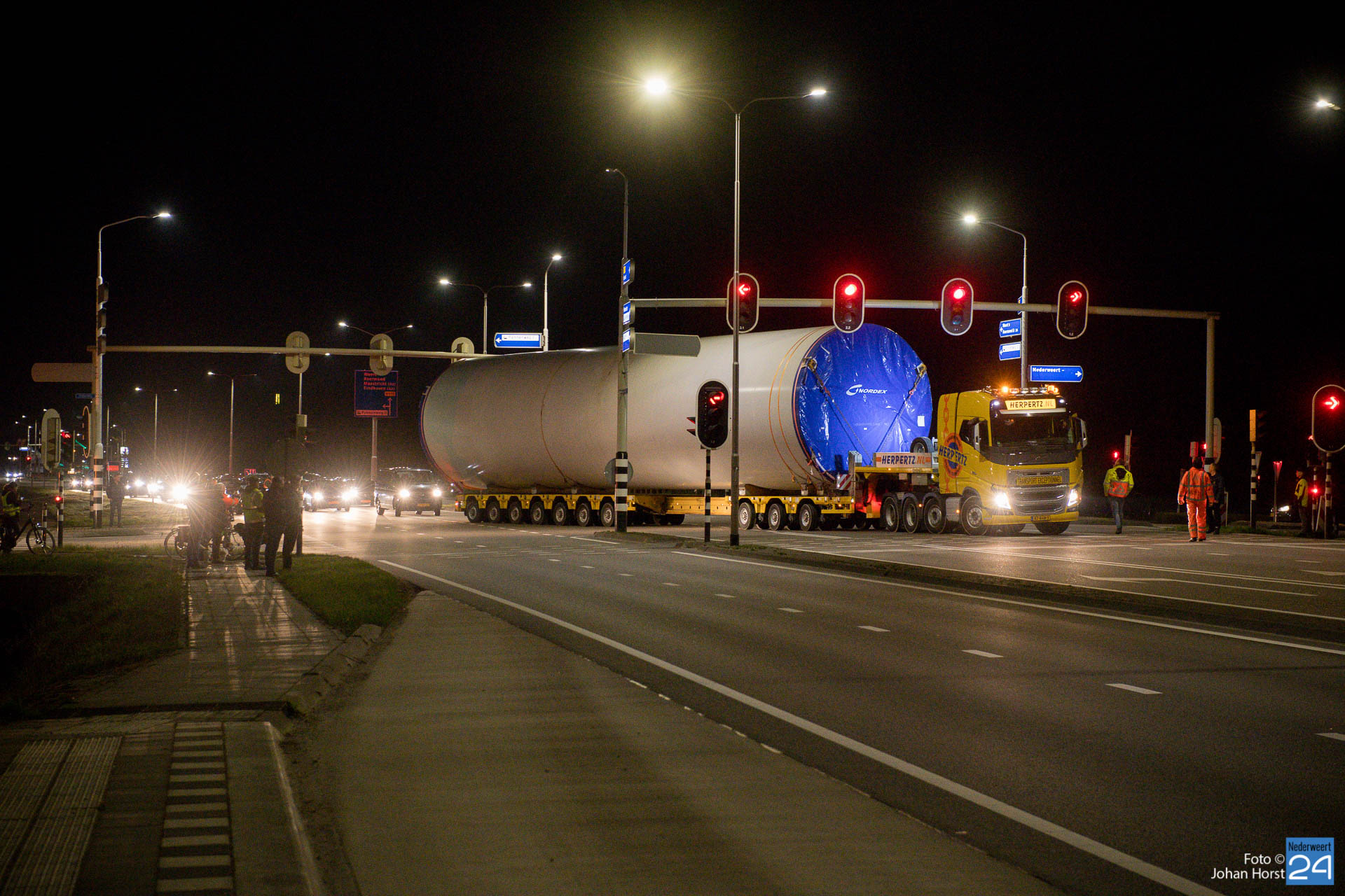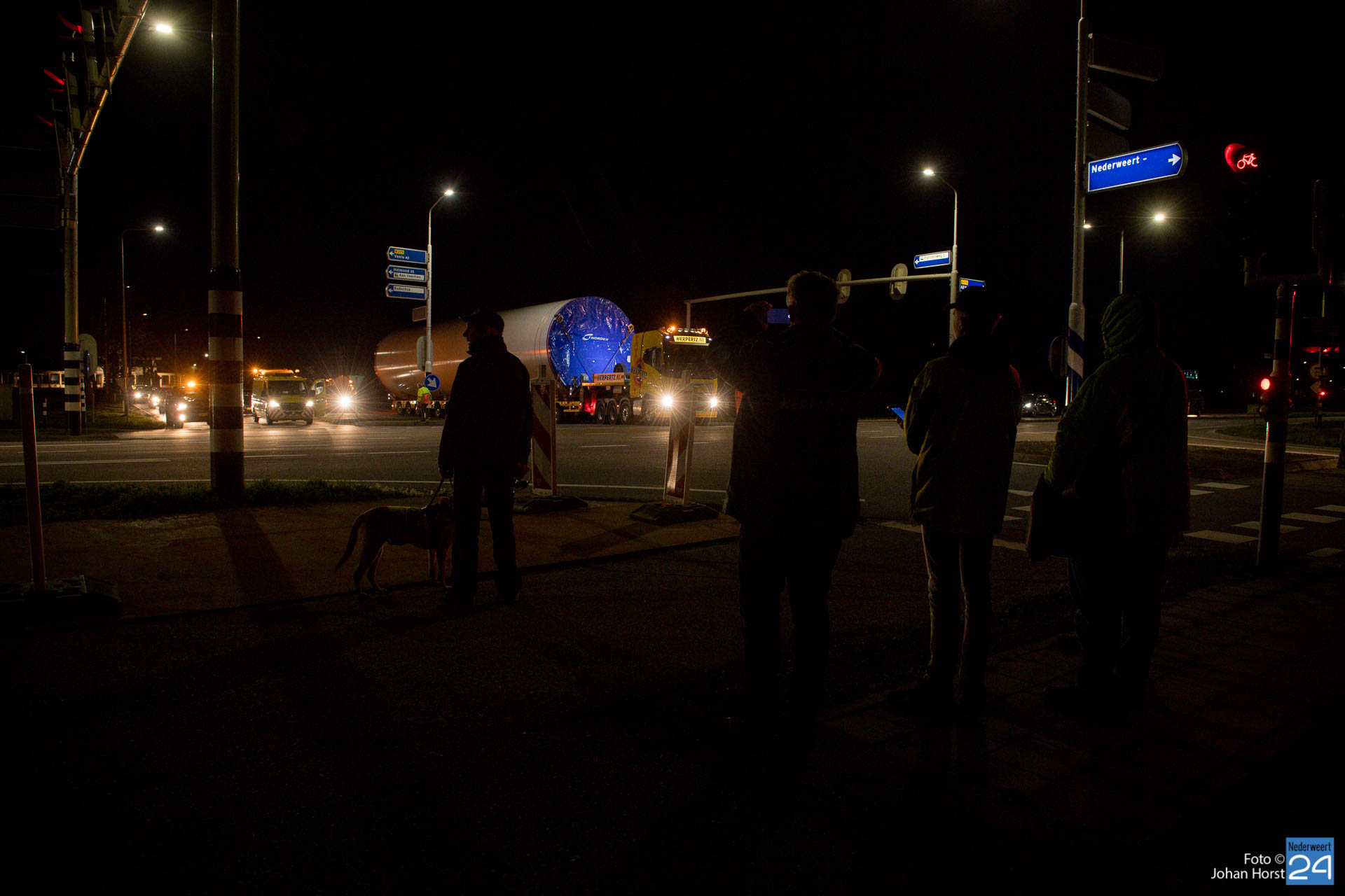 Het was even spannend of het gevaarte onder de verkeerslichten paste op de Randweg Zuid N275. Ondanks het late tijdstip en de naderende avondklok veel belangstelling om het vakmanschap van de chauffeurs te zien.