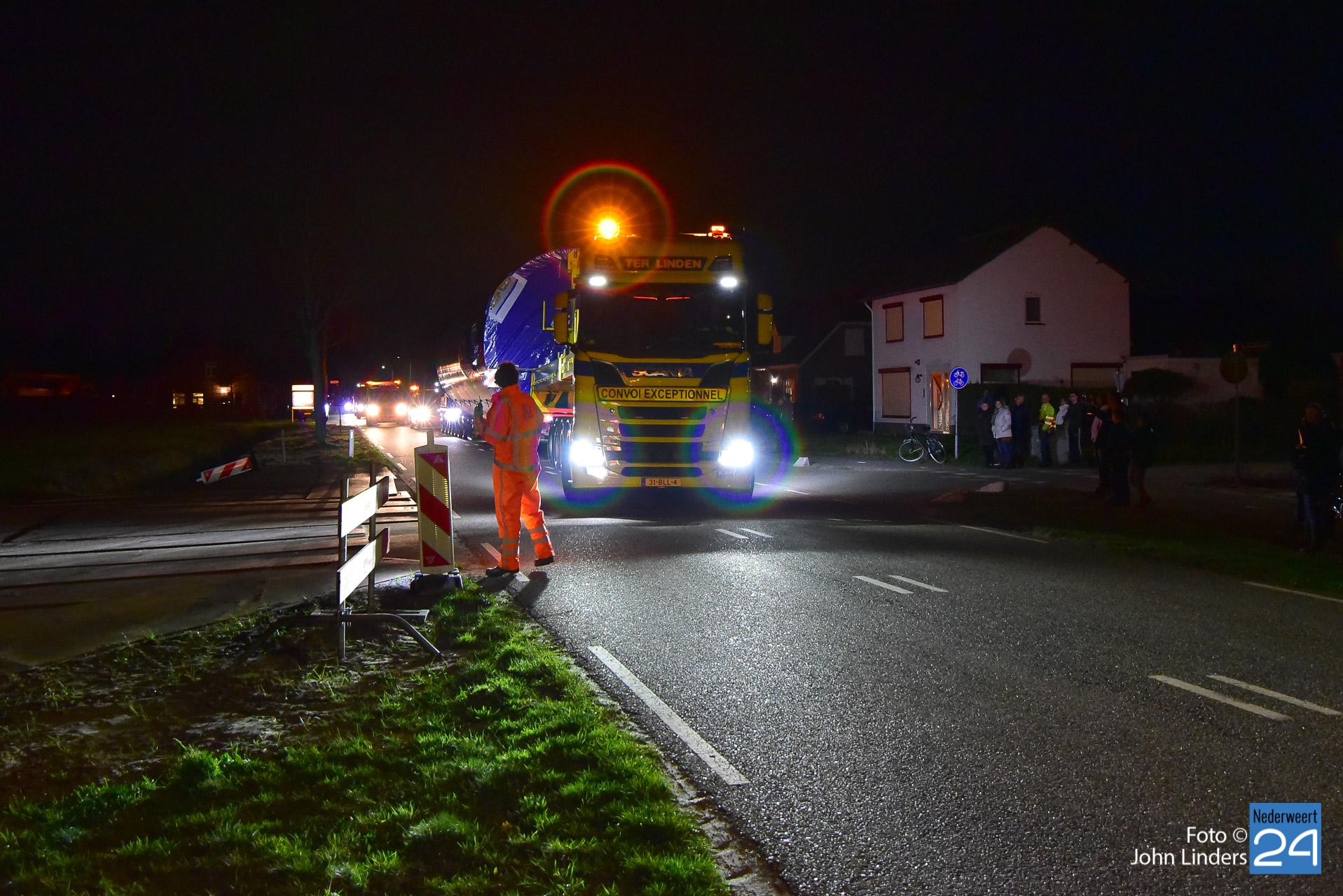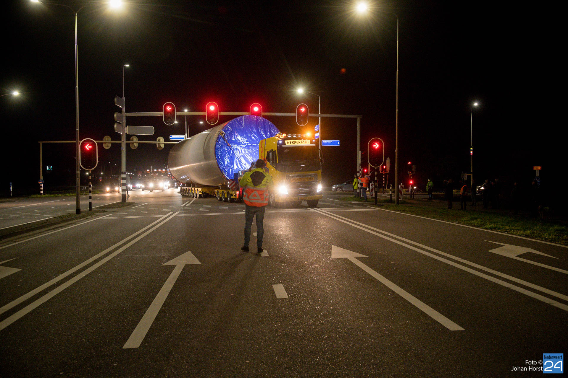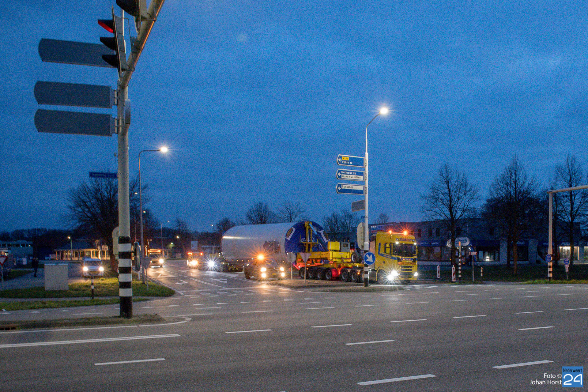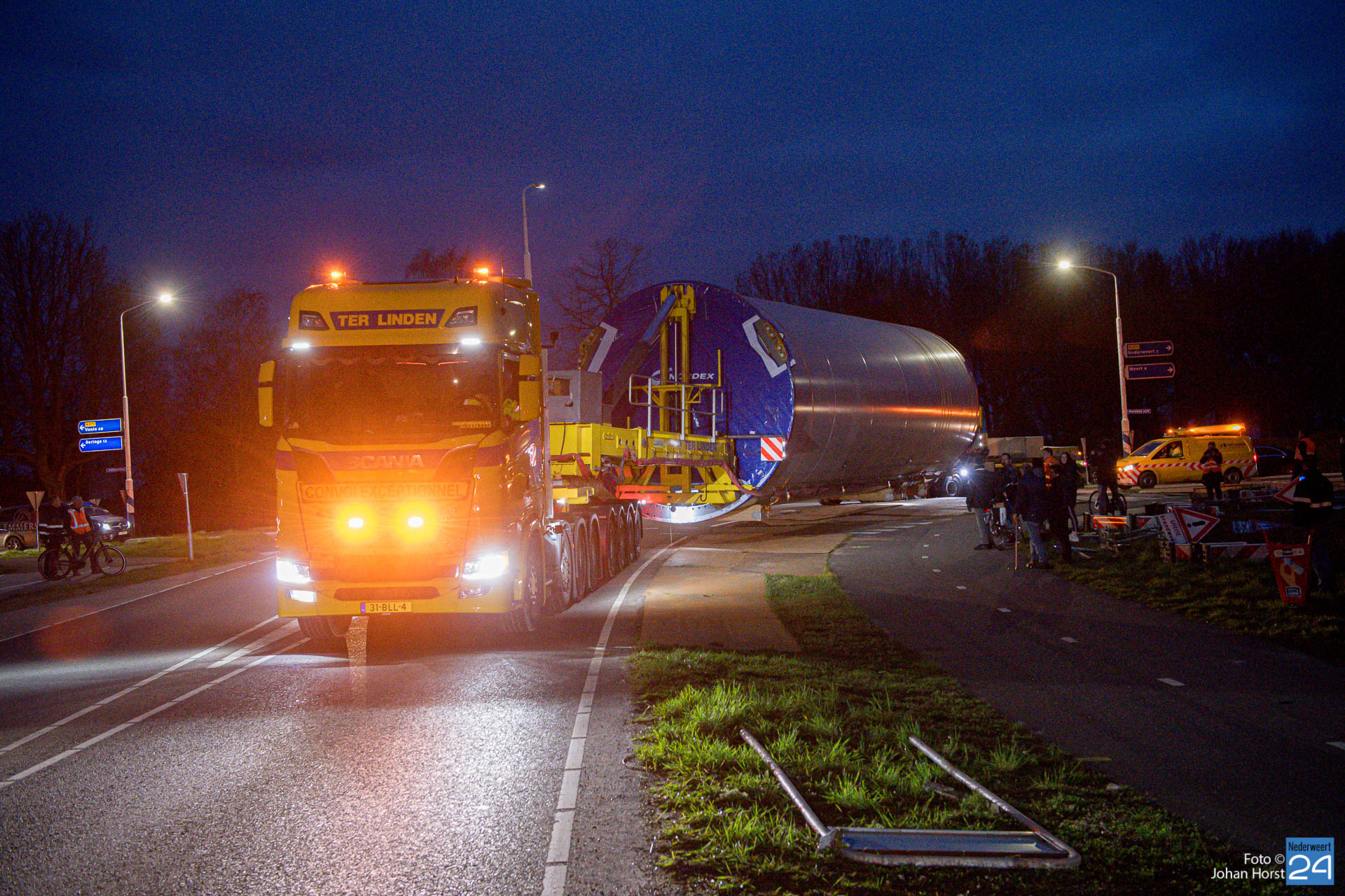 Het was even spannend of het gevaarte onder de verkeerslichten paste op de Randweg Zuid N275. Ondanks het late tijdstip en de naderende avondklok veel belangstelling om het vakmanschap van de chauffeurs te zien.