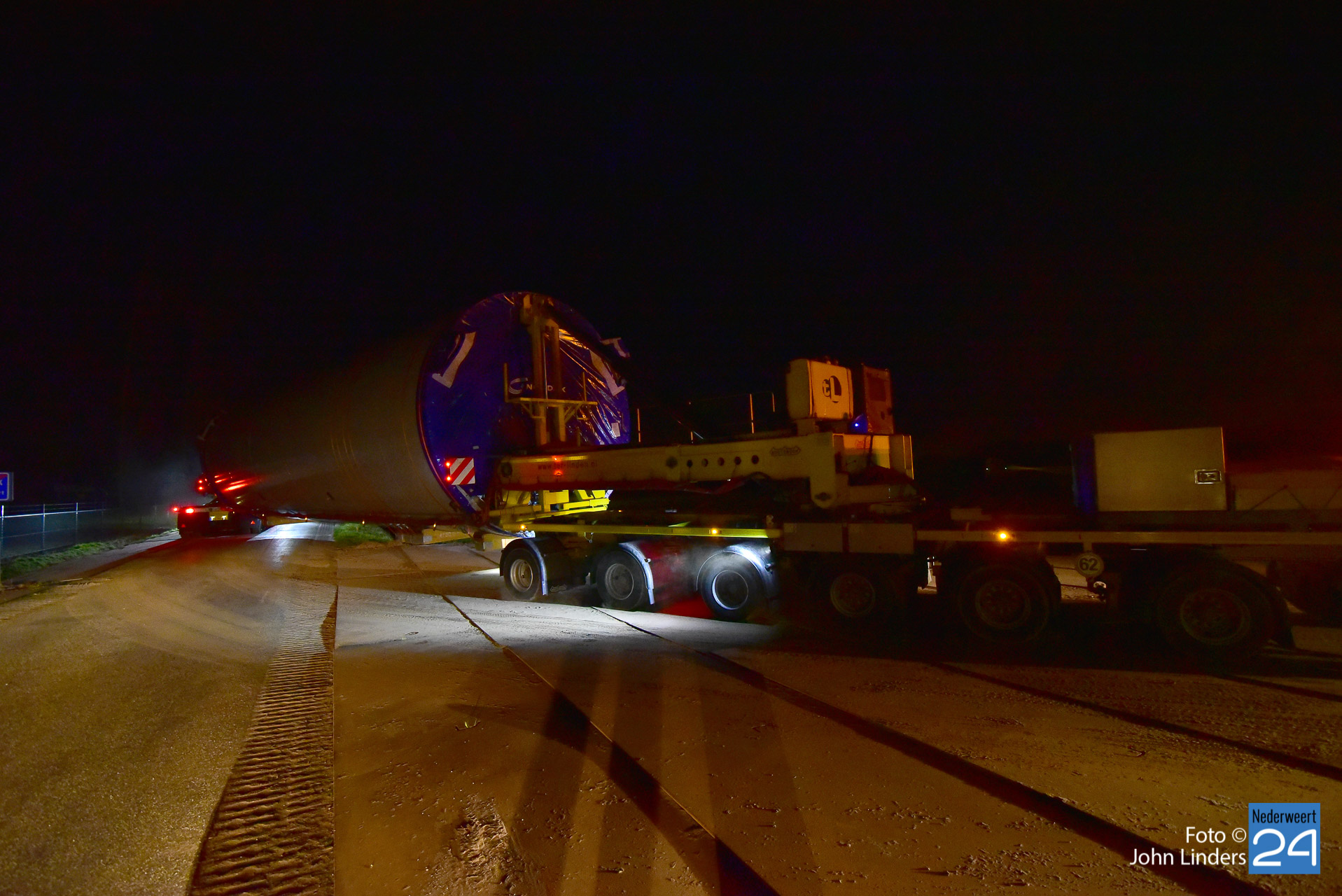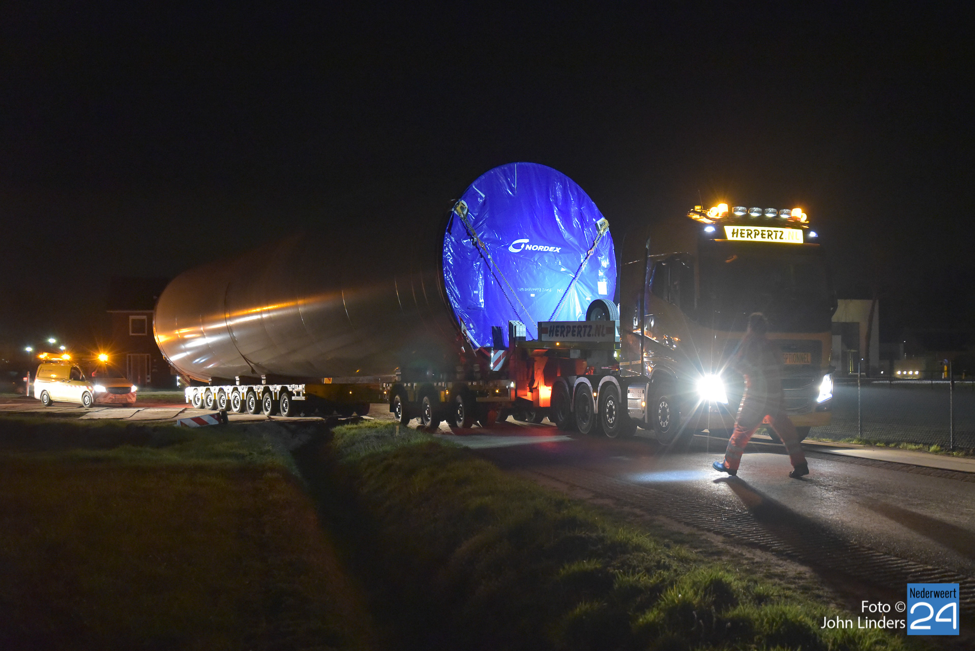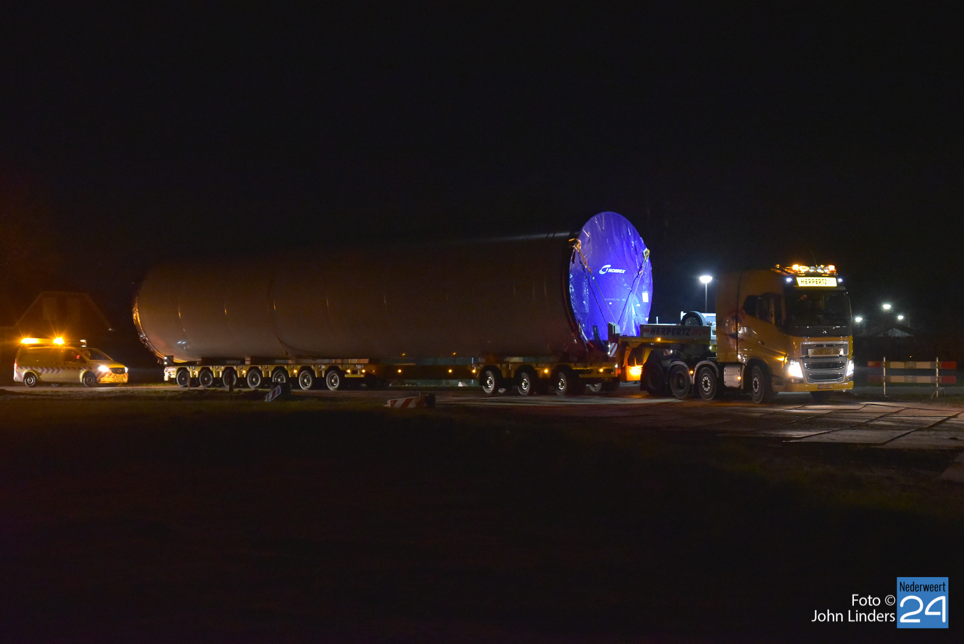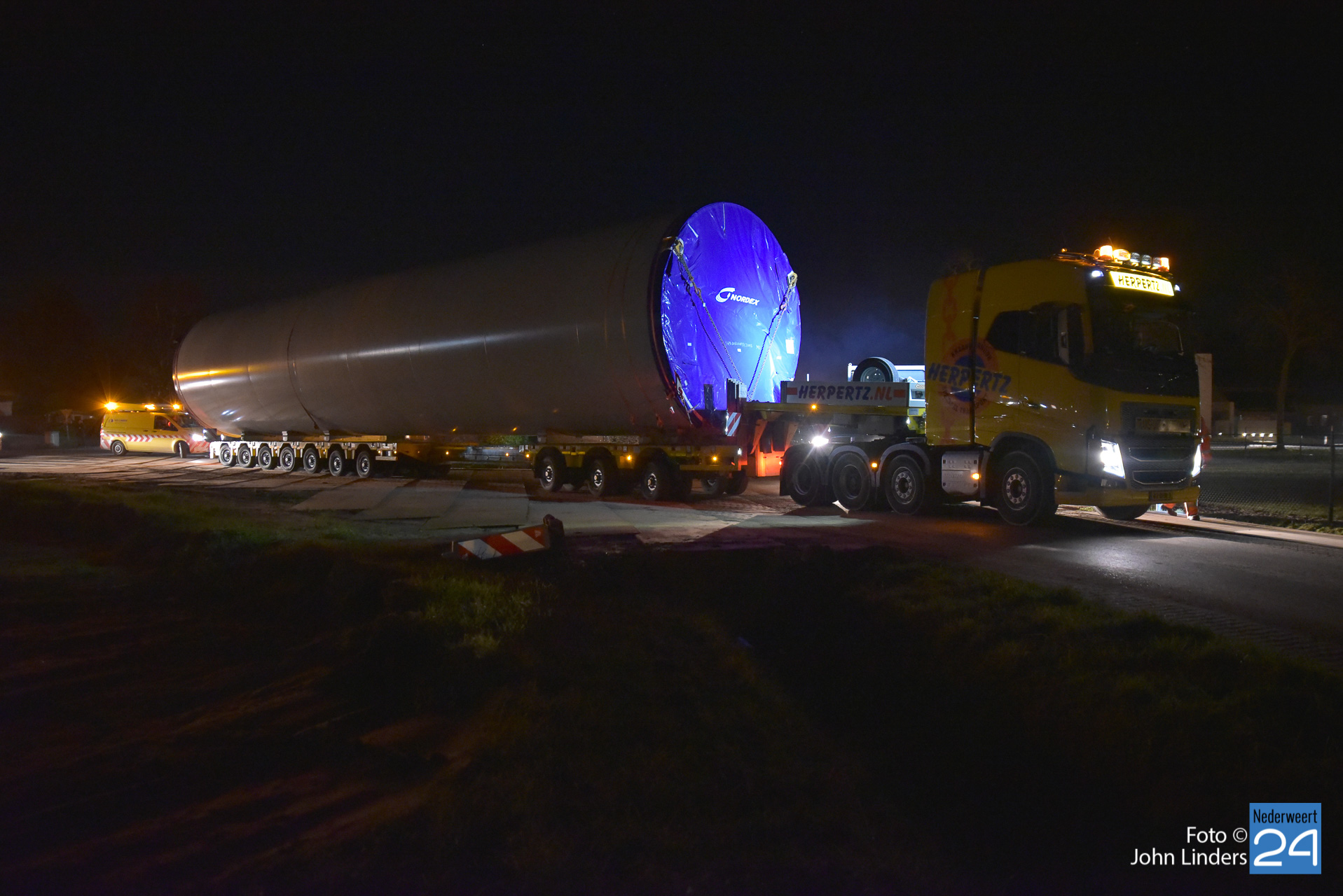 De eerste torendelen van de toekomstige windturbines van Windpark Ospeldijk zijn maandagavond getransporteerd vanuit de kade van Kalle en Bakker in Nederweert.