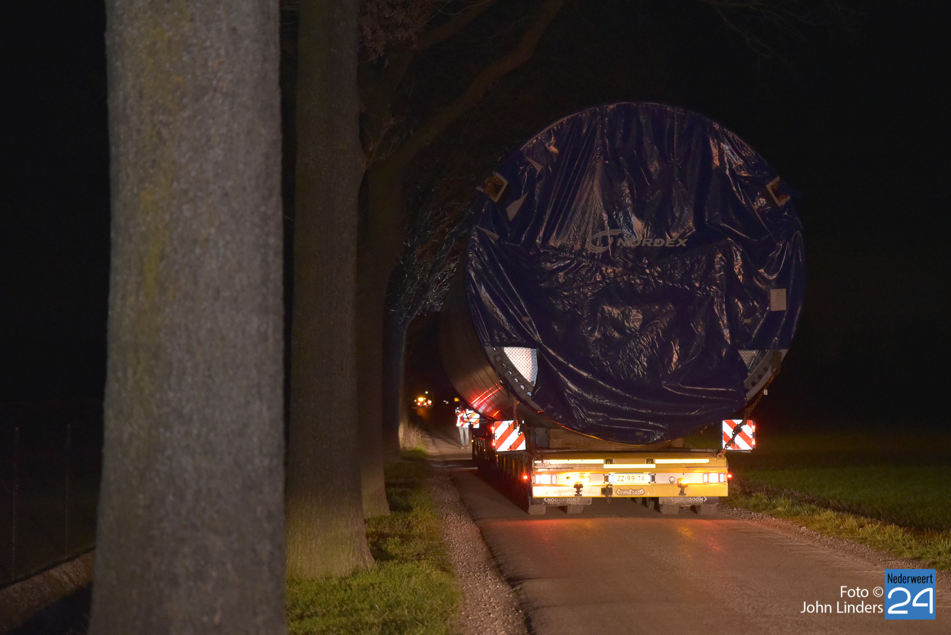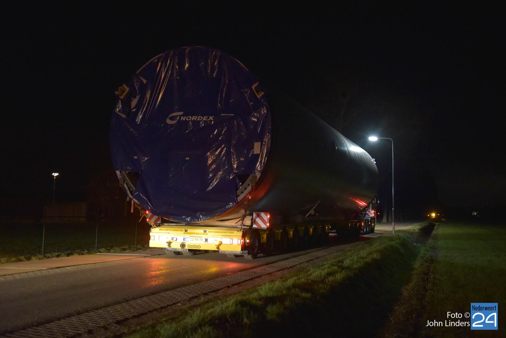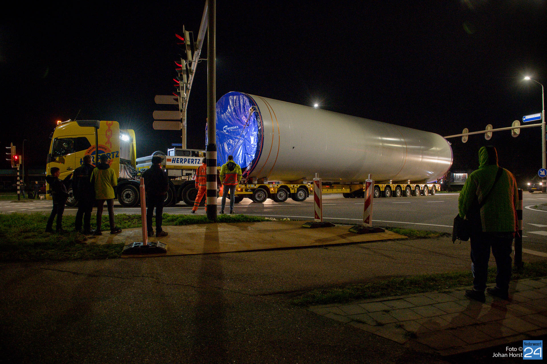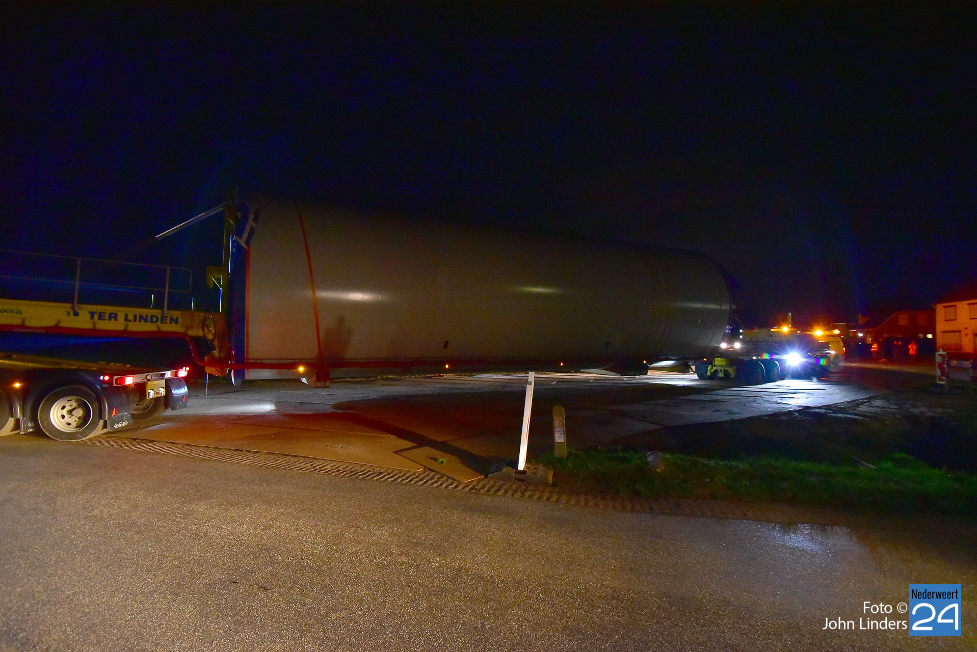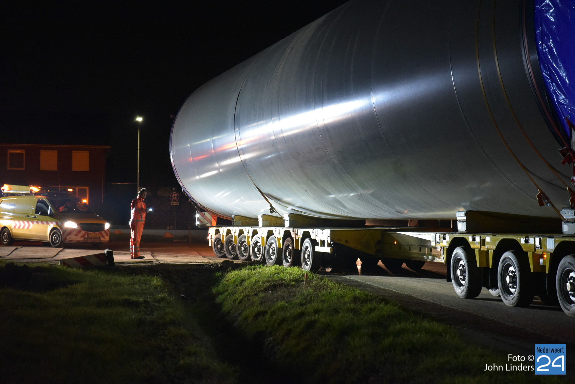 De eerste torendelen van de toekomstige windturbines van Windpark Ospeldijk zijn maandagavond getransporteerd vanuit de kade van Kalle en Bakker in Nederweert.