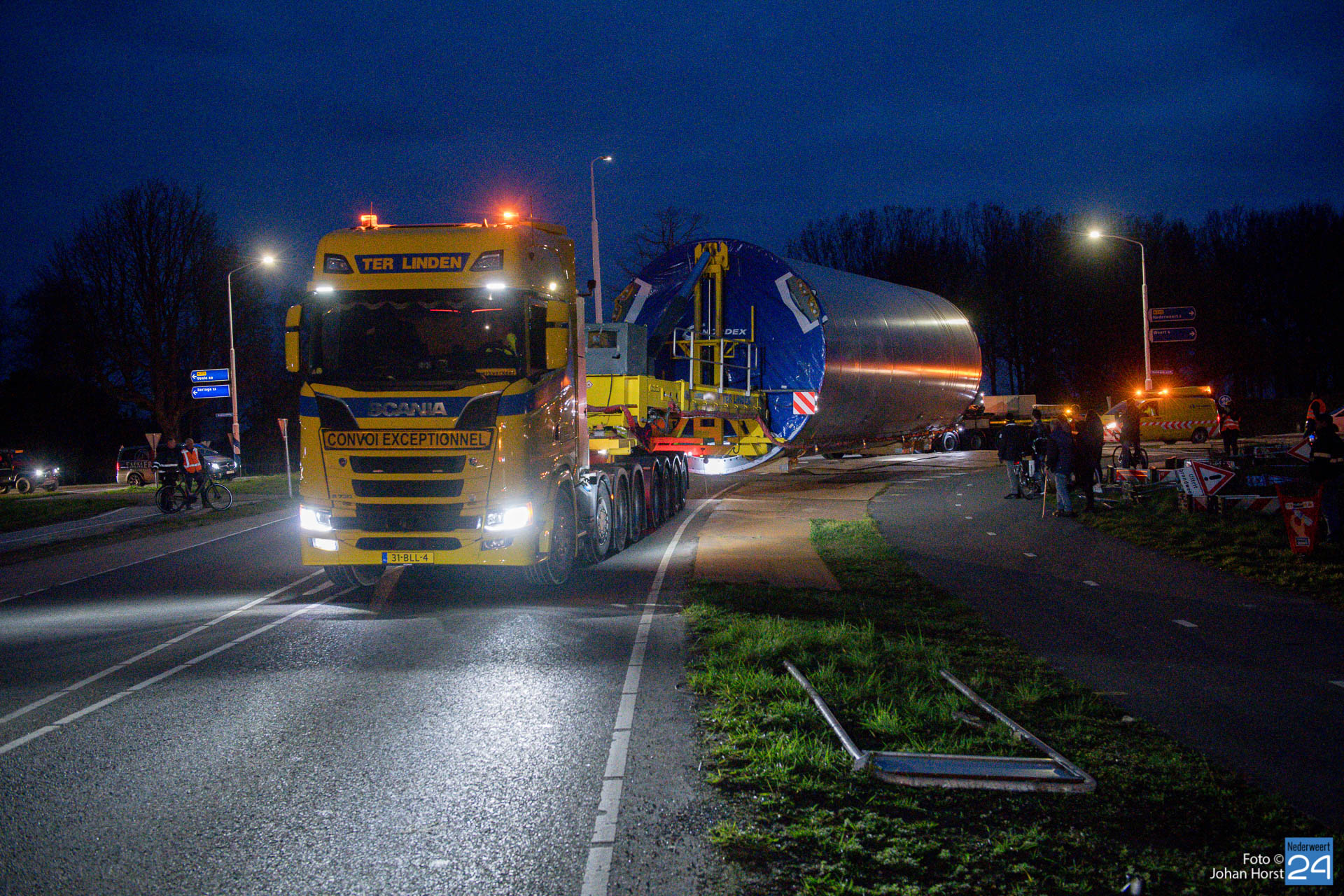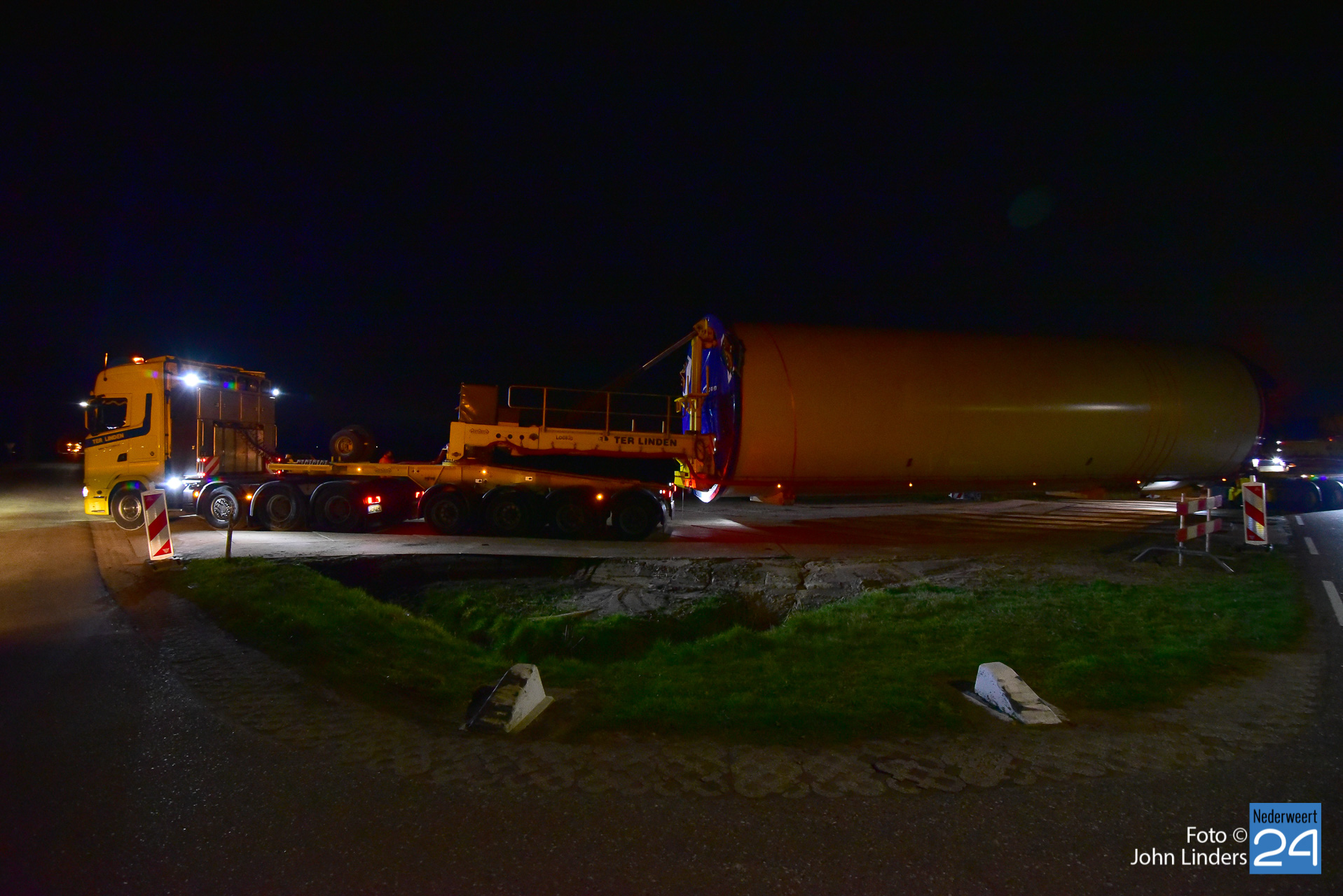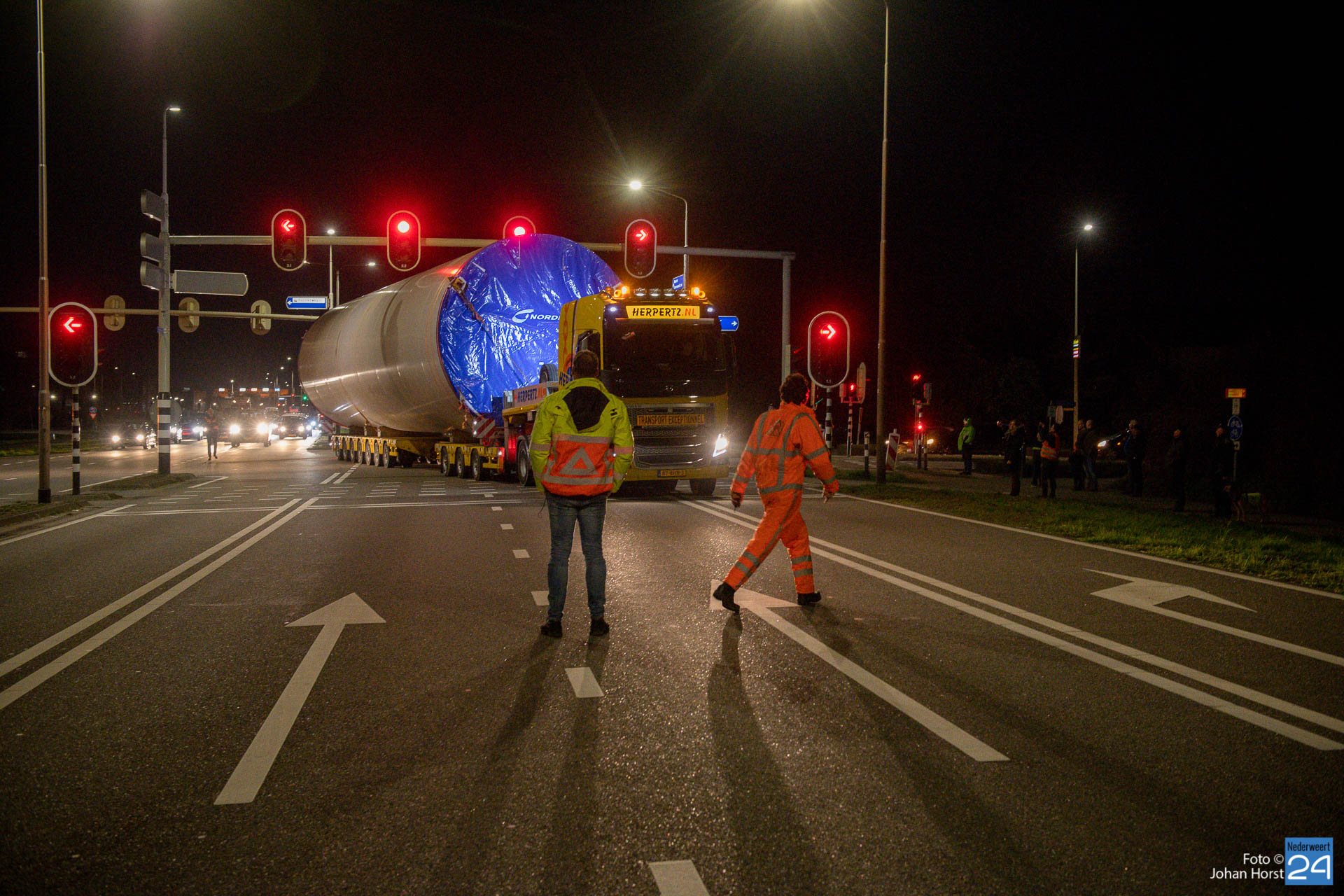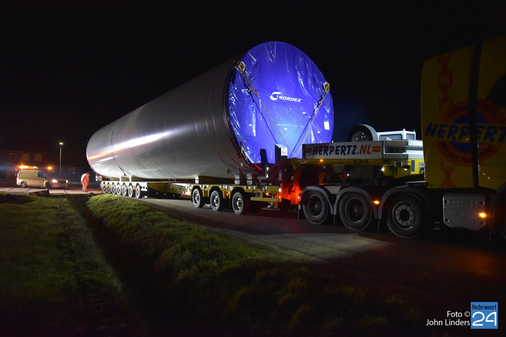 De eerste torendelen van de toekomstige windturbines van Windpark Ospeldijk zijn maandagavond getransporteerd vanuit de kade van Kalle en Bakker in Nederweert.