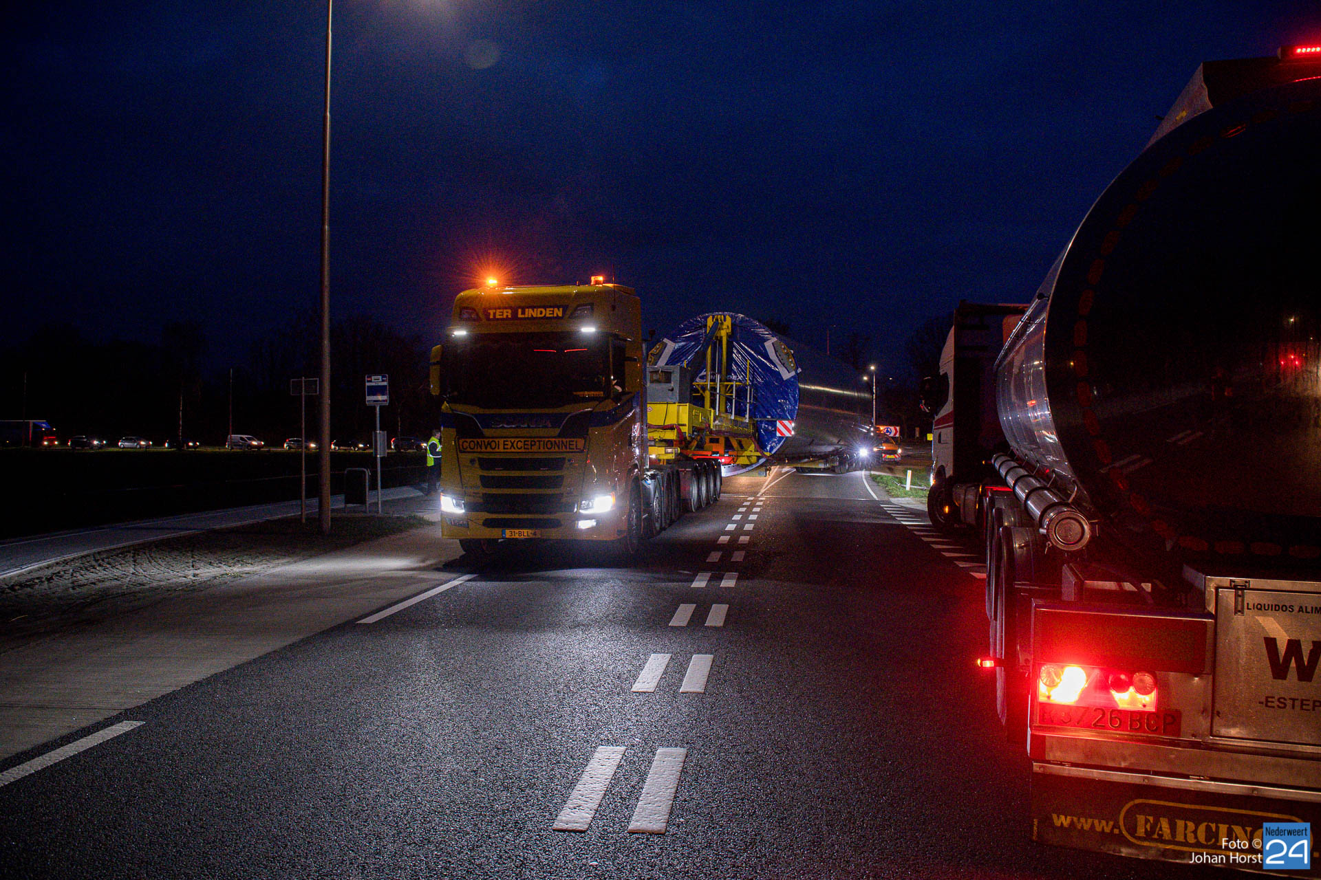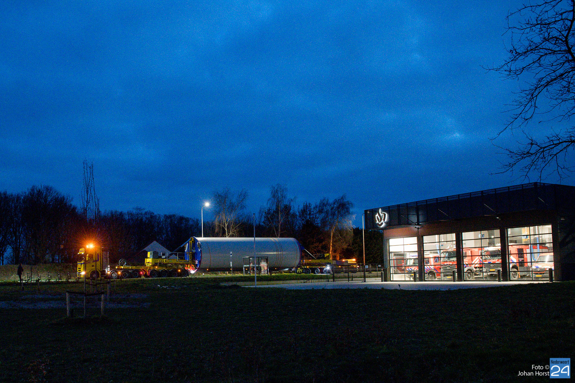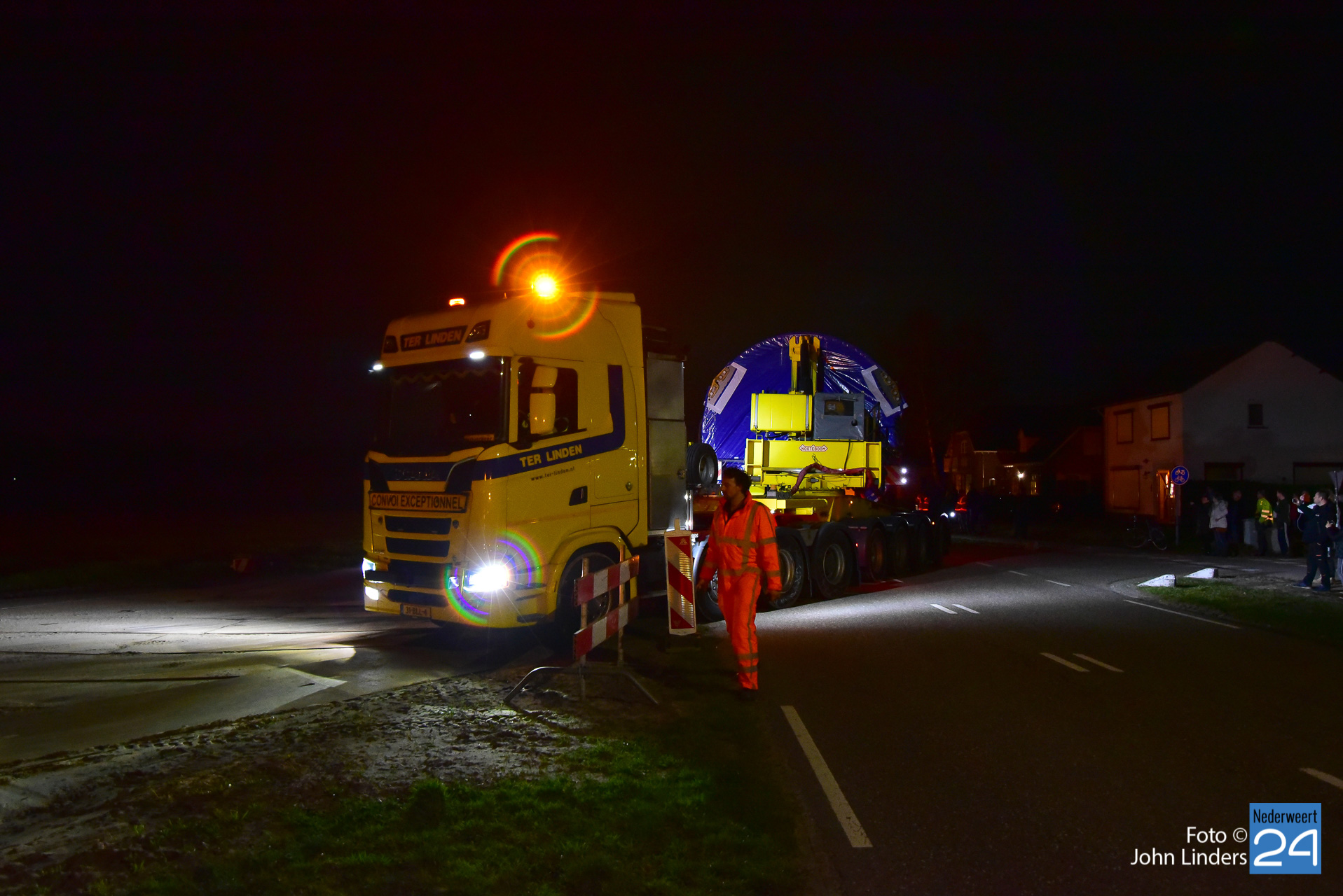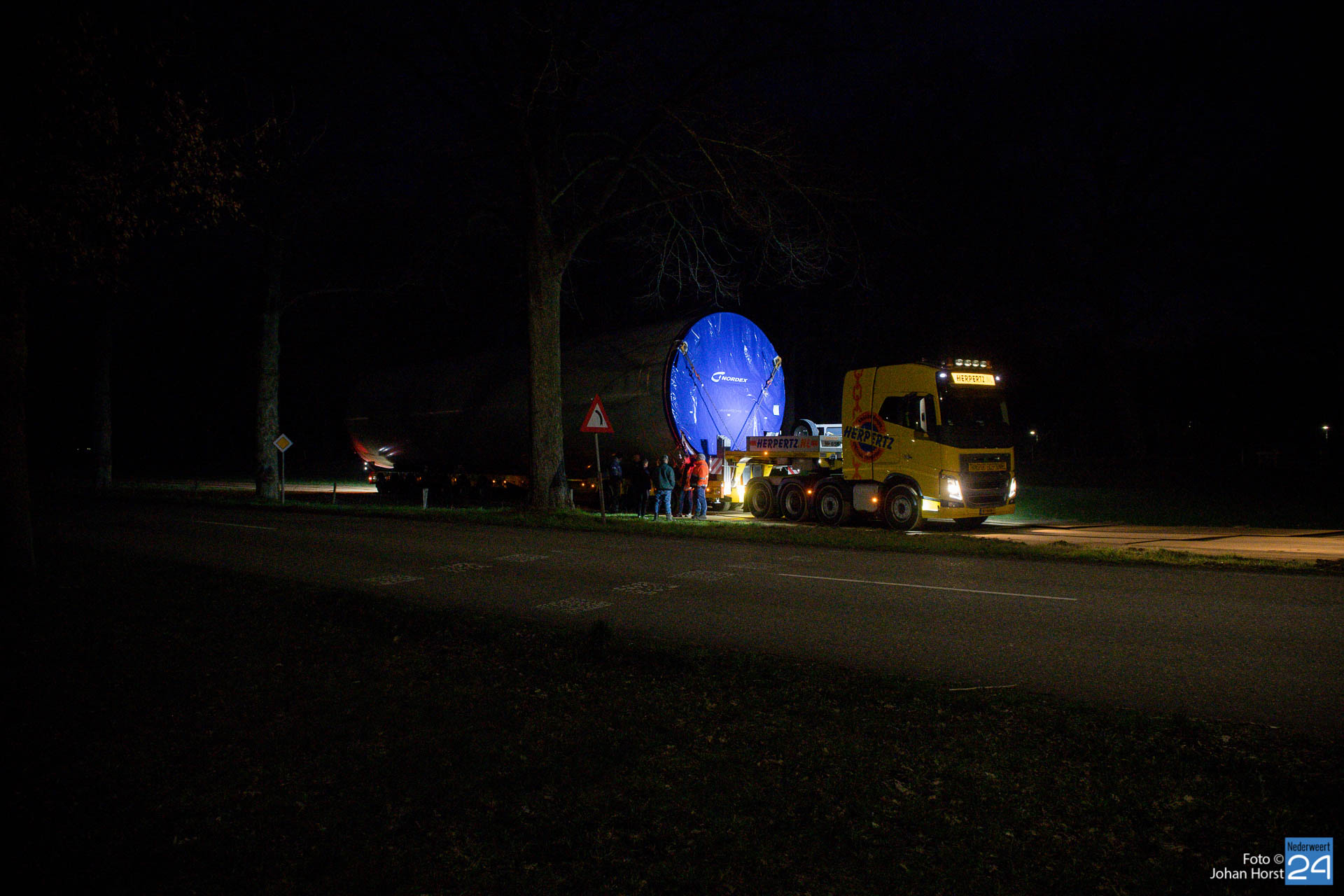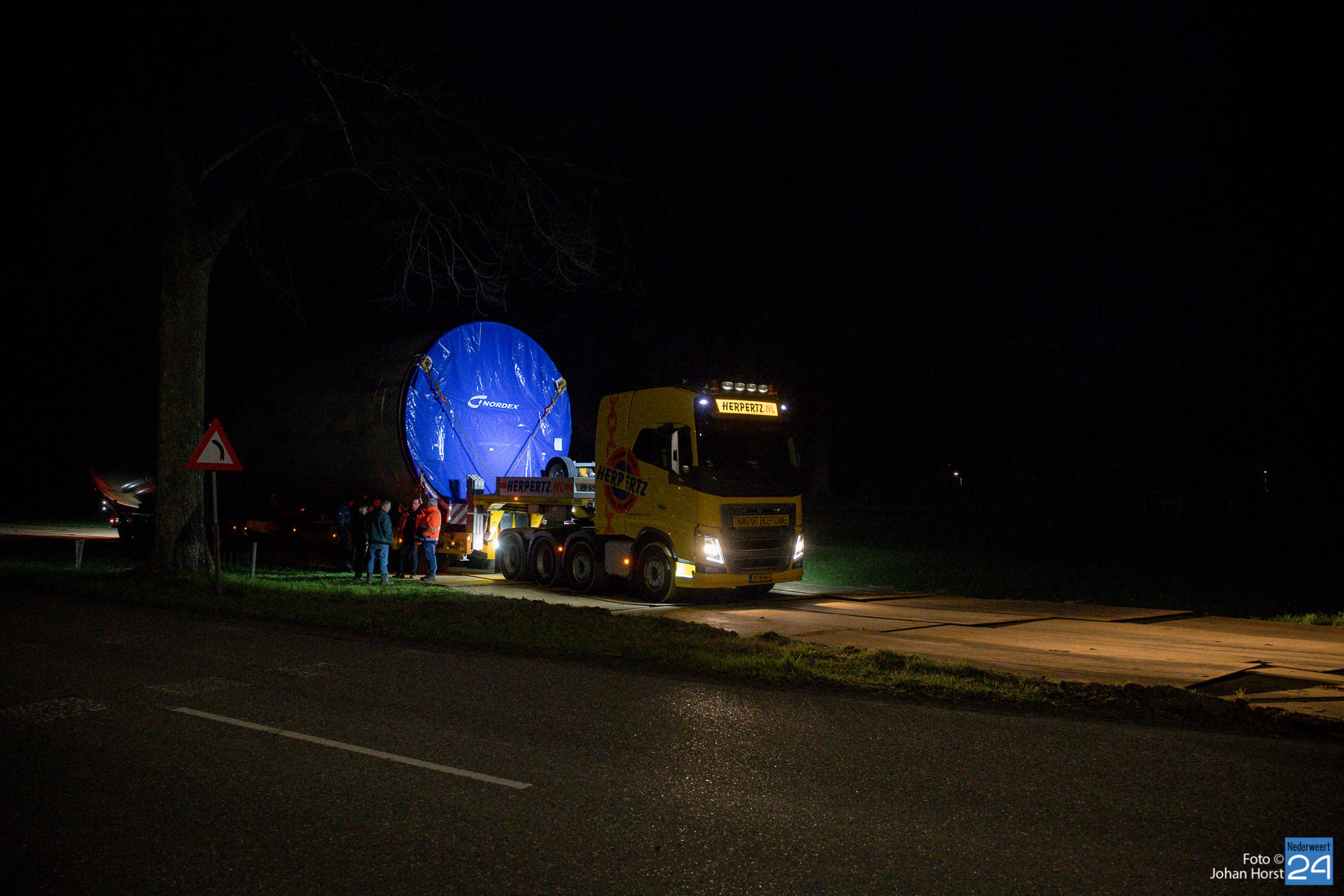 De eerste torendelen van de toekomstige windturbines van Windpark Ospeldijk zijn maandagavond getransporteerd vanuit de kade van Kalle en Bakker in Nederweert.