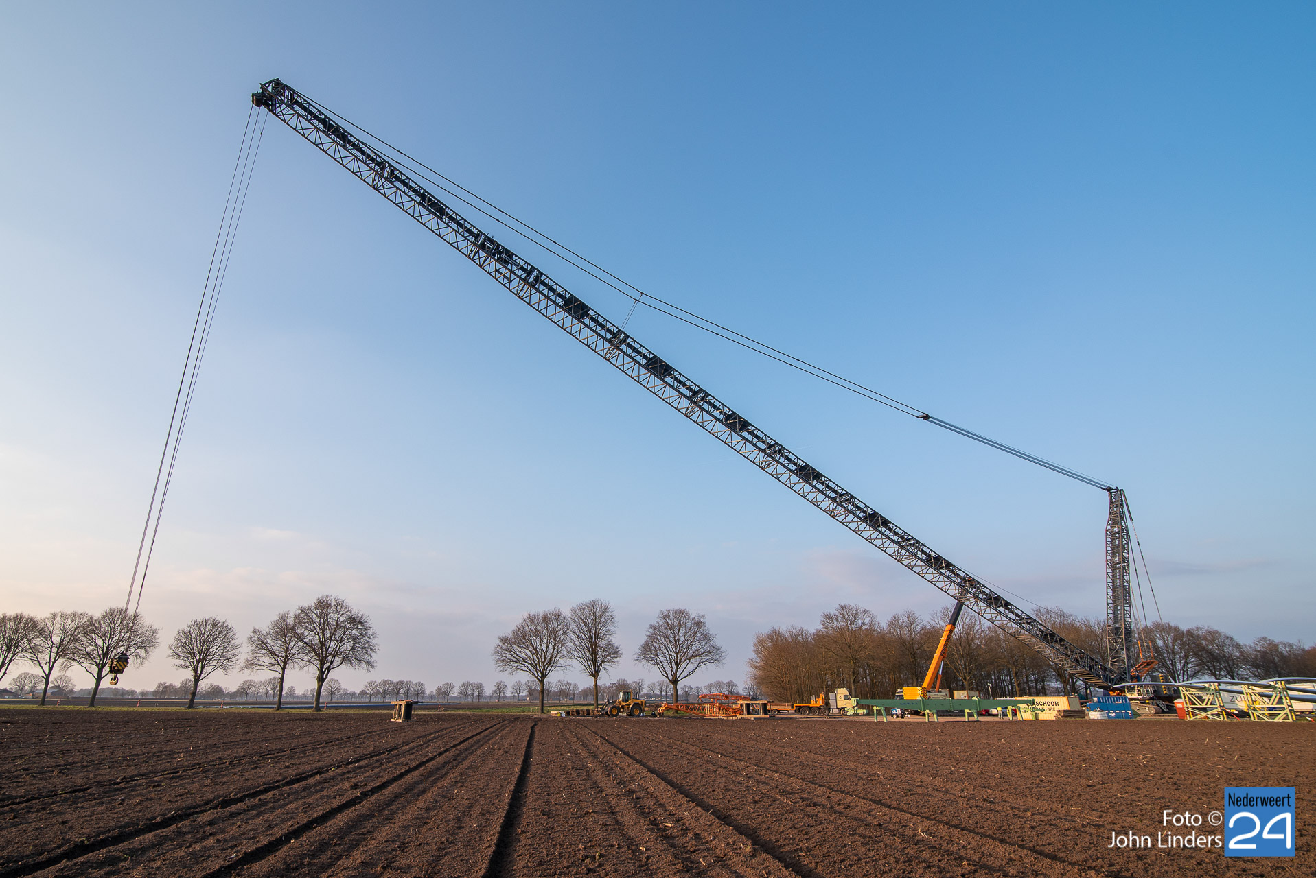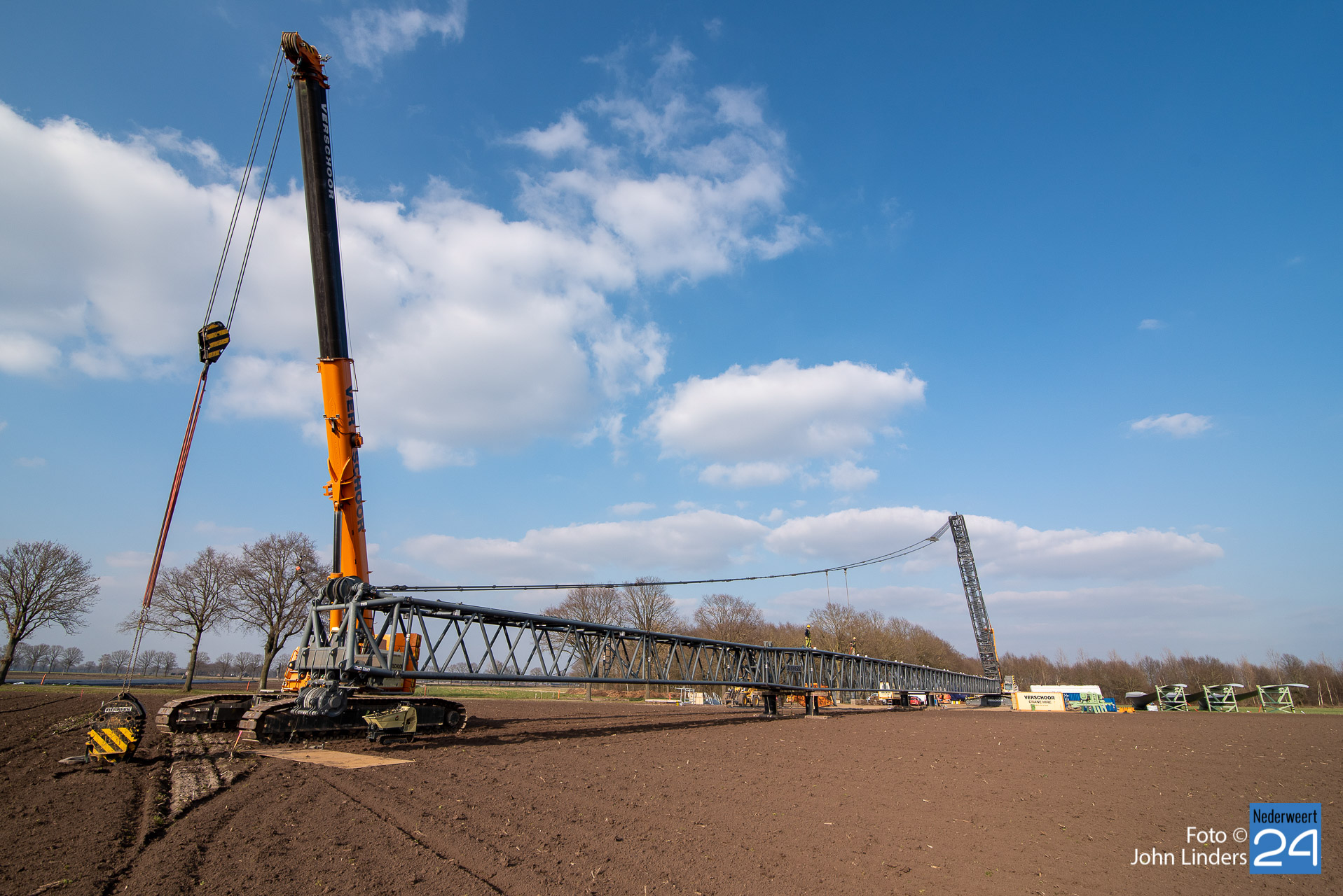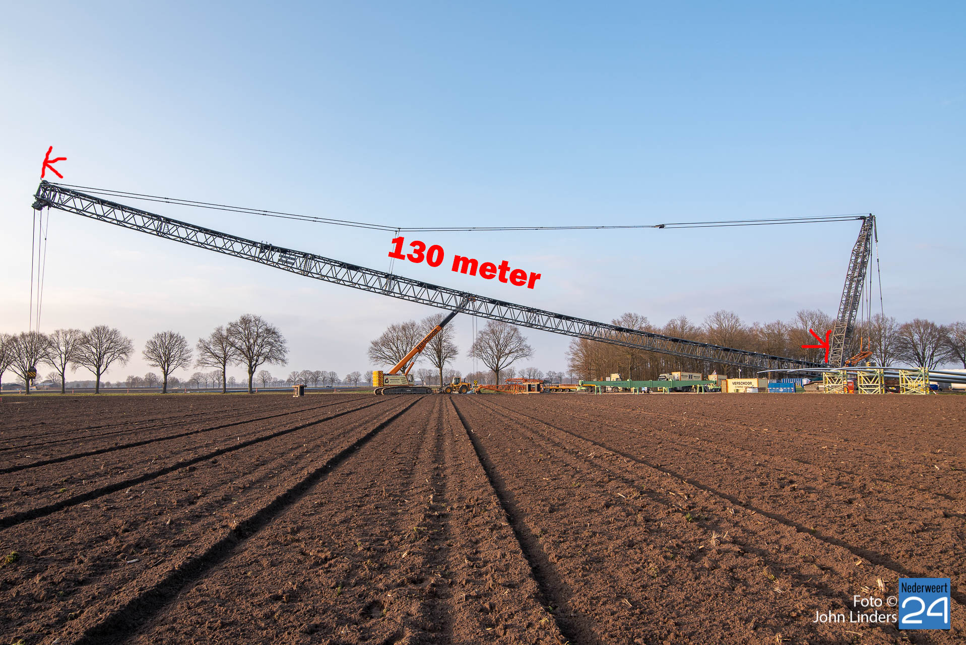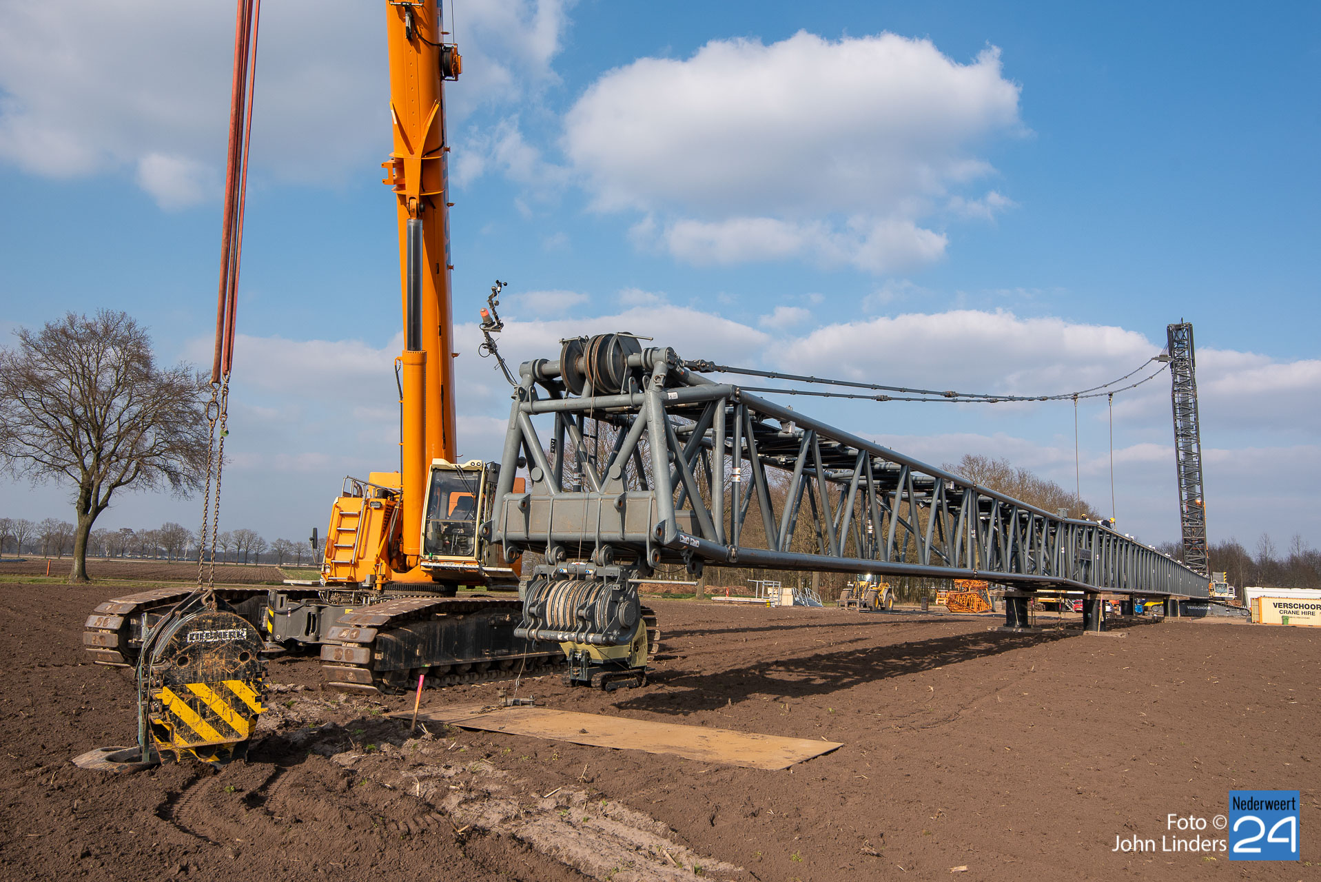 Dinsdagmiddag is een kraan van 130 meter opgebouwd voor de bouw van de vier windmolens in Ospeldijk. De kraan is 130 meter hoog en daar bovenop komt nog eens een 12 meter lange ‘JIP’, een tweede knikarm aan het uiteinde van de eerste.