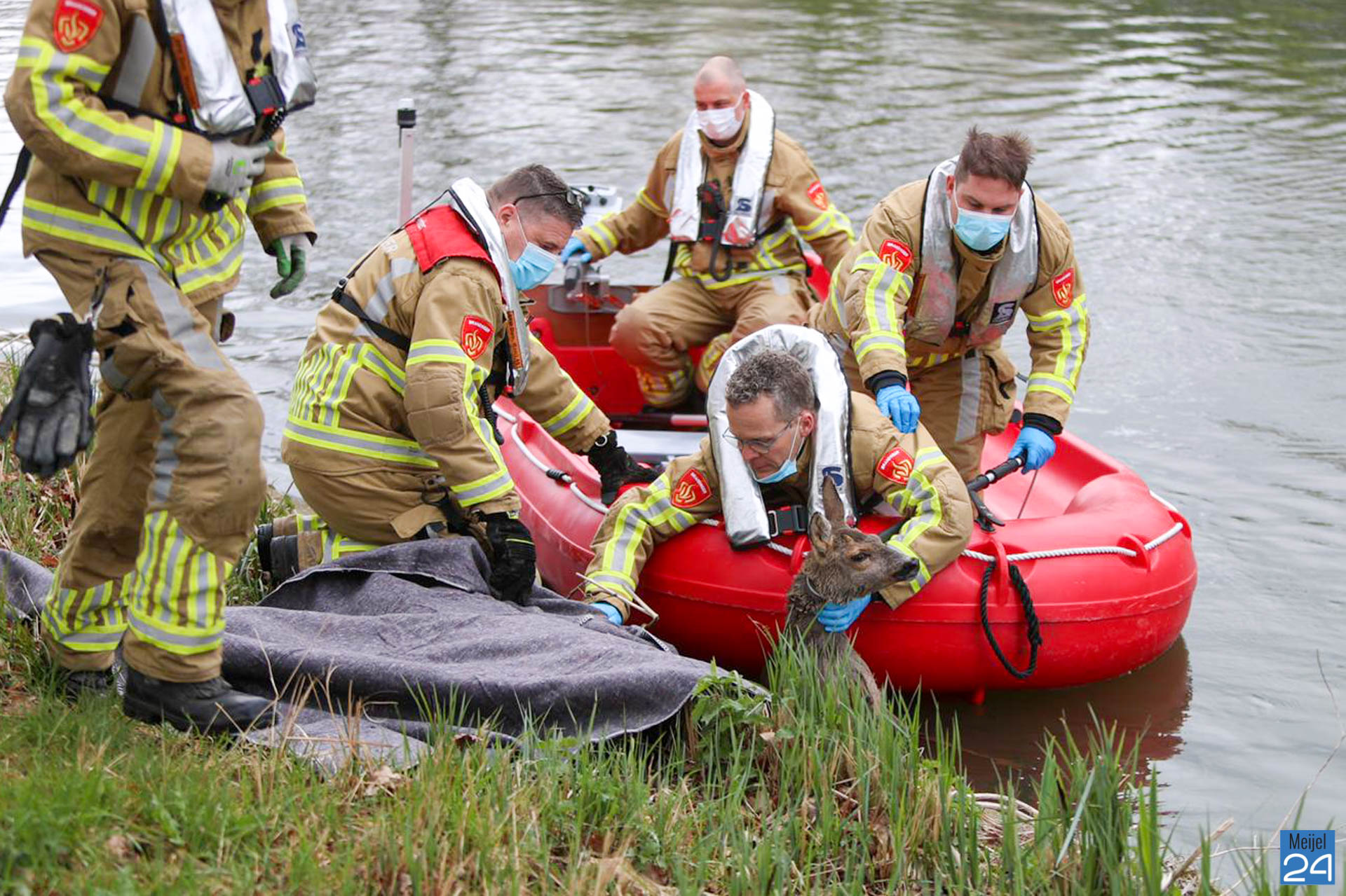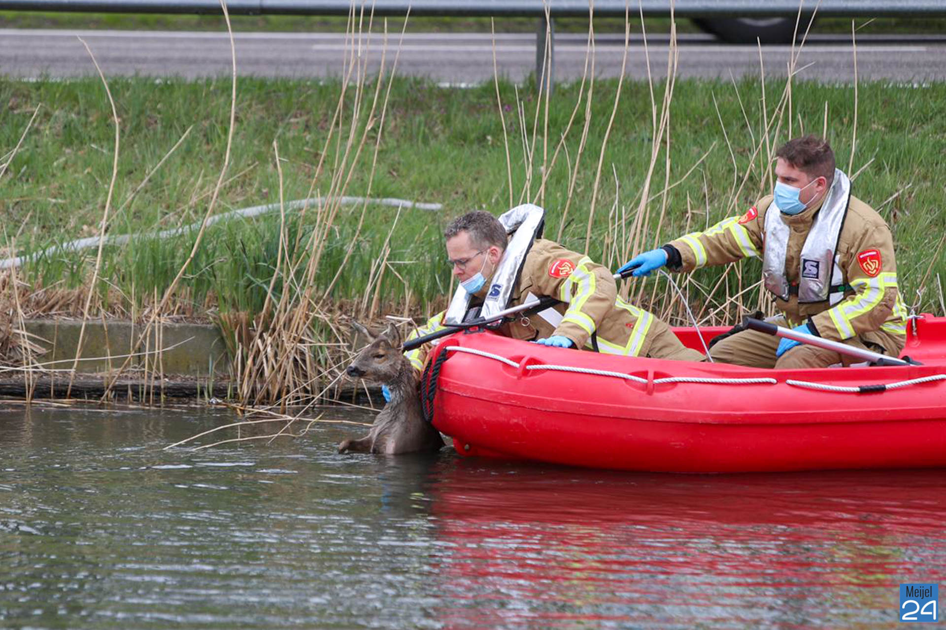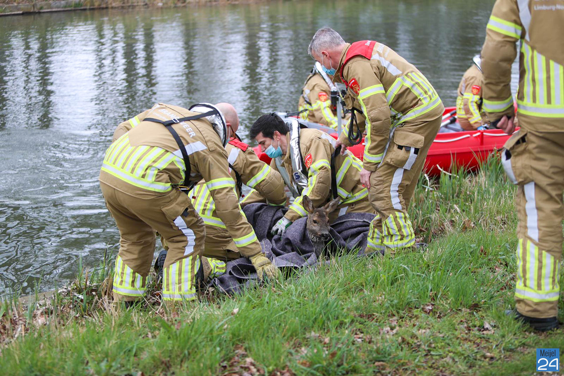 De brandweer is met een boot het water opgegaan en heeft het dier uit het kanaal gehaald. Daarna hebben ze het dier in een wei gelegd waar het kon bekomen. Door het koude water is het dier ernstig verzwakt. De dierenambu is opgeroepen.