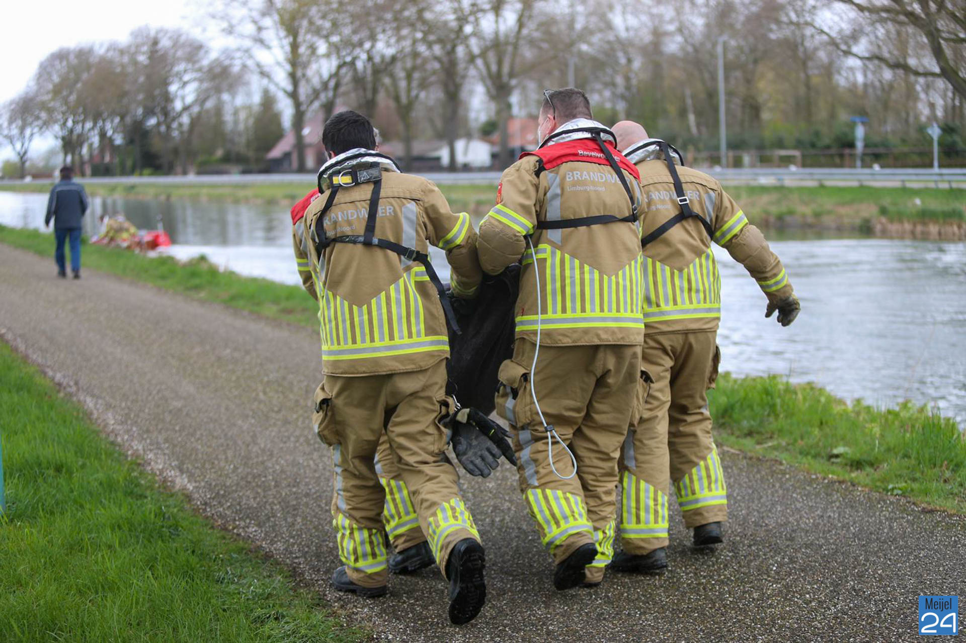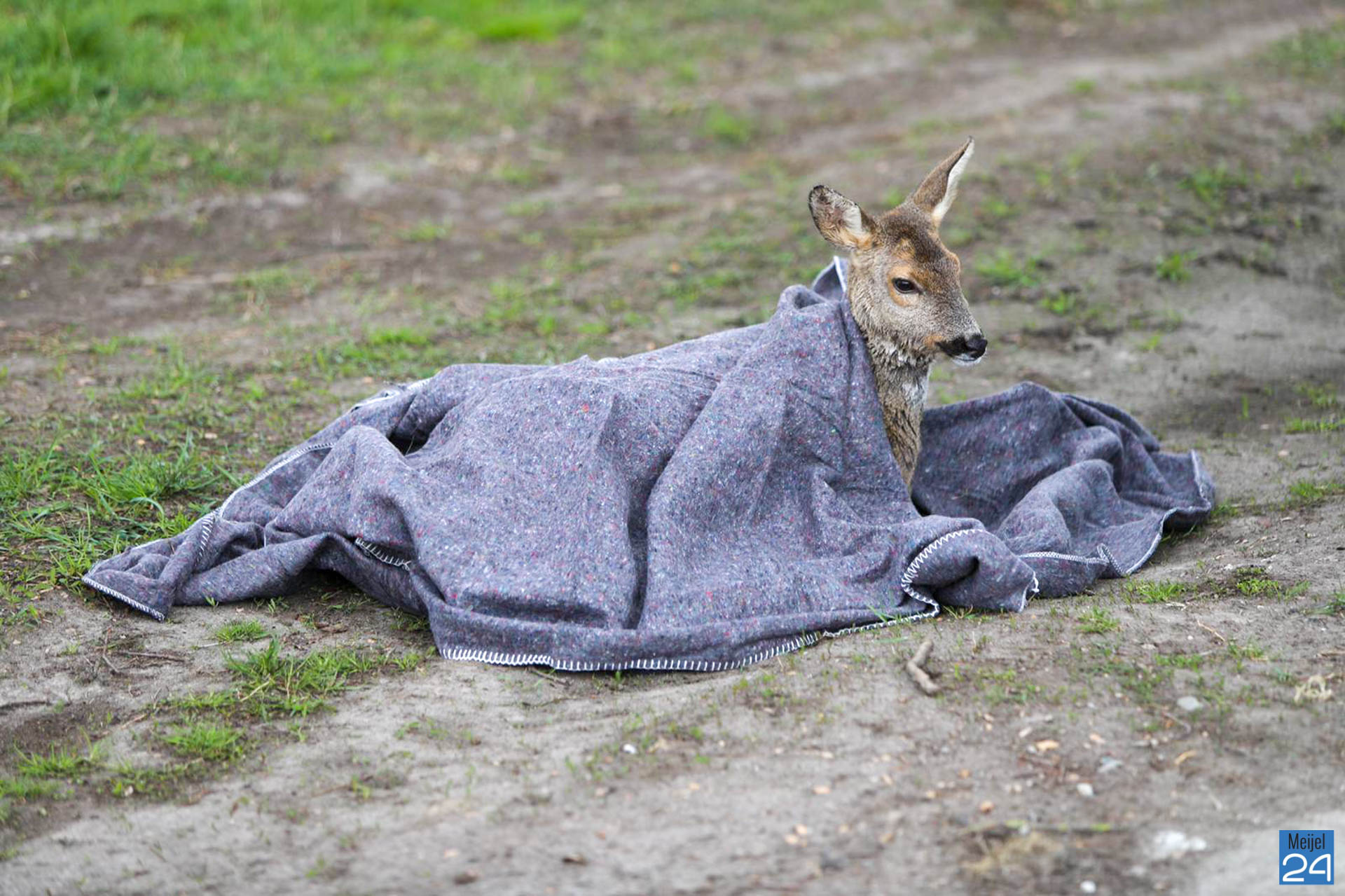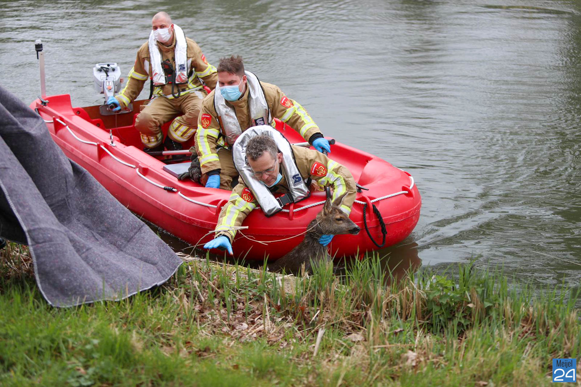 De brandweer is met een boot het water opgegaan en heeft het dier uit het kanaal gehaald. Daarna hebben ze het dier in een wei gelegd waar het kon bekomen. Door het koude water is het dier ernstig verzwakt. De dierenambu is opgeroepen.