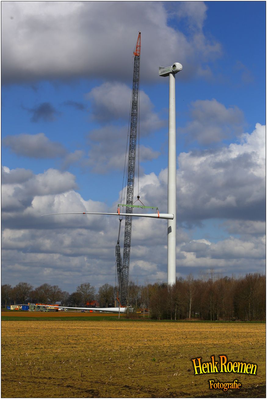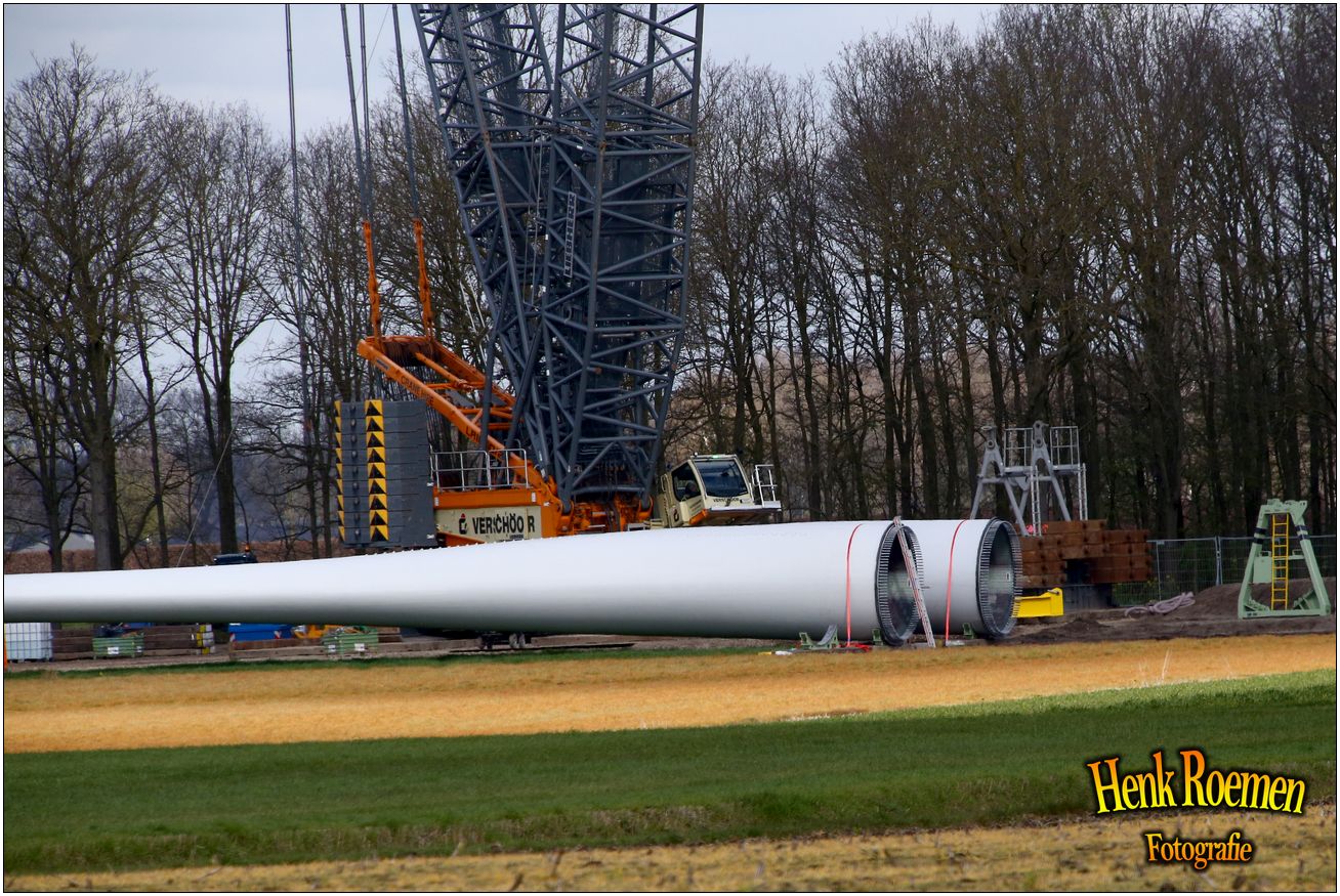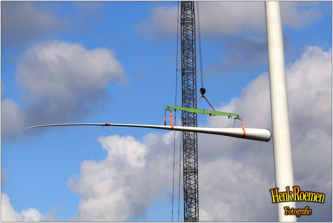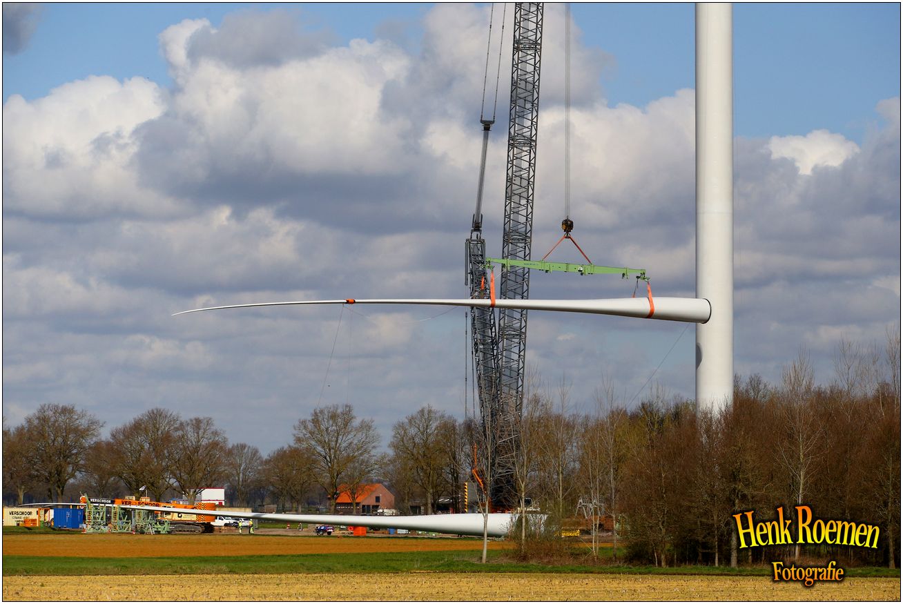 Dinsdag werden de drie rotorbladen omhoog gehesen. Dat zorgde voor een spectaculair schouwspel. Deze gigantische bladen zijn afgelopen weken door een gespecialiseerd transportbedrijf naar Ospeldijk gebracht.
