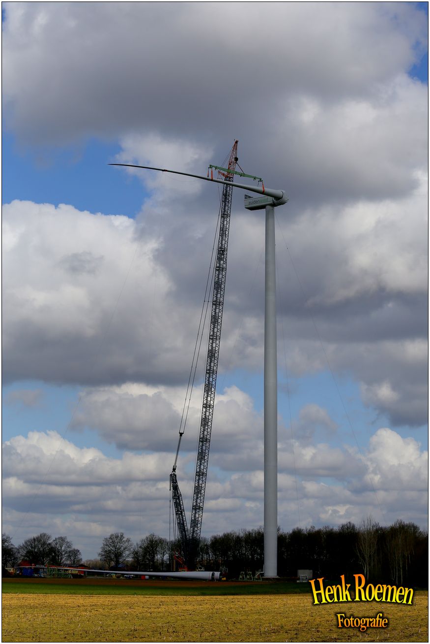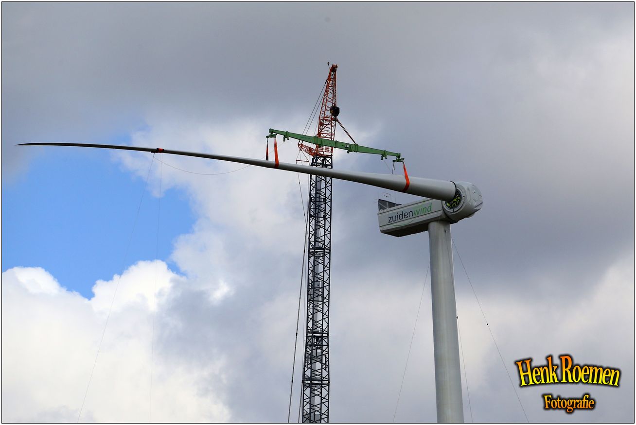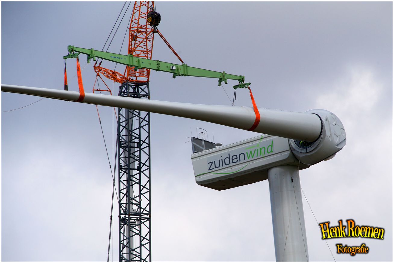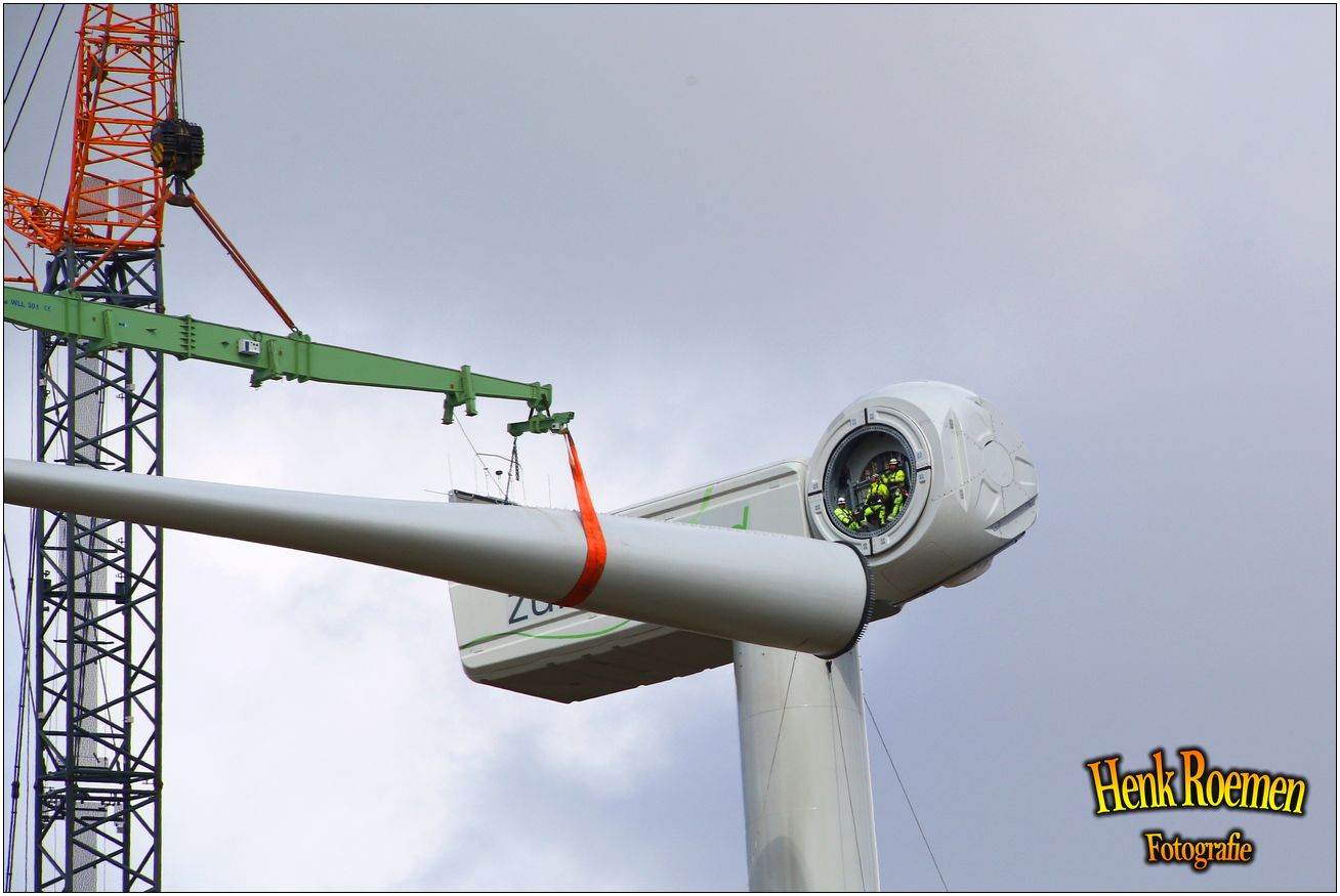 Dinsdag werden de drie rotorbladen omhoog gehesen. Dat zorgde voor een spectaculair schouwspel. Deze gigantische bladen zijn afgelopen weken door een gespecialiseerd transportbedrijf naar Ospeldijk gebracht.