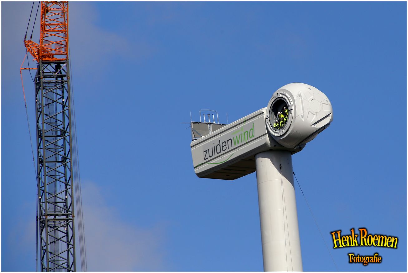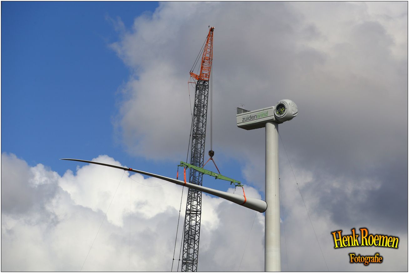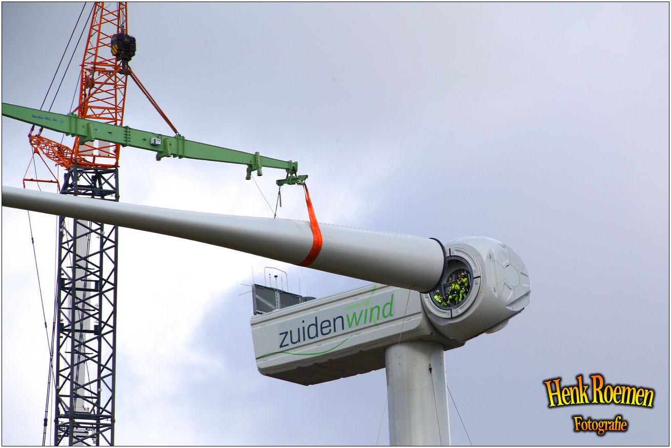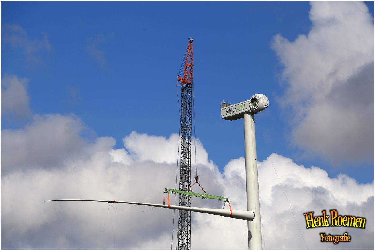 Dinsdag werden de drie rotorbladen omhoog gehesen. Dat zorgde voor een spectaculair schouwspel. Deze gigantische bladen zijn afgelopen weken door een gespecialiseerd transportbedrijf naar Ospeldijk gebracht.