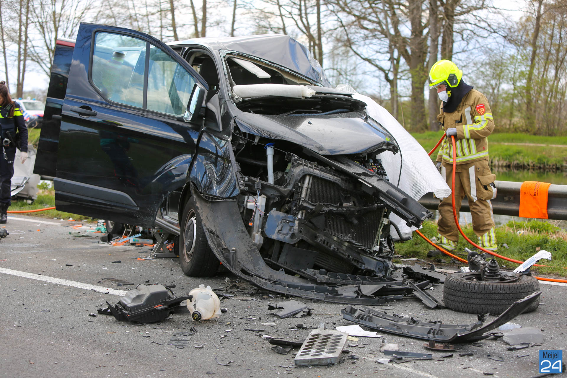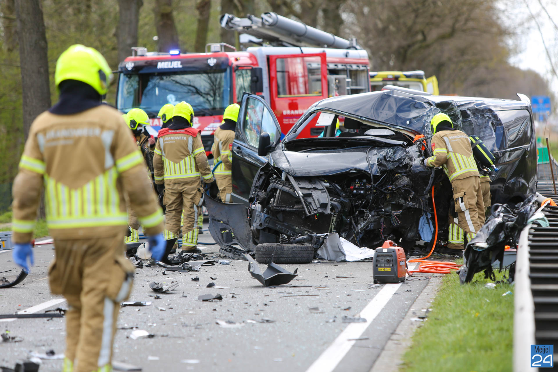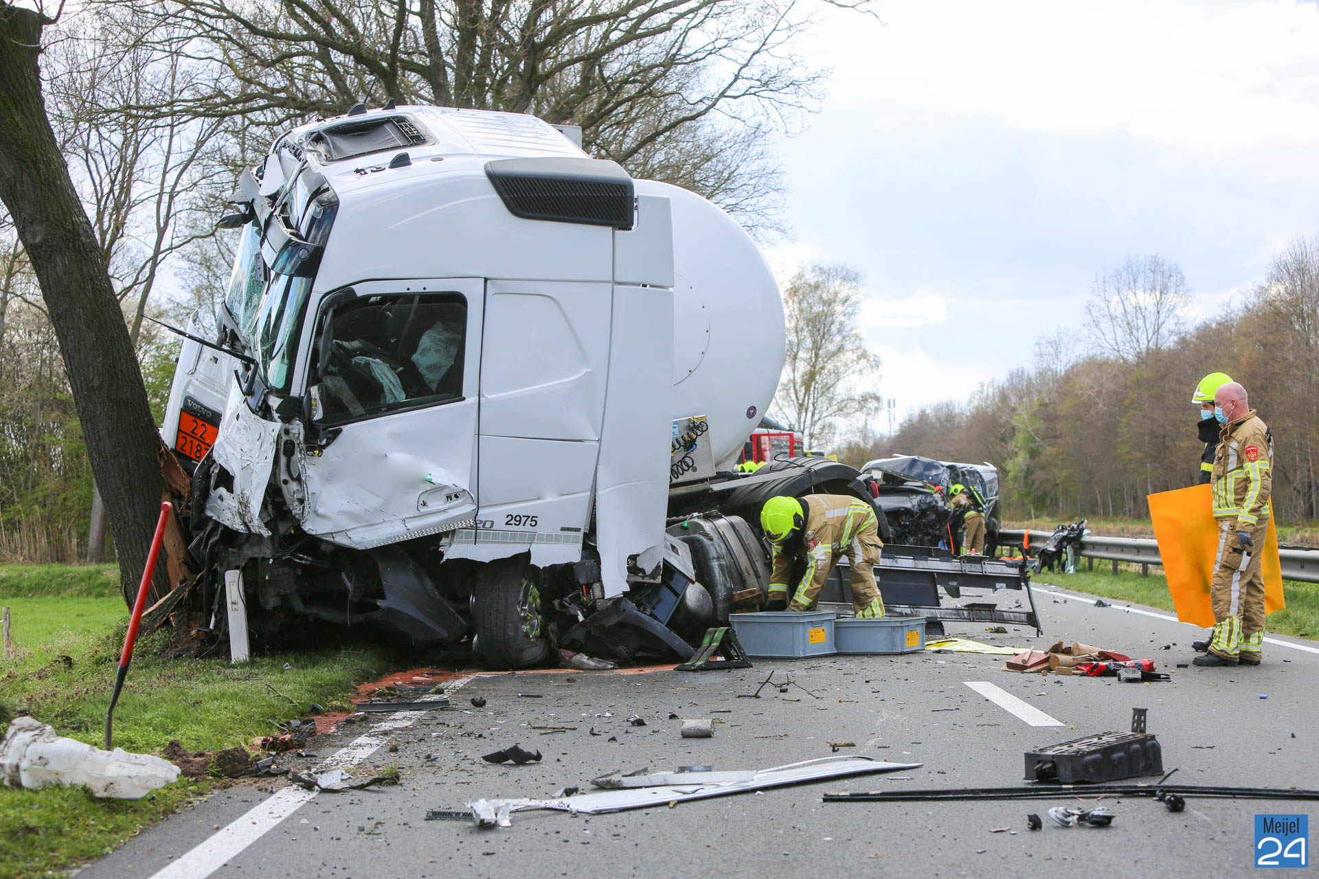 Een busje en een vrachtwagen kwamen dinsdagmiddag hard met elkaar in botsing op de Kanaaldijk N275 in Meijel. De vrachtwagen kwam vervolgens hard tegen een boom tot stilstand. Beide voertuigen raakten ernstig beschadigd.
