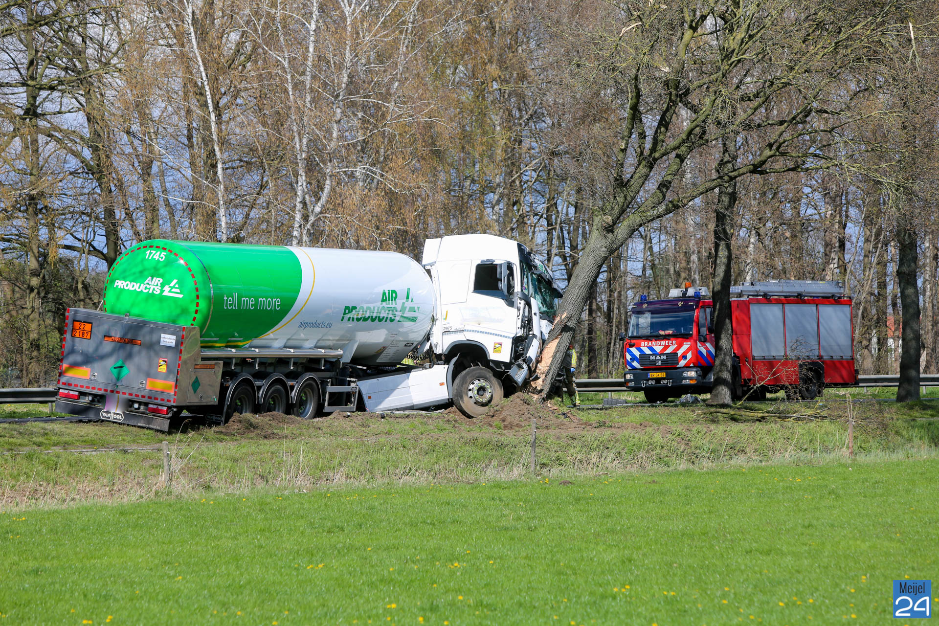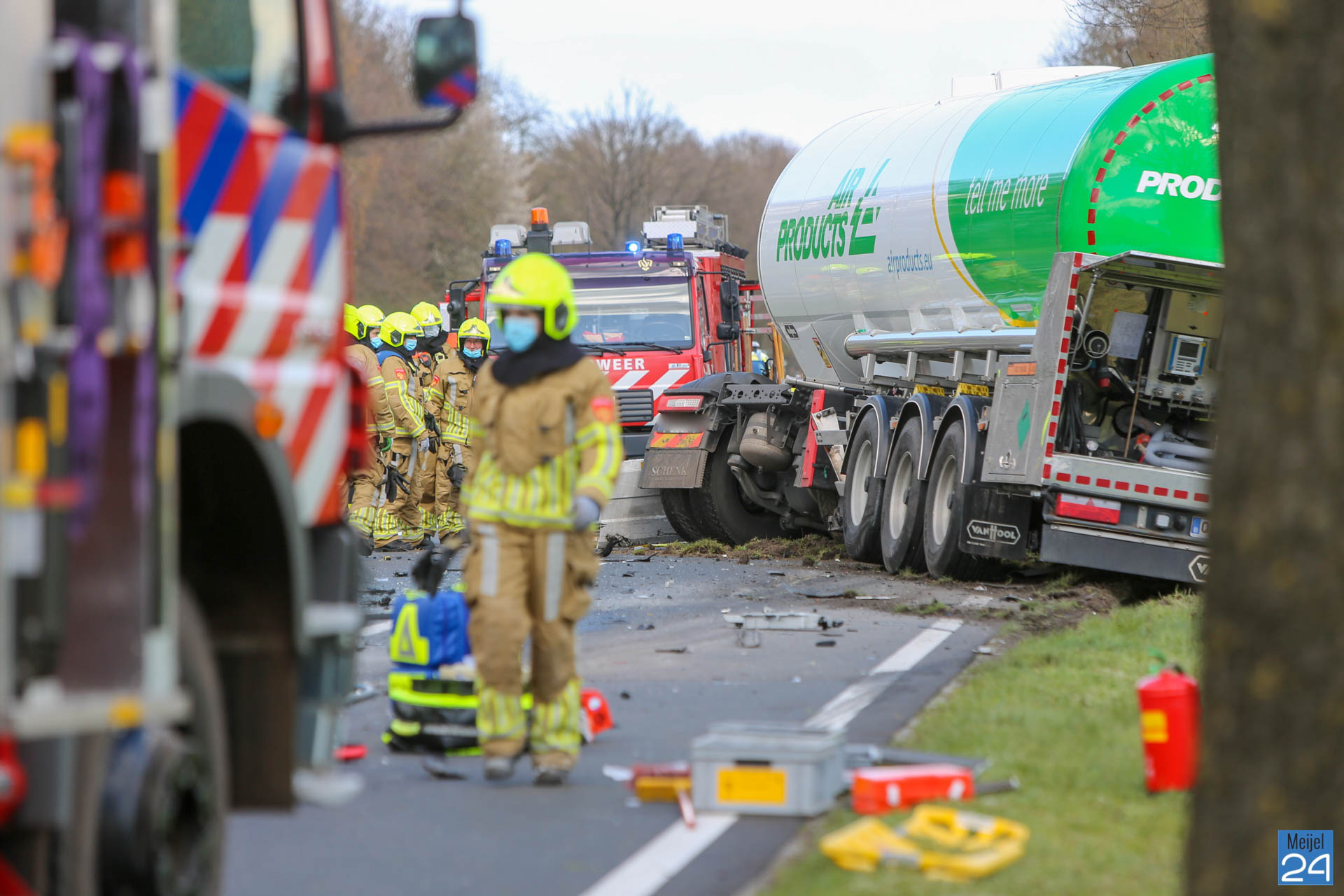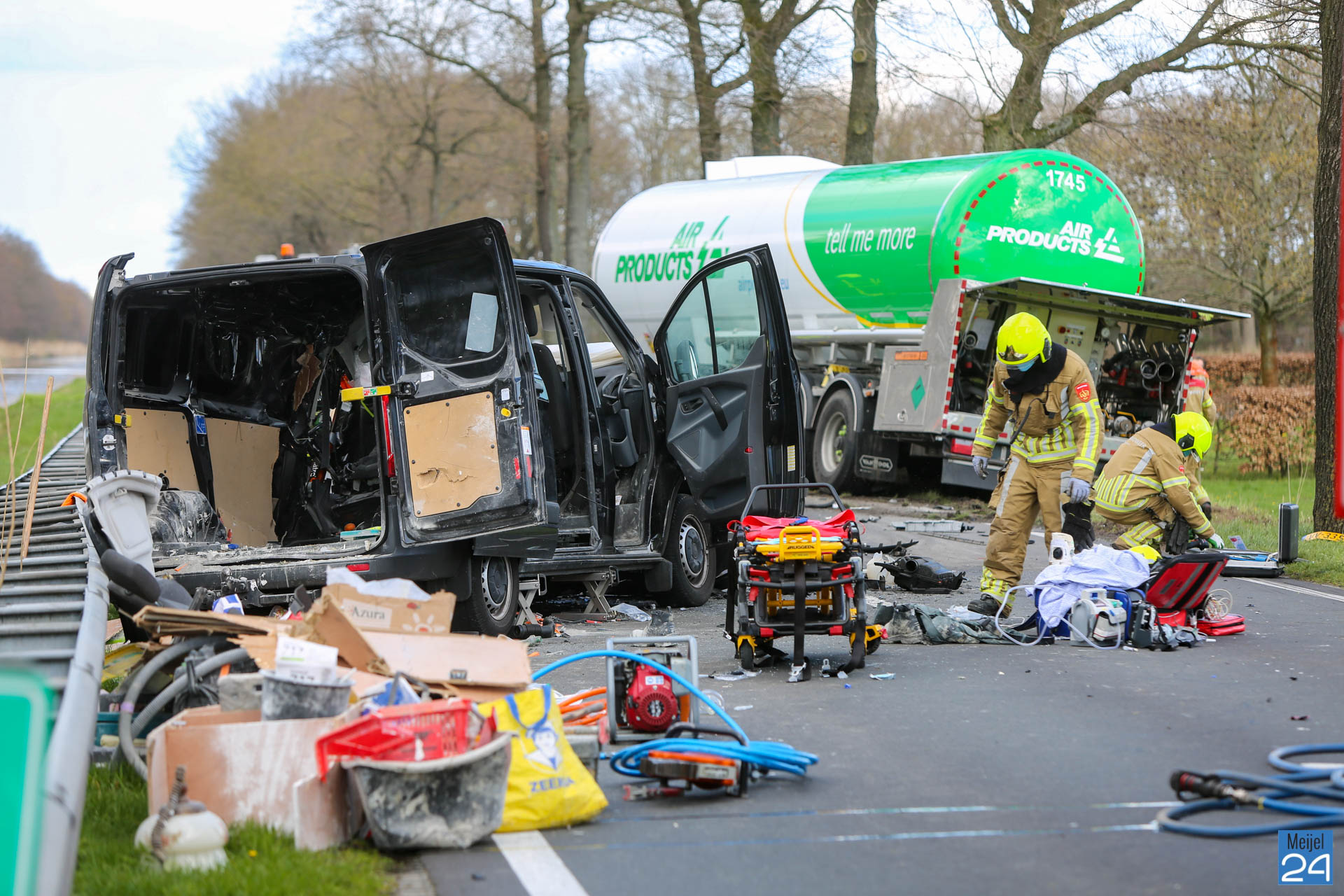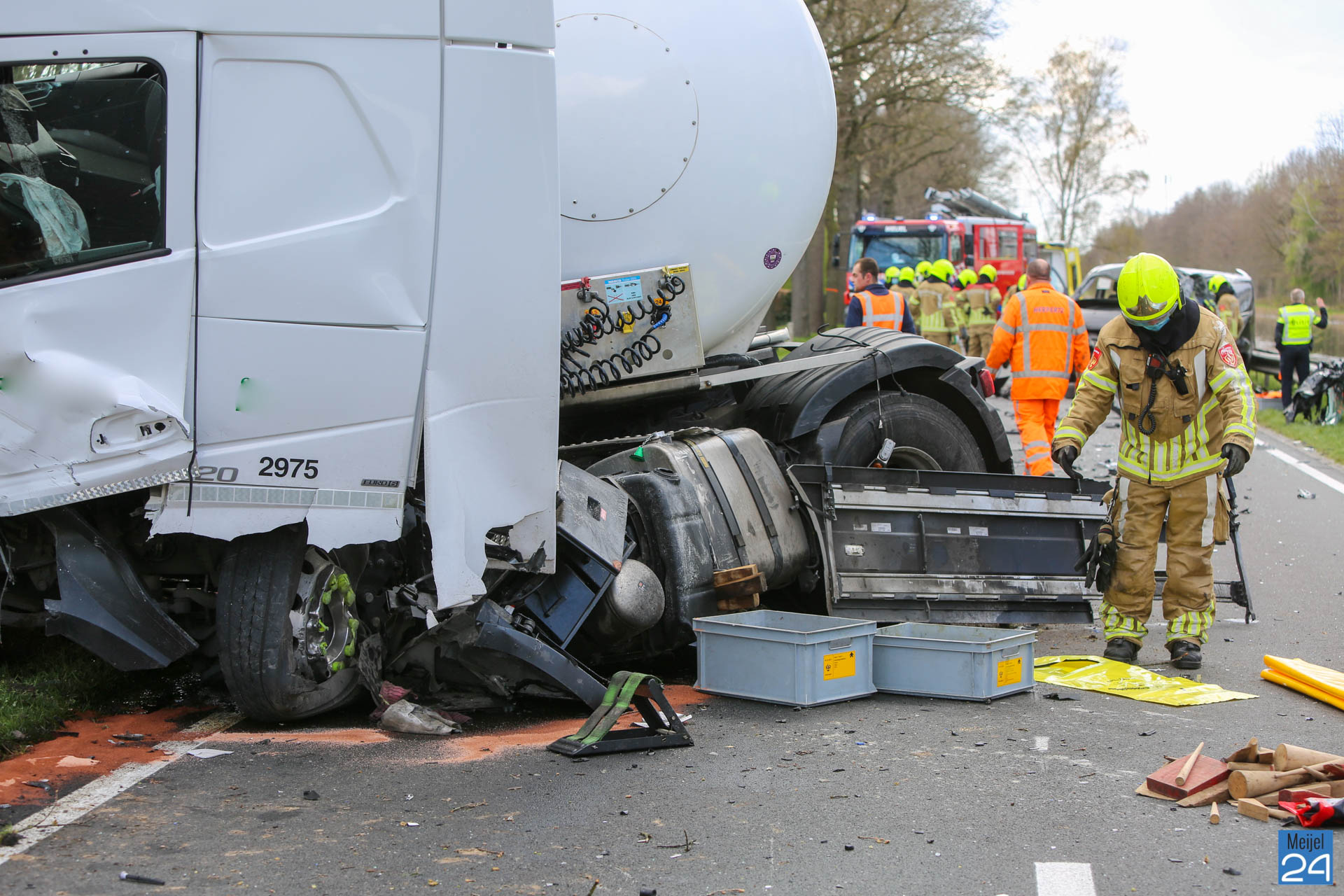 Een busje en een vrachtwagen kwamen dinsdagmiddag hard met elkaar in botsing op de Kanaaldijk N275 in Meijel. De vrachtwagen kwam vervolgens hard tegen een boom tot stilstand. Beide voertuigen raakten ernstig beschadigd.
