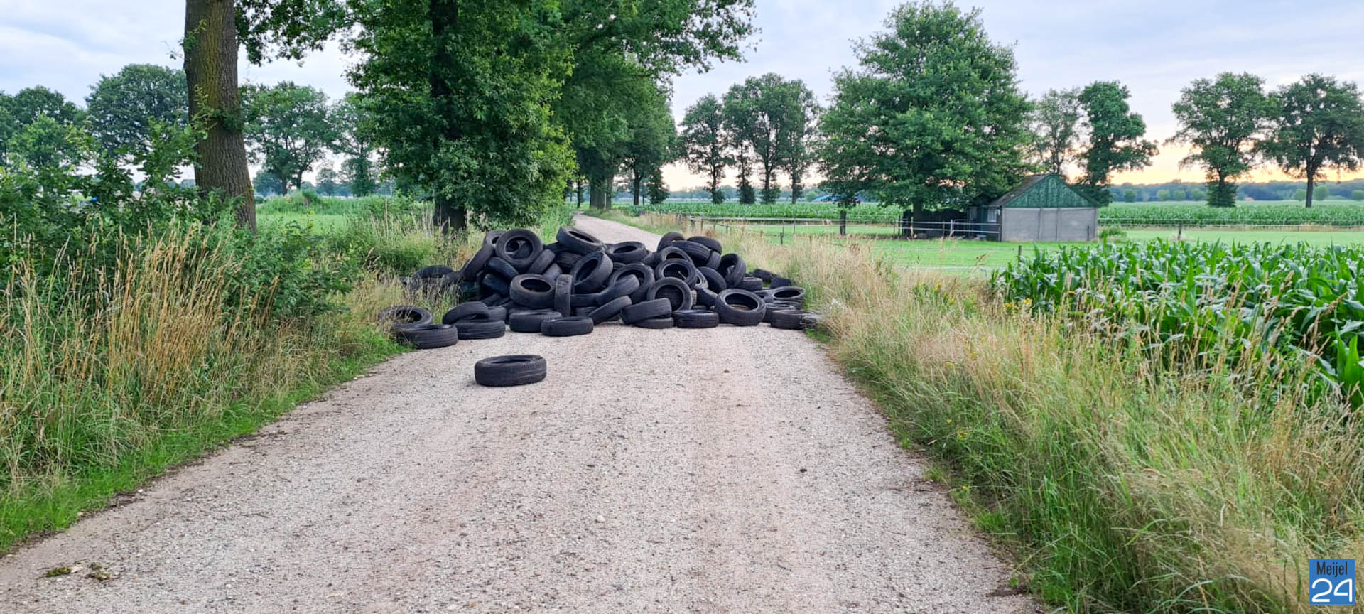 Woensdagmorgen is er een grote hoeveelheid autobanden aangetroffen op een zandpad aan de Steenkampseweg in Meijel.