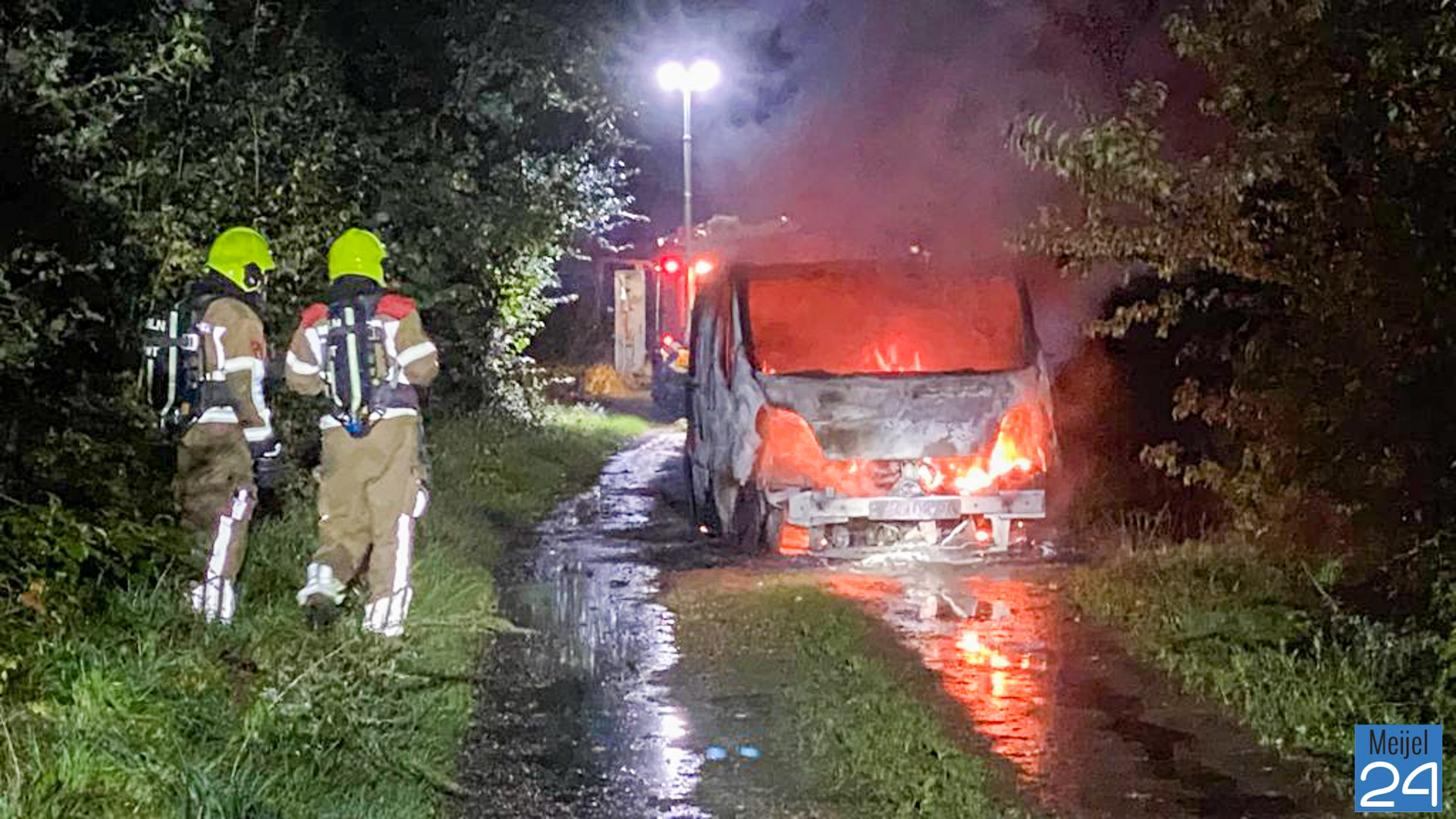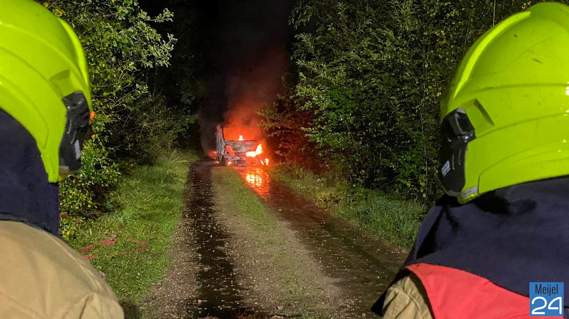 Zondagavond is er een brandende bestelbus aangetroffen in een bosgebied in de buurt van de Gesselseweg in Heibloem.
