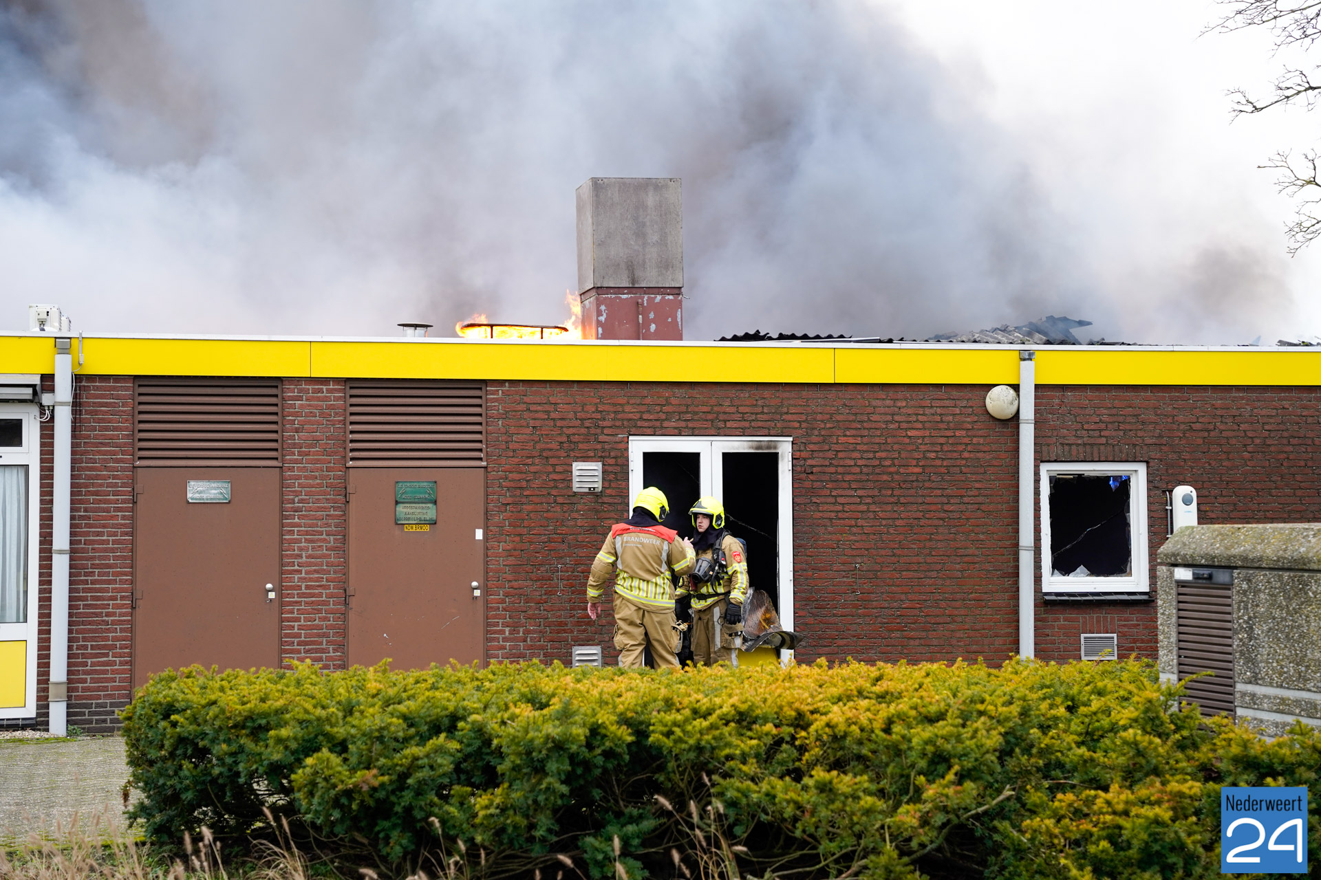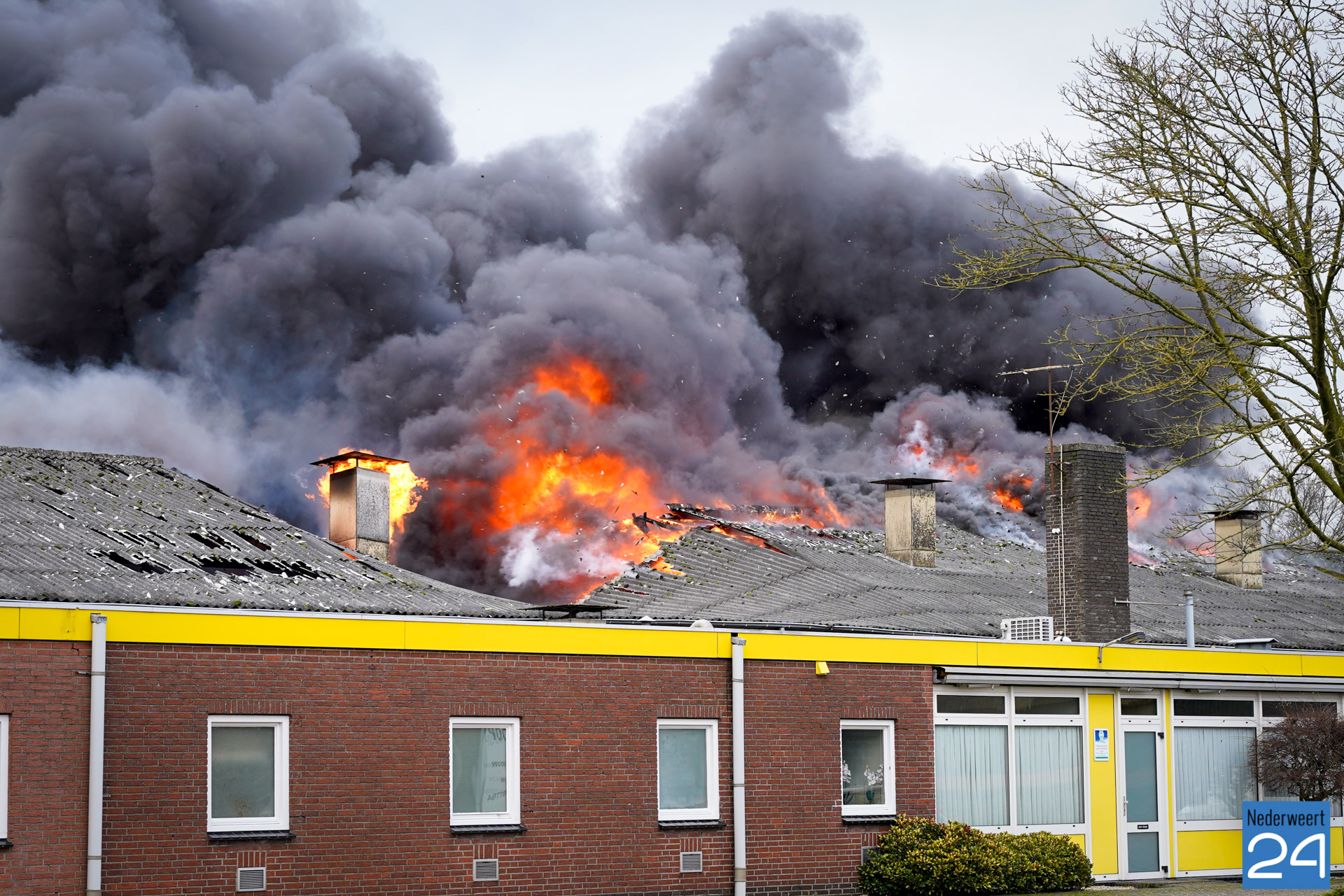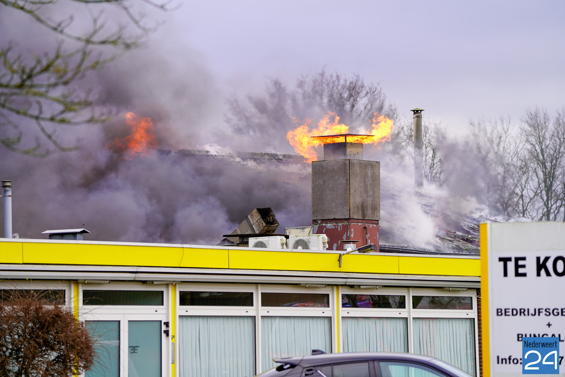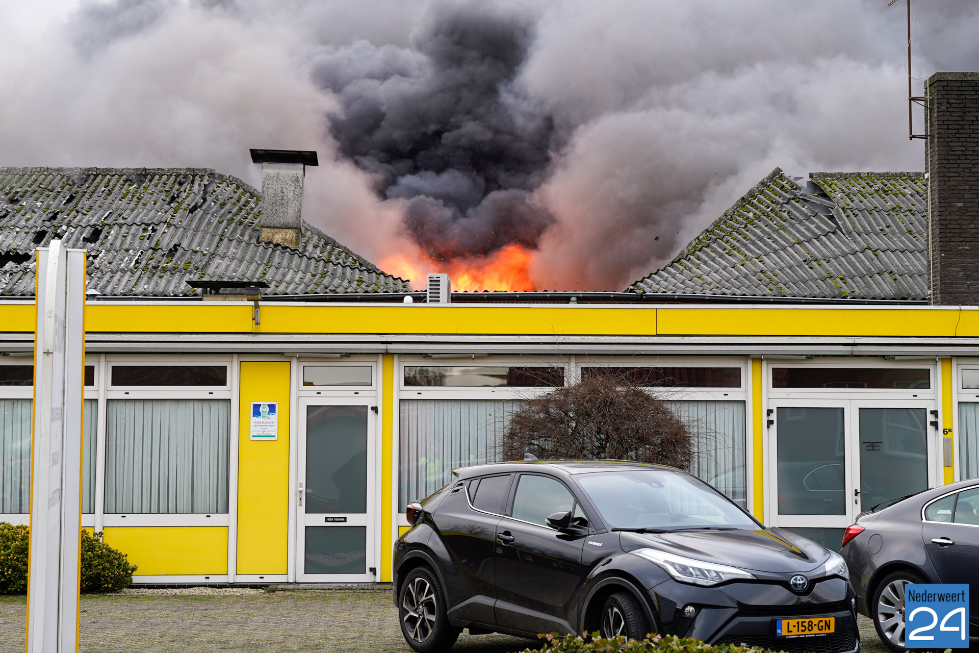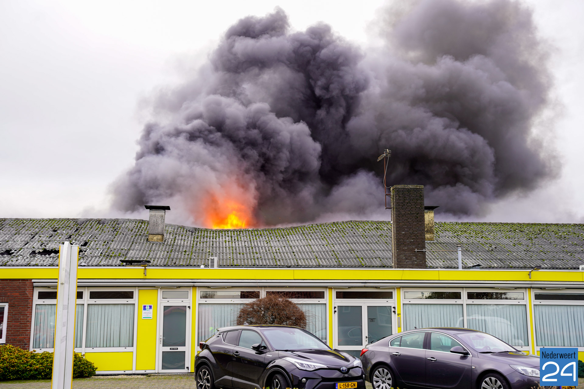 De brandweer schaalde direct op naar ‘middel’ brand en een paar minuten later naar ‘grote’ brand en ‘zeer grote’ brand. Meerdere voertuigen zijn ingezet om het vuur te bestrijden.